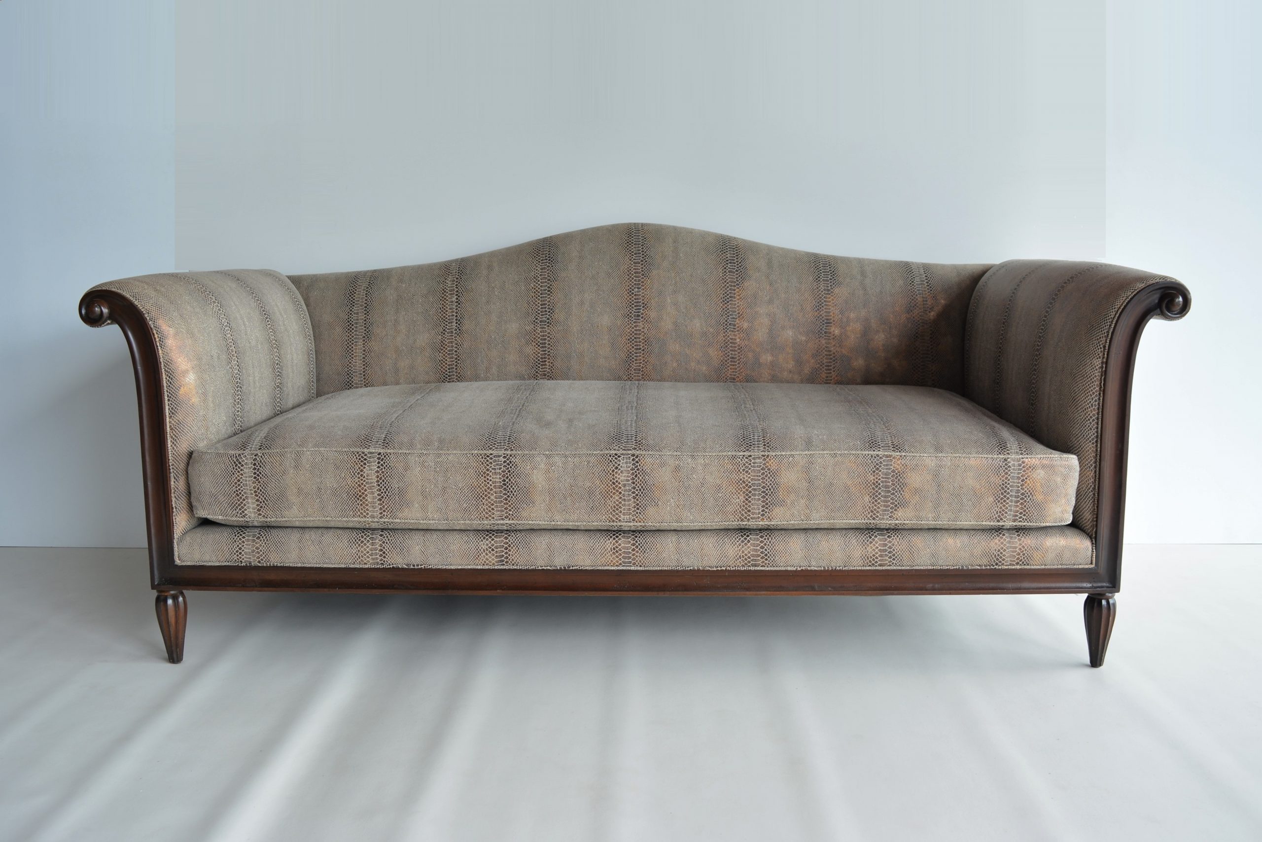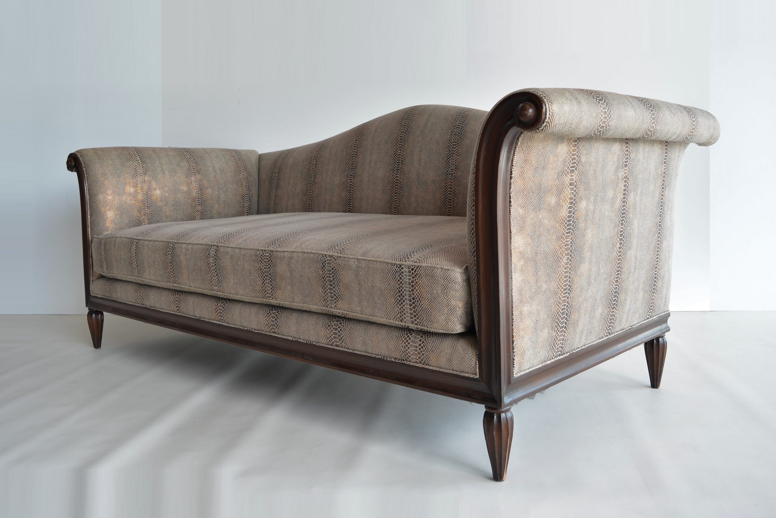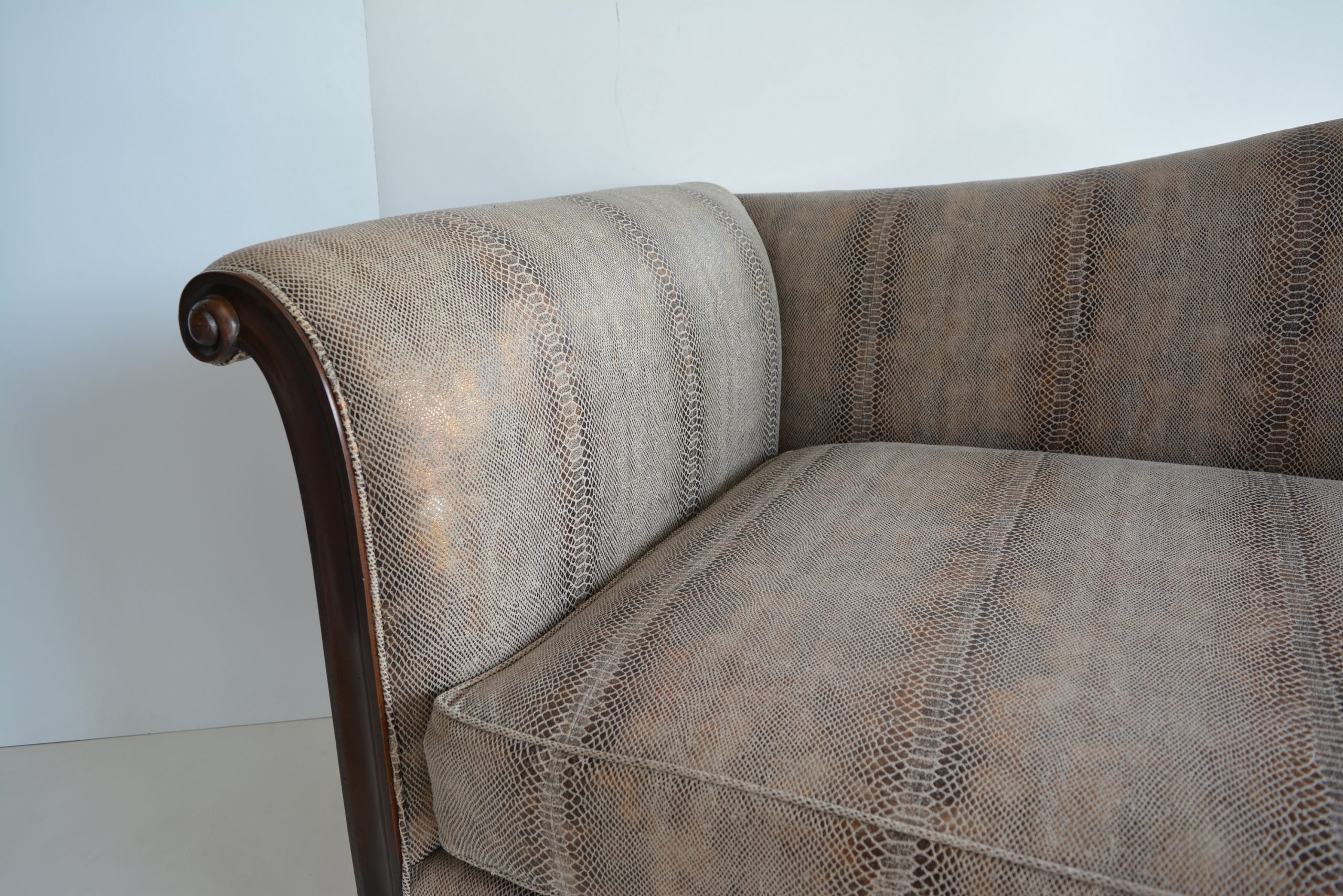 This piece has an incredible eye for detail- it’s shaped and carved from HARDWOOD (for durability- cheaper pieces almost feel like balsa-wood). The full-frame is constructed from hardwood. The seat cushion is a mixture of microfibre (for support) and feathers (for luxurious softness and comfort). This mix in cushioning is used by many of the world’s top luxury brands including B & B Italia and Australia’s own Arthur G. This Spanish upholstery by Lizzo is stunning- the quality and luxury is obvious after just one glance.