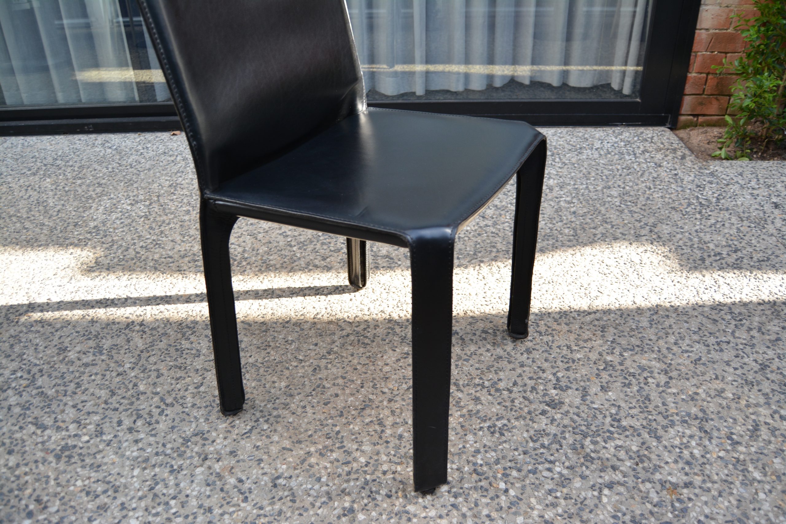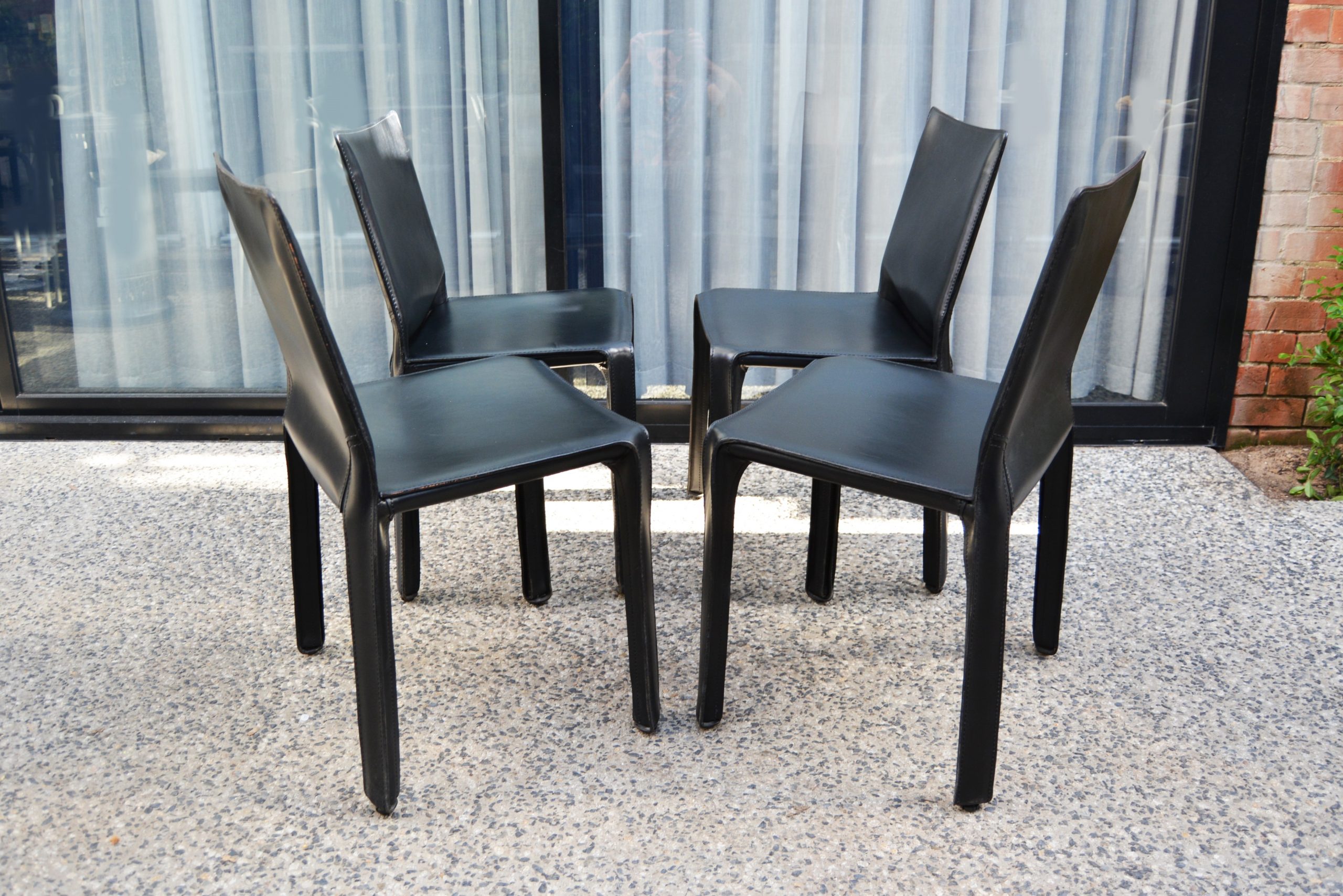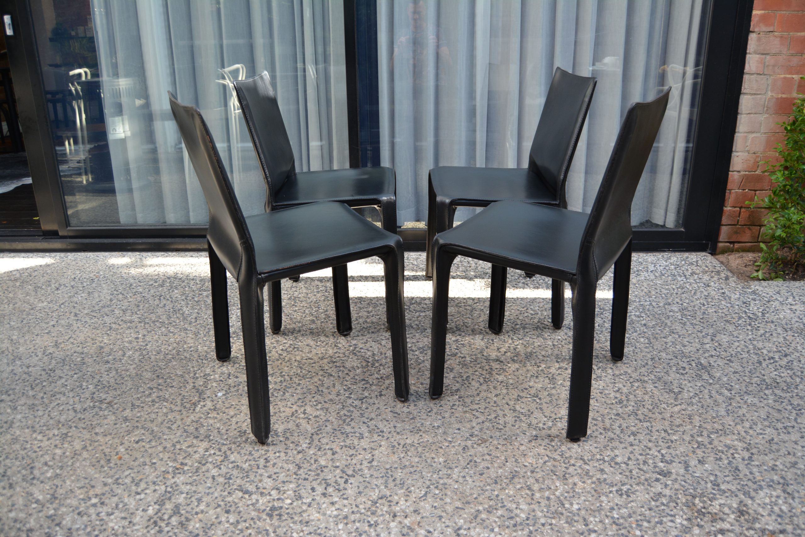 The 4 Cassina Cab chairs on offer here have been photographed in front of a sliding-glass door in an outdoor area. The others (shown on a white background) are display photos of Cassina Cab chairs previously sold through iNVISeDGE.