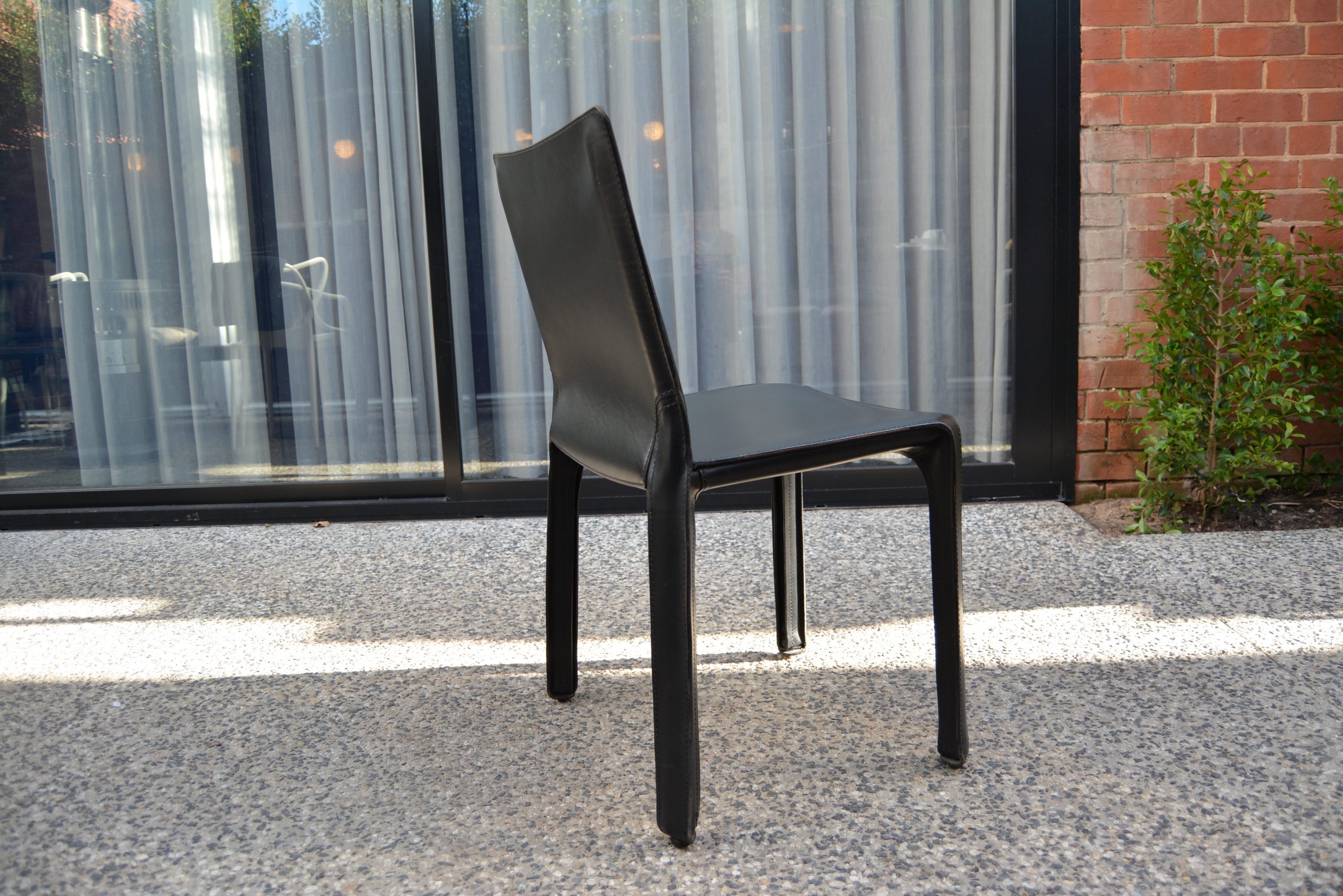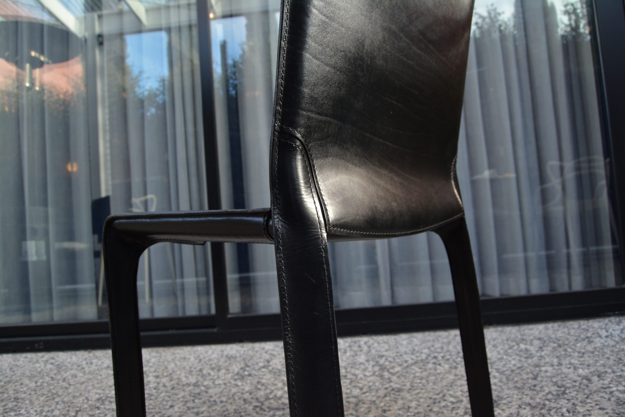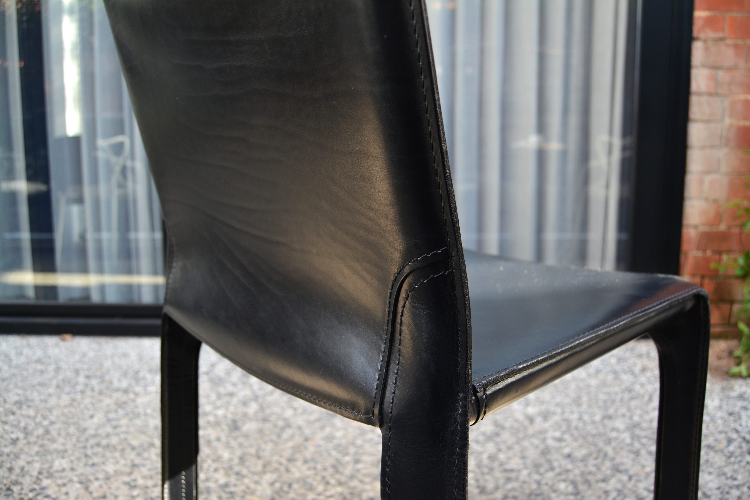 The 4 Cassina Cab chairs on offer here have been photographed in front of a sliding-glass door in an outdoor area. The others (shown on a white background) are display photos of Cassina Cab chairs previously sold through iNVISeDGE.
