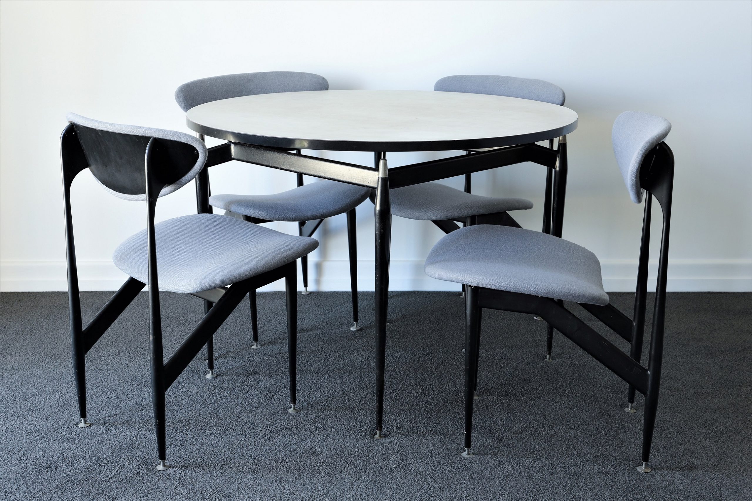These chairs are in brilliant condition for chairs that have been used for 60-odd years. Structurally they are all solid and sturdy. There are NO old repairs, NO breakage and NO cracks around any joint. They have been made to last generations. The metal is heavy (excuse the cringe-worthy pun!)- they’re very solid chairs. The frames have no noticeable dents but various small scuffs and marks to the finish (as shown in the close-up pics). These minor signs of use do NOT adversely affect the value (or look) of this suite and in fact enhance the investment appeal and vintage character. (These signs of use authenticate that this is a genuine vintage suite and not an re-issue from Gordon Mather Industries.) All the original foot stoppers are in place which is brilliant because if they're not you're likely need to need something specifically engineered to fit on the bottom of the leg. Re-upholstery is not an option with these chairs. They were purchased from a reputable Melbourne vintage furniture dealer in 2017- the re-upholstery was organised by this dealer. The suite has basically been only used as a display suite since then. My vendor loves the design and has travelled a lot internationally for work so has rarely been at home- he catches up with friends out, not at home- this suite has very rarely been used since the chairs were re-upholstered. ________________________________________________________________________________________________________________________________________________________________________ ____________________________________________________________________________________ The table has minor signs of use and a couple of very small rusts mark in the original laminate (from a metal ornament being placed in the centre of the table.) The table top also has some very feint shadow marks from use over the last 60 or so years but nothing that ruins the look of the suite. 1 or 2 of the screws on the backs of each chair is missing. This is normal with vintage Scape chairs. The backs of the chairs are secure without all the screws (I've seen this many times before with vintage Scape chairs- not all the screws are needed.) One of the chair backs is a little loose but still secure. The vendor attempted to tighten the screws on that chair but to no avail as it seems some of the screw threads have "lost their grab" over time. I'd say you'd be able to try some of the screws in different holes as there are a few points to secure the backs onto the upright posts. ________________________________________________________________________________________________________________________________________________________________________ The last set of Scape chairs iNVISeDGE had measured ... 48cm across by 58cm back. Total height- 79cm. Seat height- 46.5cm. This suite is being sold from my client's location in Melbourne City. Interstate freight is available.