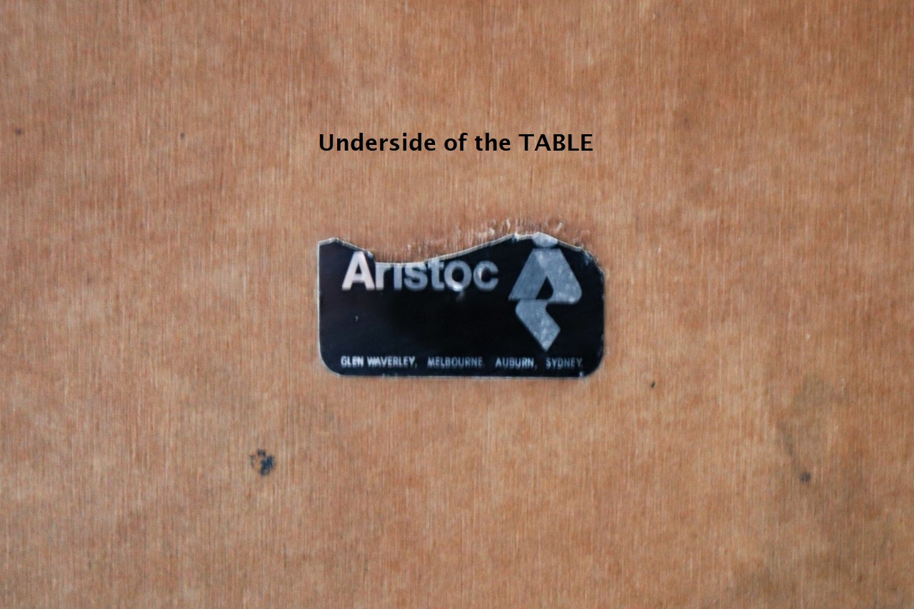 Offers over $2,800 for the full suite (for the Aristoc Scape table AND 4 chairs) will take precedence over offers for only the 4 chairs. Our seller loves his suite and is forced to sell because he’s moving to Europe for work- he doesn’t want to break up this suite. I don’t want to break it up either. The Aristoc badge may be under the black cover under the chairs- we don’t want to unpick the upholstery to find out. These are certainly VINTAGE Scape chairs- even without my vendor’s commentary I am 100% convinced just from the photos. The matching table RETAINS the vintage Aristoc label. (Read the Condition section for further information.)