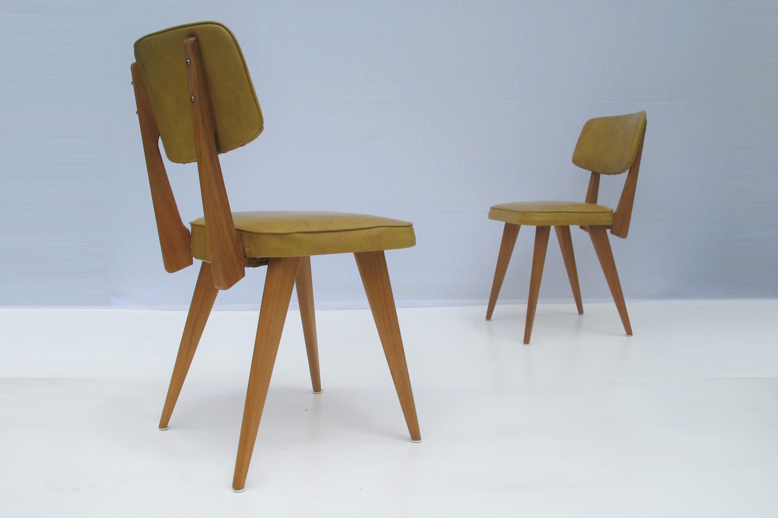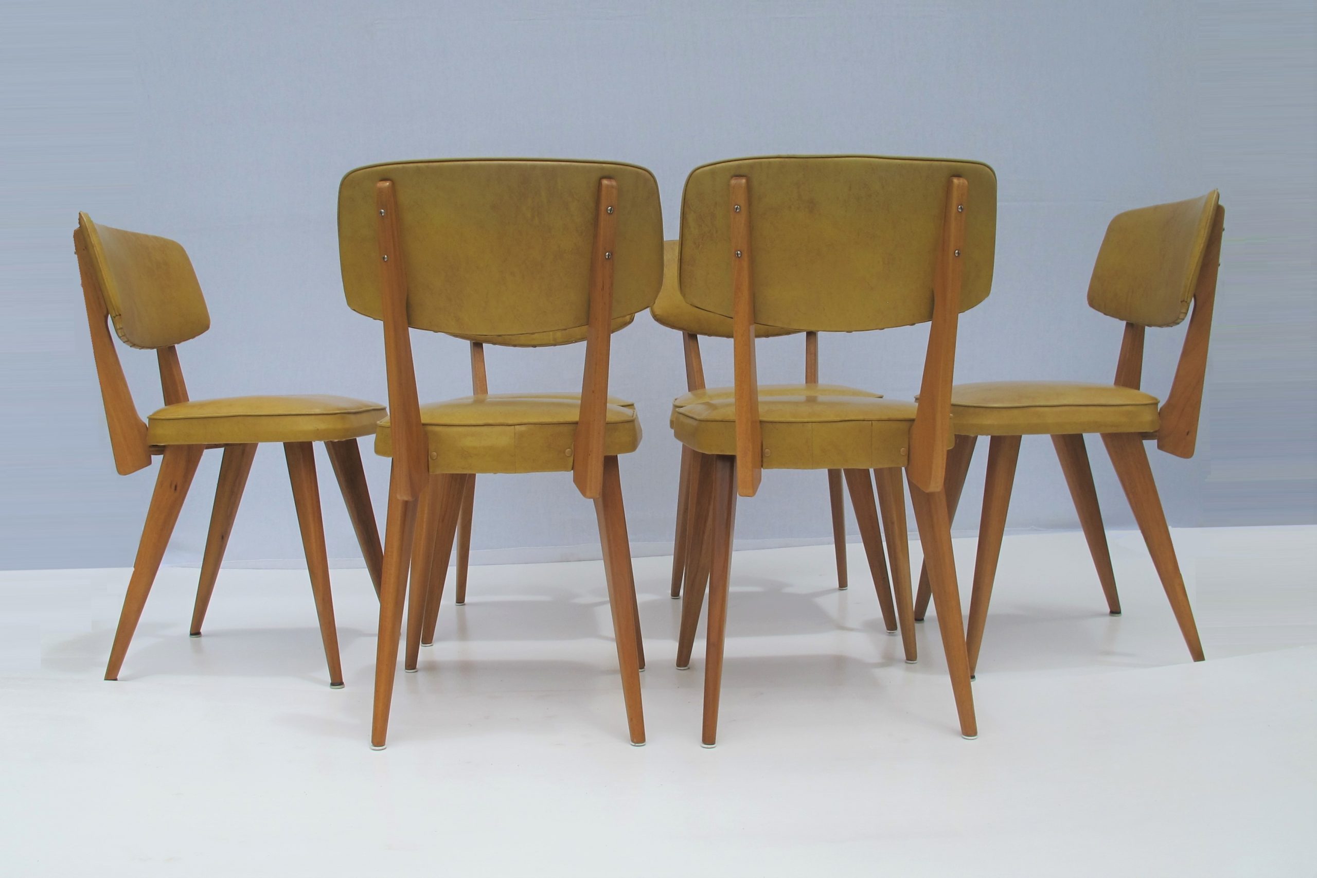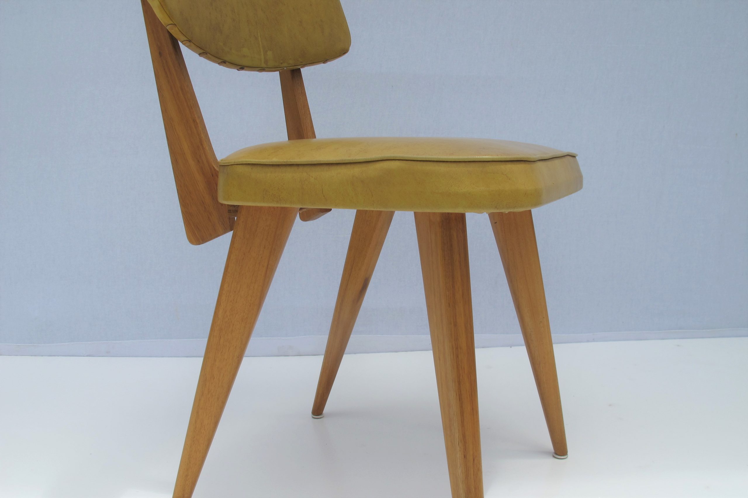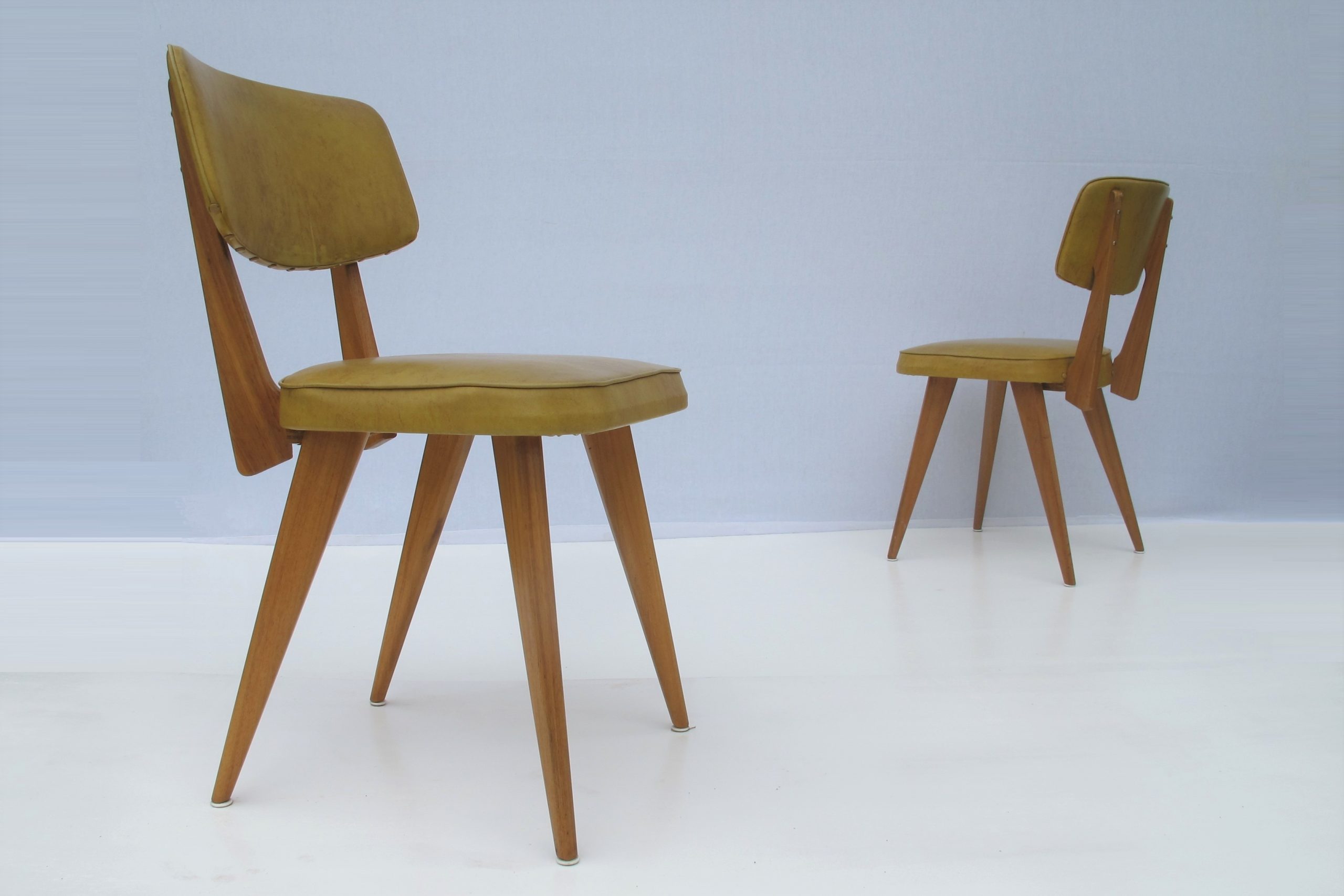 A set of SIX 1950’s designer dining chairs. These are RARE- I am uncertain of the maker and designer but they are way-cool. They’re 1950’s and may have been done by a small furniture-maker of the era. The construction and design is brilliant- a cut above Douglas Snelling’s work and pretty much every vintage dining chair I’ve come across. The legs are all set at an angle. This is not easy to accomplish but it’s what makes the angular lines so striking. These chairs are intriguing- they draw you in immediately. Setting the legs at an angle also means the maker had to completely change the construction of a dining chair. As a result each leg is well supported from every side and after 60 years of use they are all still sturdy, solid chairs. The back section and each back leg are two separate entities. This is virtually never seen. Normally the joint at the back between the back legs and back has a decent amount of stress put on it but this doesn’t happen with this chair. With normal use these chairs should last several lifetimes. The inner foam is latex- latex cushioning was only used in the highest quality furniture. These were high-end chairs in their day and they would still compete with the high-end offerings of today.