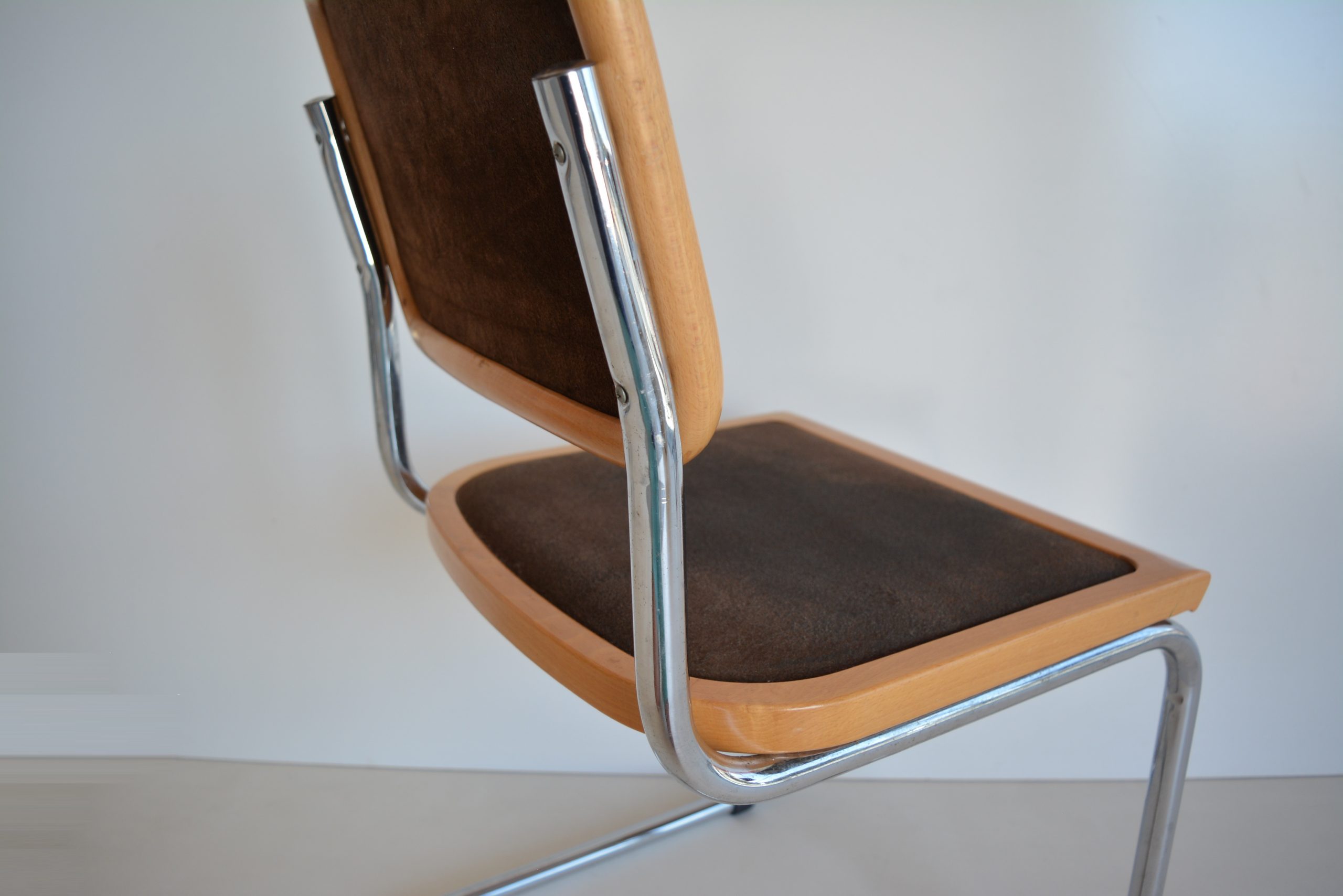 These chairs tick every box- stylish looks, DURABILITY, quality construction, great comfort and strong investment appeal. Most Cesca chairs are done with cane inserts. I like the look of the cane but this is not practical for many households- you always see the cane ones with holes in them. The expense and inconvenience of having to get the cane re-done is a disadvantage with those ones. These chairs are done in Ultrasuede. This allows padding under the upholstery for extra comfort but it’s also the more durable choice. This is the original covering and apart from some patchiness in the colour, the fabric presents extremely well for dining chairs that are almost 50 years old.