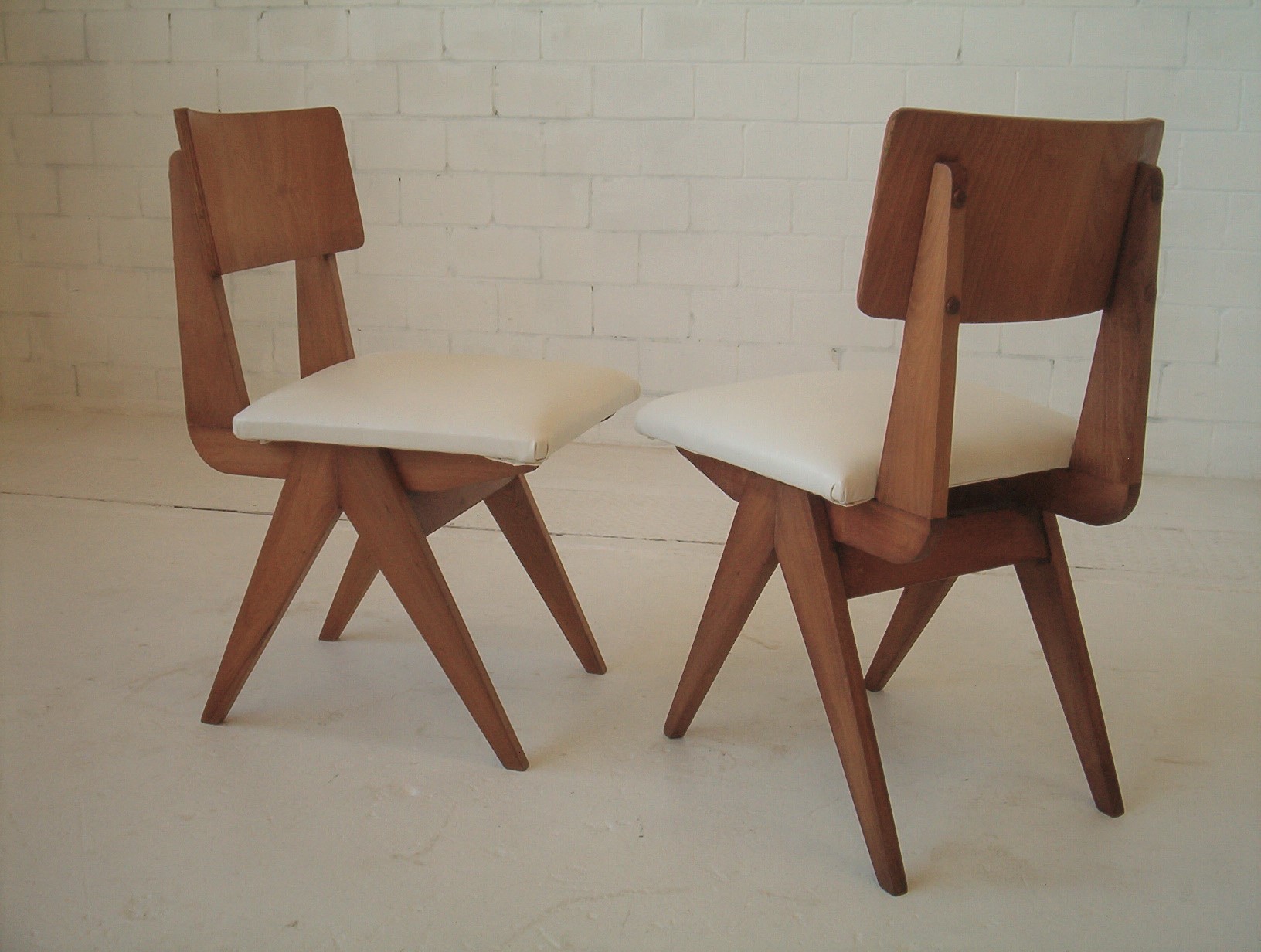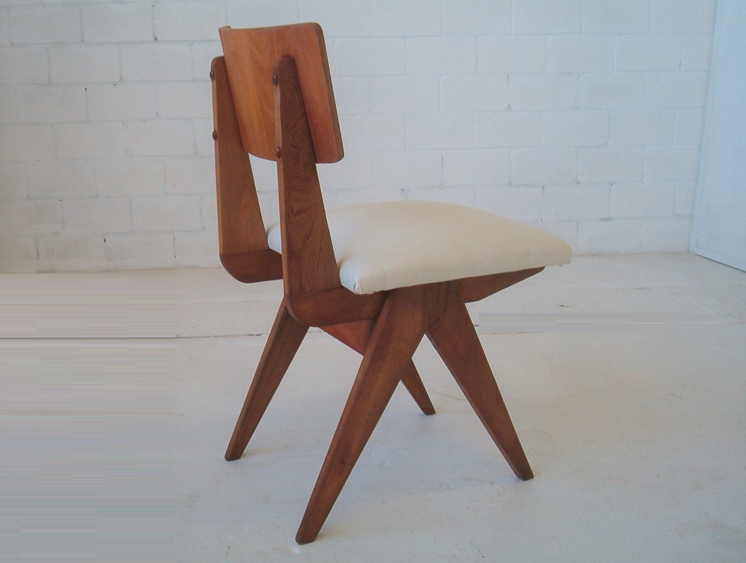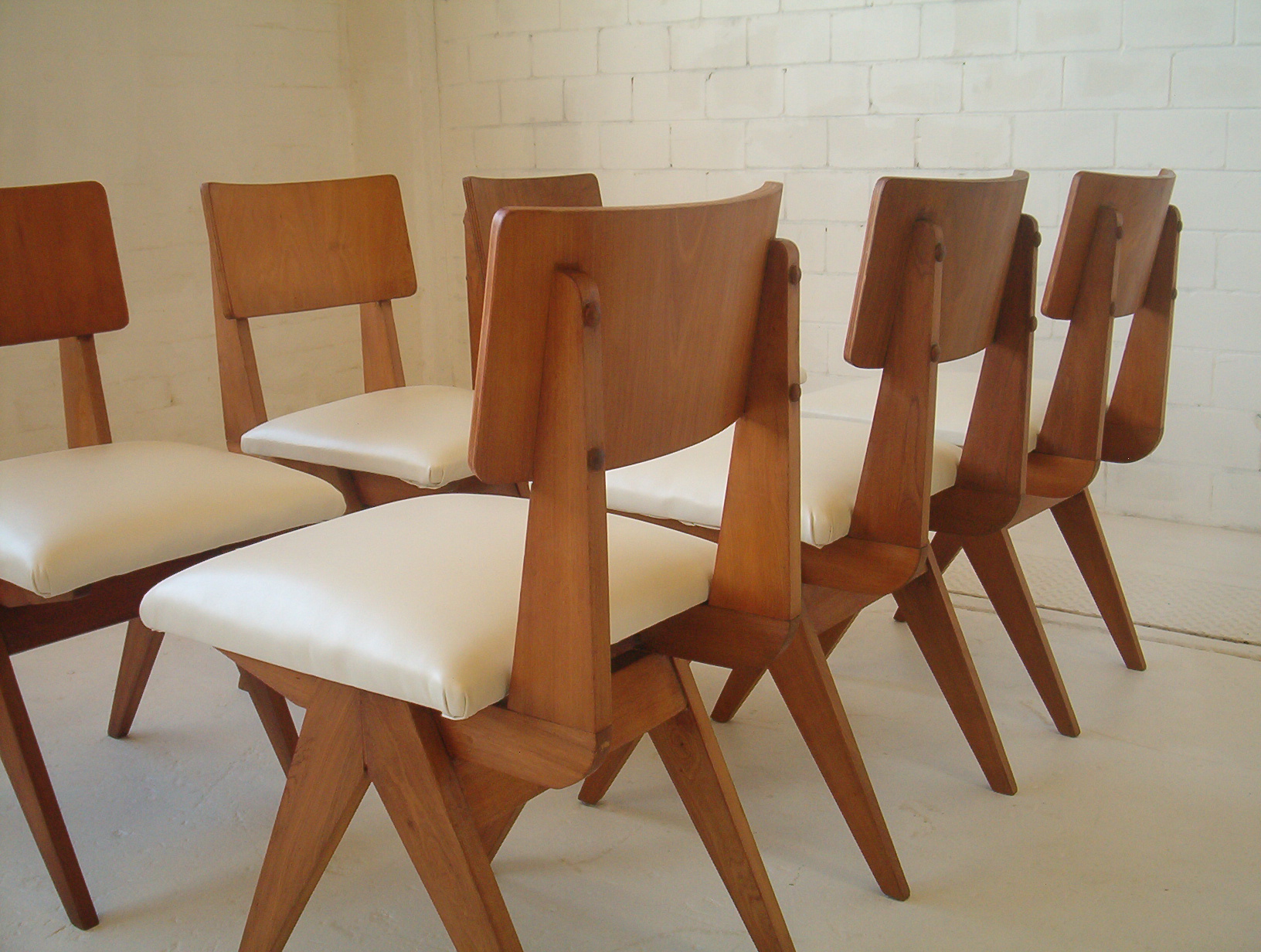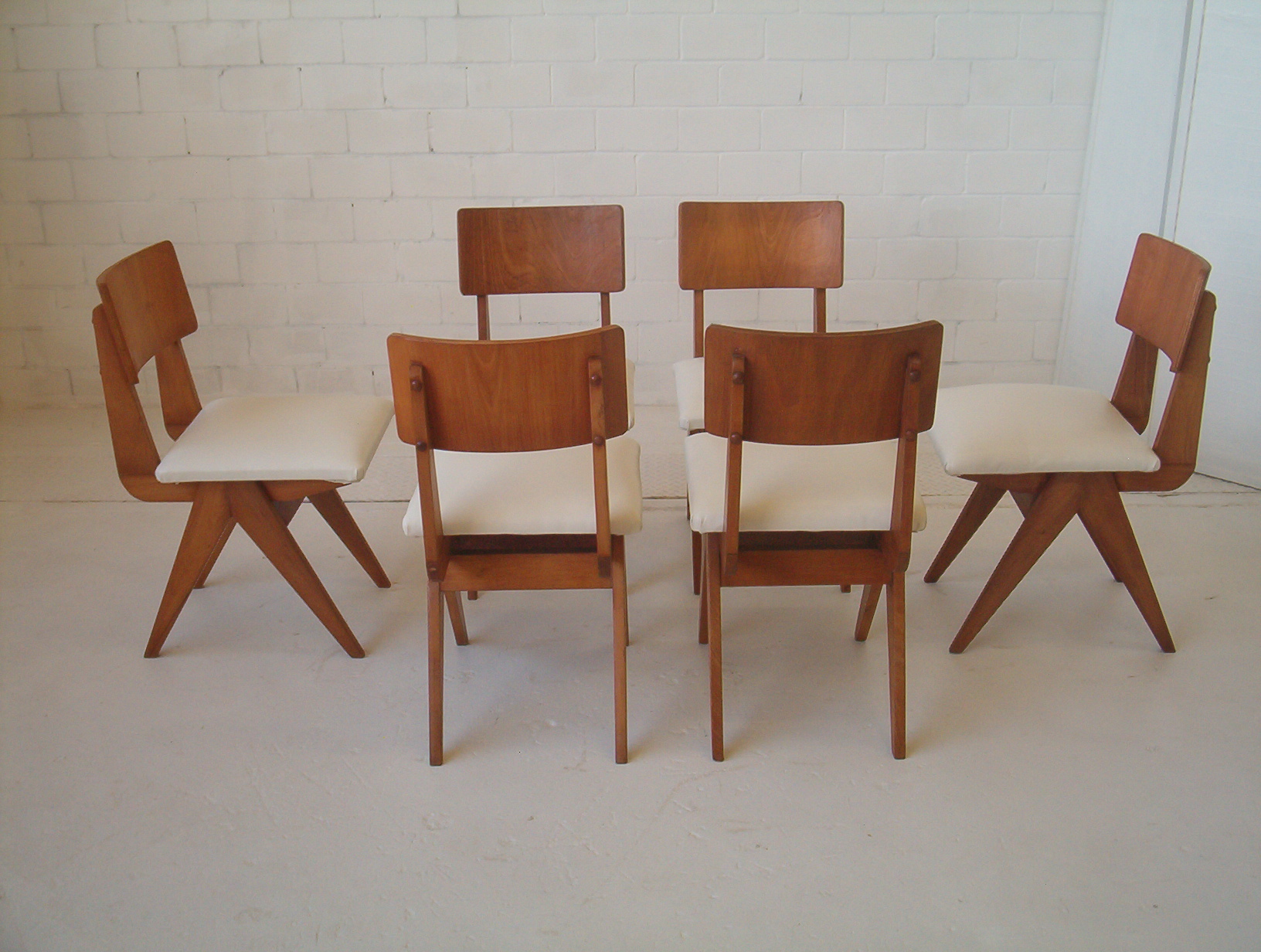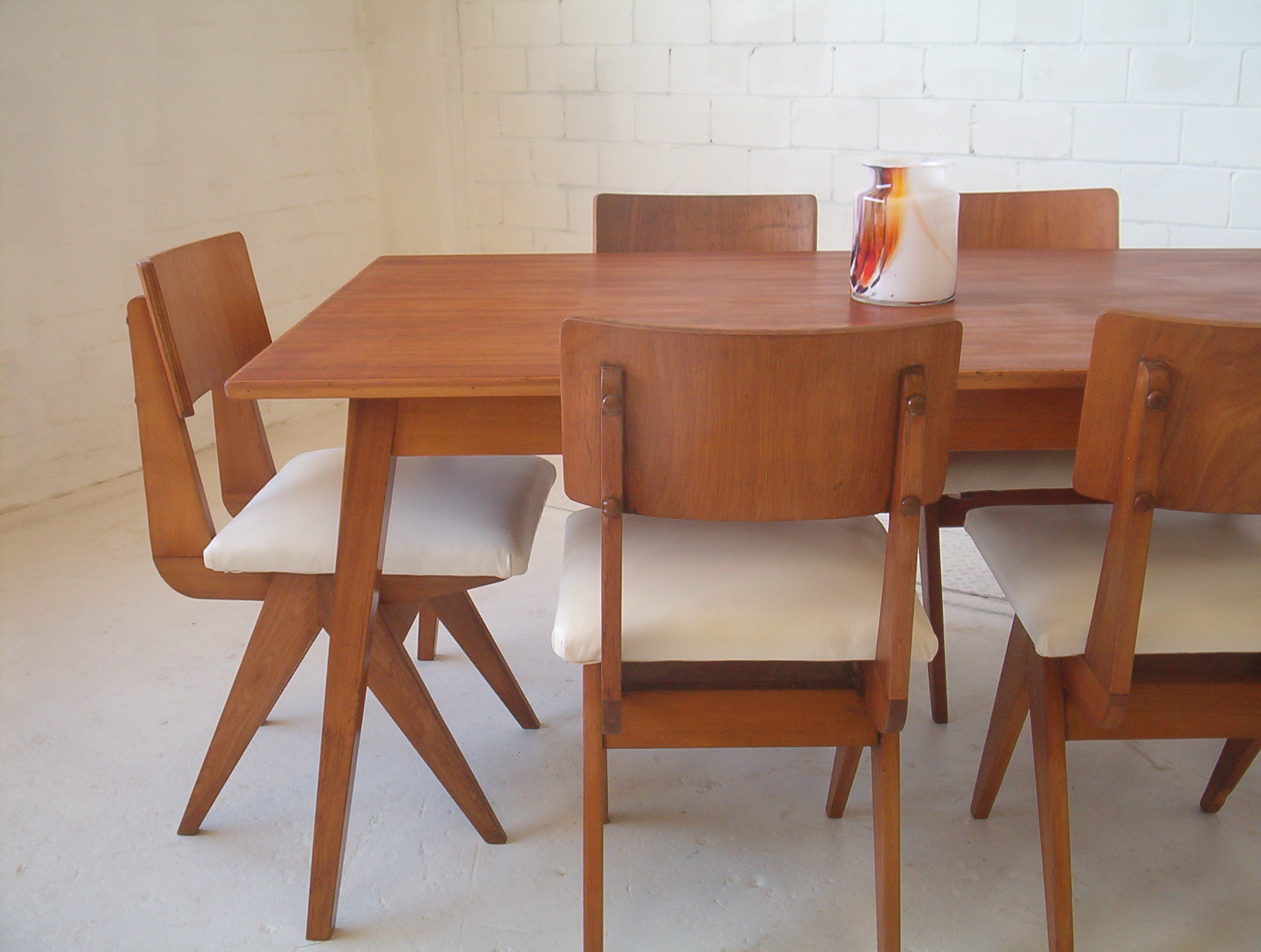 Written in 2007. This is possibly the most stunning dining suite we’ve had for some time. This set of six dining chairs has a classic 1950’s design that attracts attention. Designed by Hungarian-born architect, George Korody in the late 1940’s, this suite has very solid investment appeal. Korody was highly influential in furniture design circles in Australia in the 1950’s. He established Artes Studios which later evolved to become SPACE Furniture which is still in operation today. Korody’s designs are not often seen but are well worth watching because of his strong contribution to Australian design. These mid-century chairs will always have strong appeal- new timber dining chairs can fetch at least this but these have history and proven construction qualities. Obviously, they look sensational but are also very durable- just look at them after 50+ years of use! The frames are solid Coachwood and the backs are also solid timber, adding to the durability. I think their biggest draw-card is the uniqueness of the design- I have never seen this design in person before- love those scissor legs!