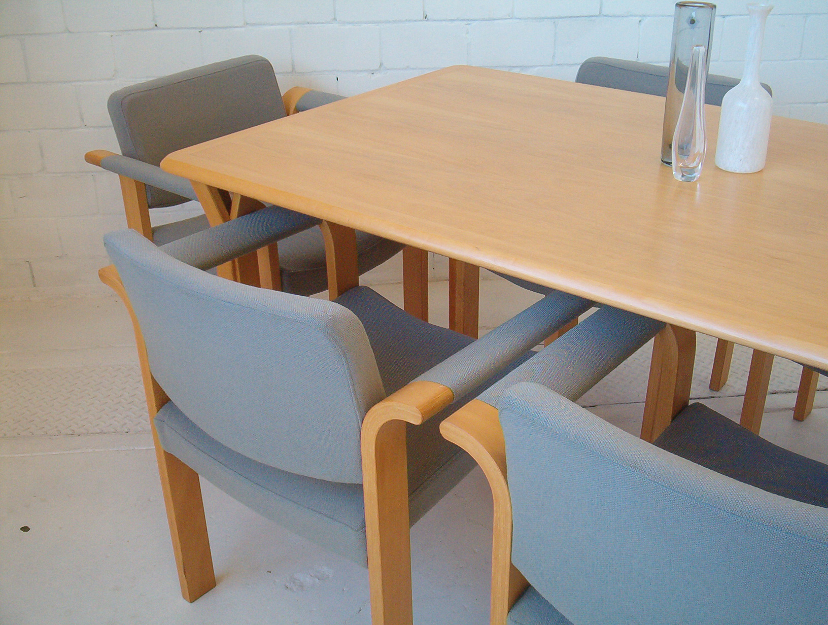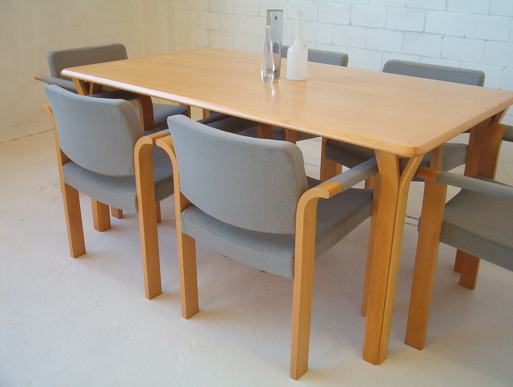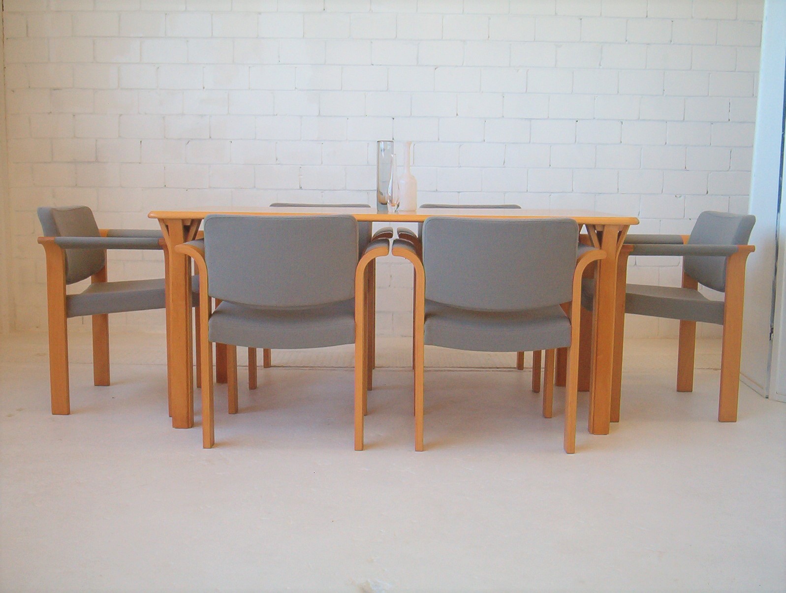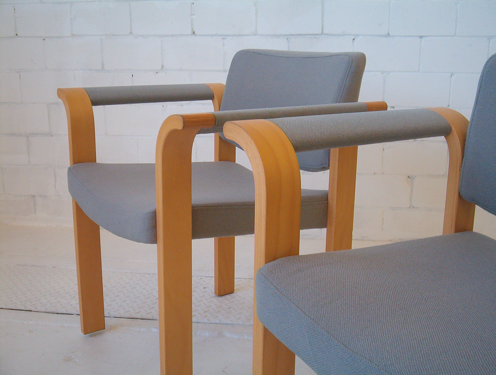 A stunning SET OF SIX Scandinavian dining chairs. These are AUTHENTIC Danish chairs WITH TAGS- Made In Denmark by Magnus Olesen. The striking arcs in the armrest section produce a unique and captivating design but it’s still understated at the same time. The design is minimalist and simple and would cap off a sleek stylish look in your dining space. The light coloured timber, coupled with the cool tone of the wool, gives these chairs a fresh, clean style that’s an unusual slant on the usual Danish chairs. Chairs in this style are not easy to produce and rarely seen. I’d say these chairs are about 20-30 years old. I’ve never seen anything like these in the 5 years I’ve been doing this and doubt I’ll see this design again … and I almost forgot to mention they’re are incredibly comfortable to sit in. For dining chairs you’d be VERY hard-pressed to find anything more relaxing. These Magnus Olesen chairs are certainly valued at much more than this price- don’t miss them!