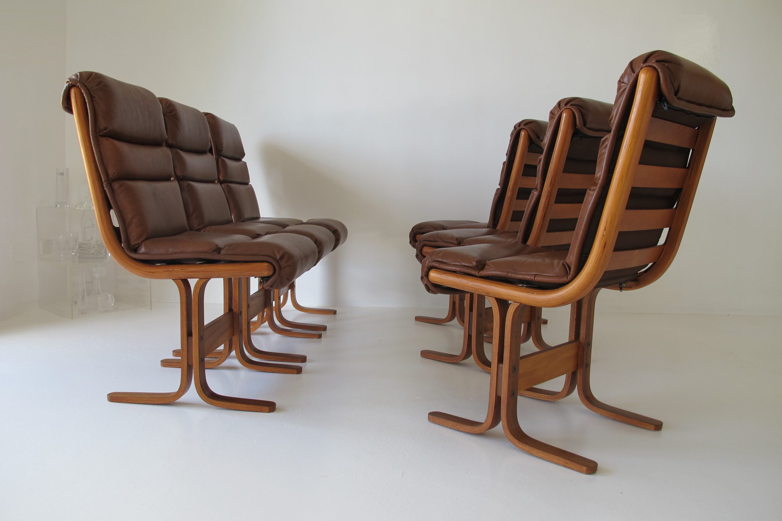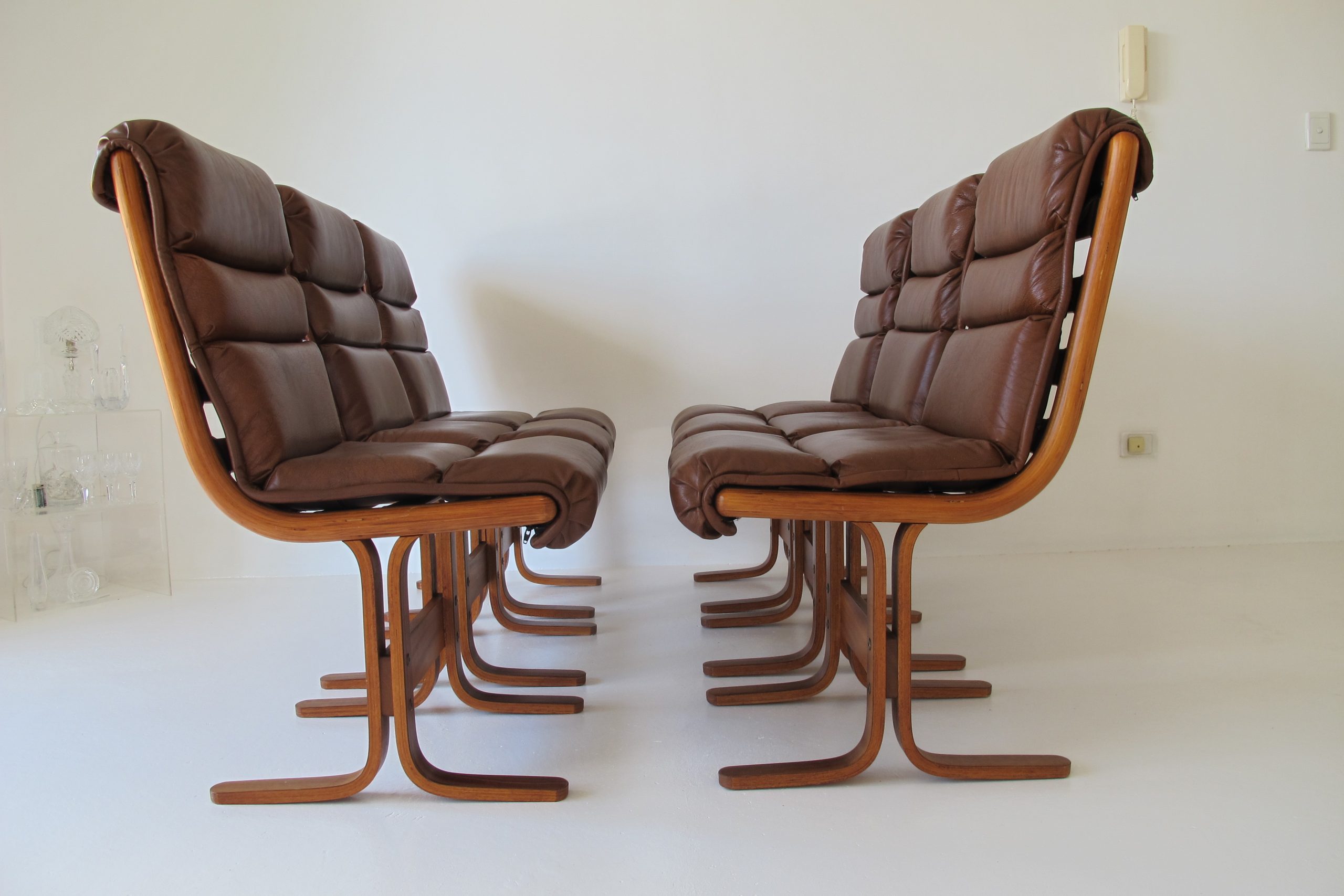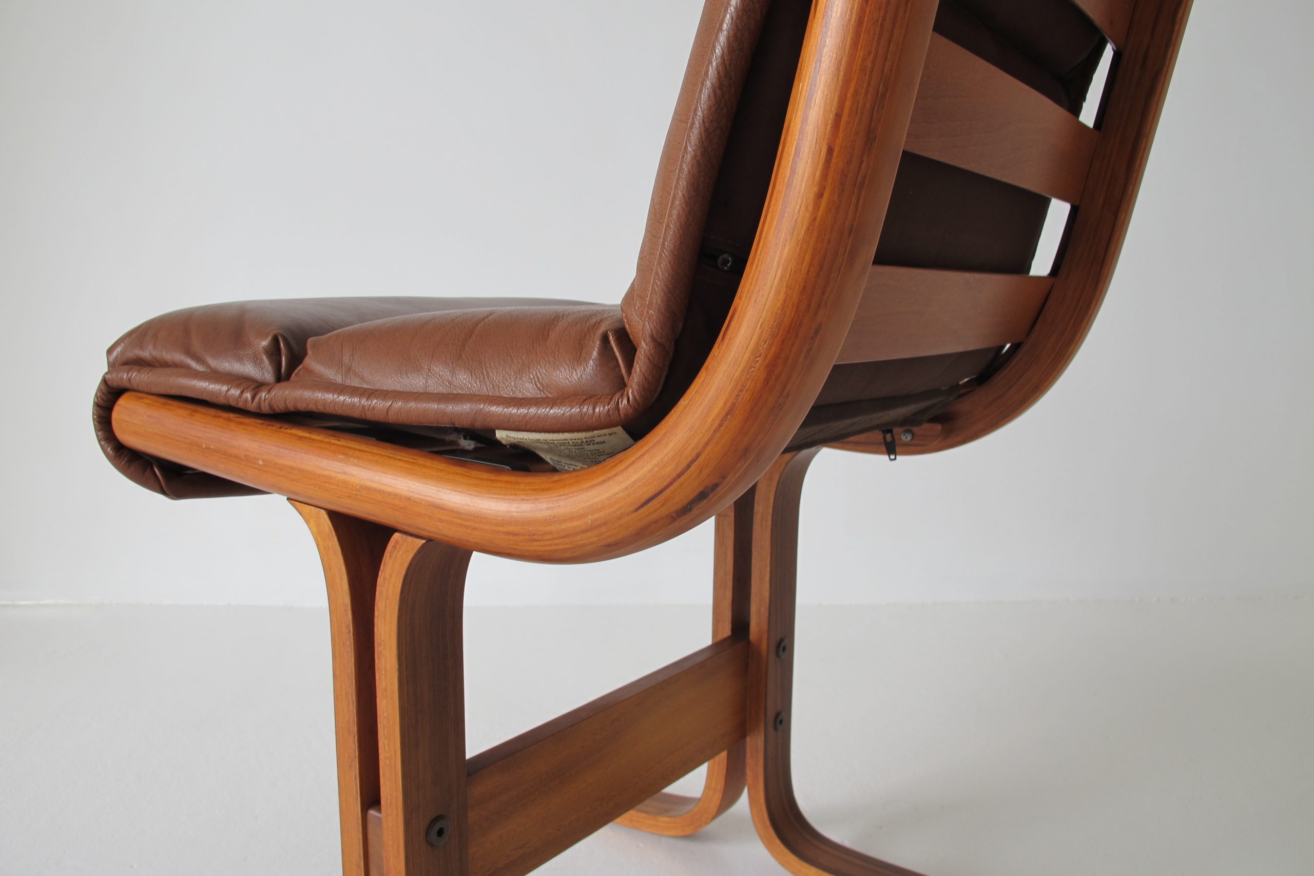 A set of 6 leather dining chairs made by Neil Grice Furniture of Brisbane in 1981. Neil Grice Furniture was some of the most exclusive furniture sold in Brisbane in the 70s and 80s and operated from their workshop in Milton. The best dining chairs of today fetch $1000 each- often a lot more. The construction quality is A1- the design is brilliant and they have a unique slant that’s Grice’s own. The leather is some of the best quality I’ve seen. It’s soft and luxurious after 30 years. A tag underneath reads, Howe Leather- this is an Australian-owned company regarded as one of the most prestigious leather suppliers in the world. The design of these chairs is highly reminiscent of the award-winning designs originating from Norway in the 1970’s. I like few of the designs from the 1970’s except the Norwegian ones. The lean profile and sweeping curves are not only stunning but also highly practical. The high-back is very unusual with dining chairs in this style and makes them extra comfortable. The higher-back coupled with the segmenting of the leather cushioning is unique to this particular design by Grice. This gives the design extra designer edge- it looks similar to Eames’ work. I feel that the segmenting really makes this design because it’s so timeless- many designs like this from the 70’s have buttons which I feel looks a bit “daggy” and dates the look.