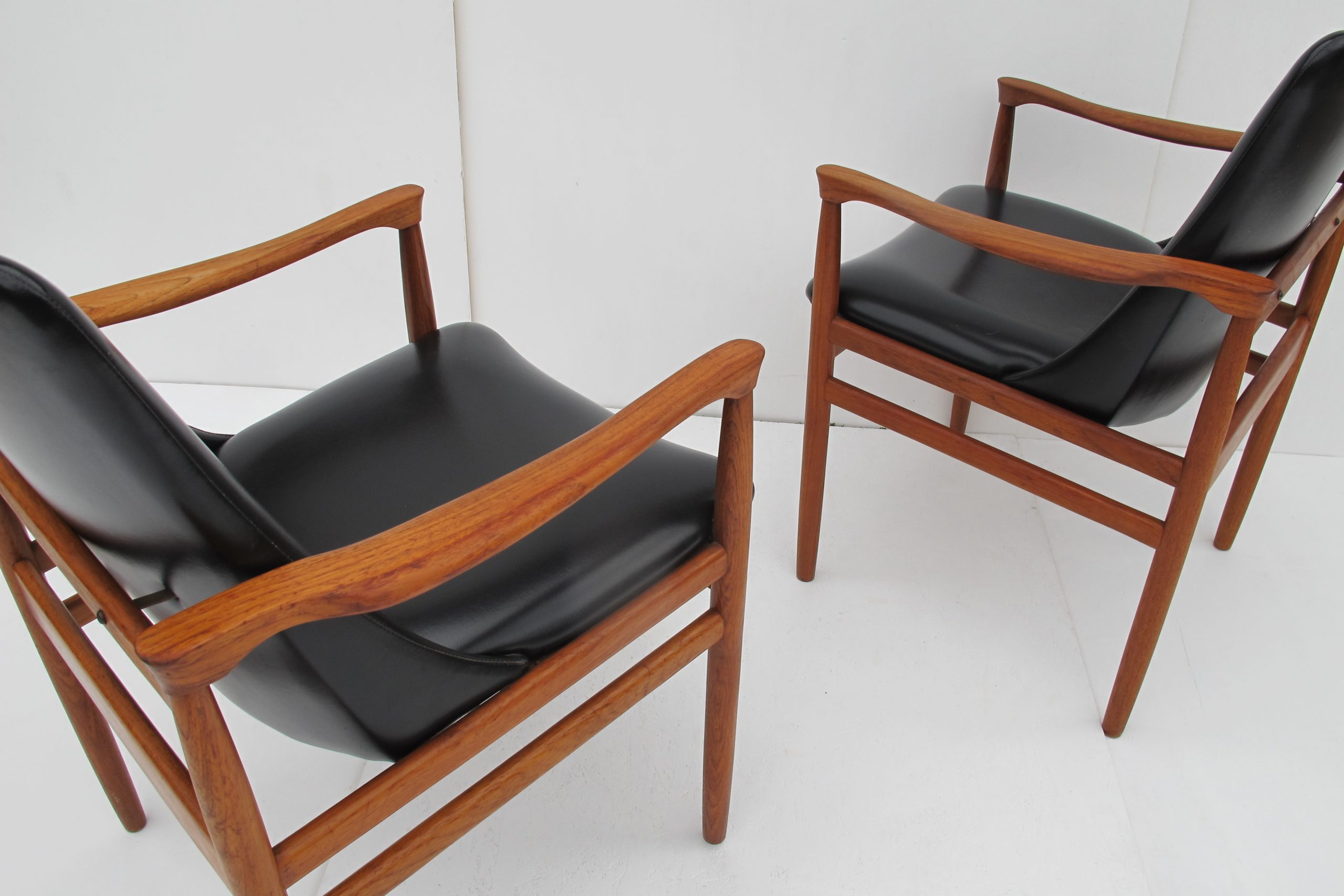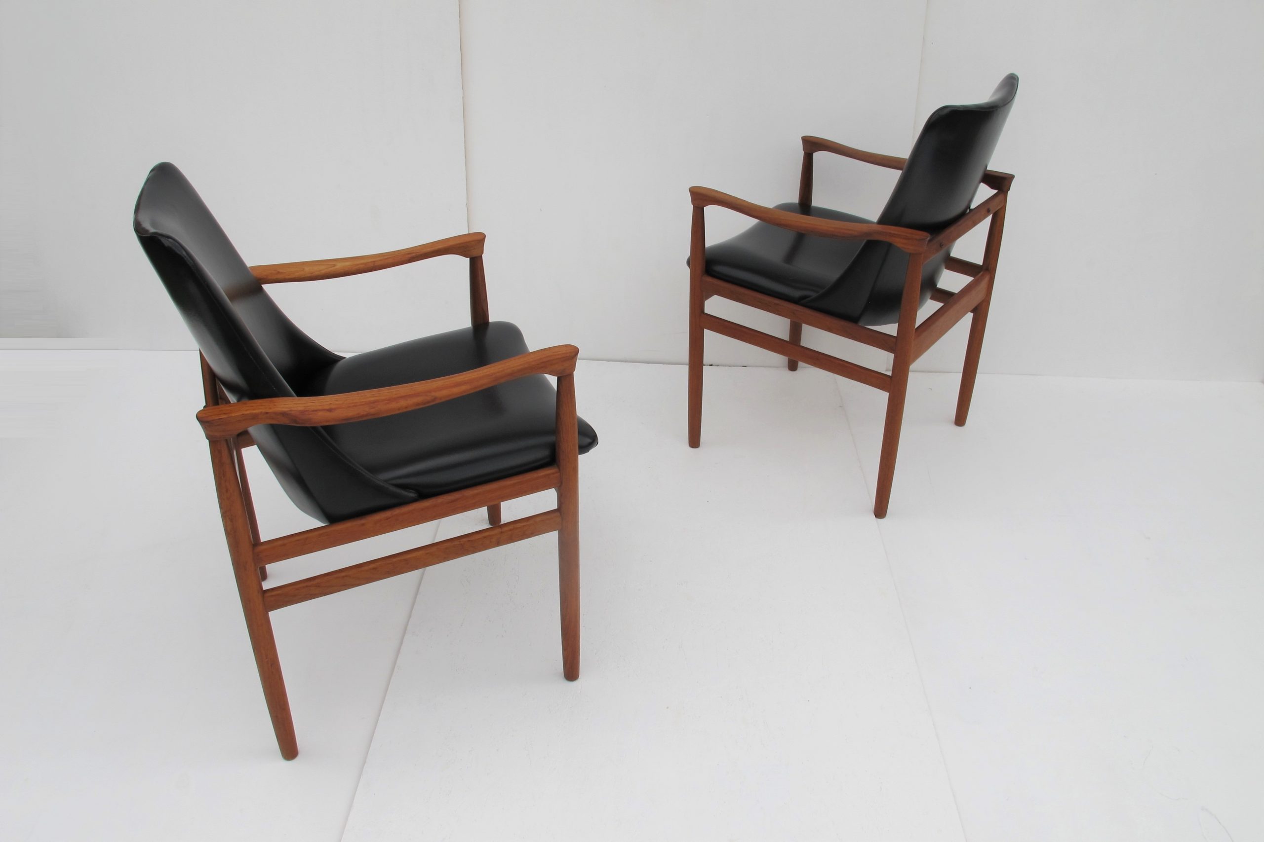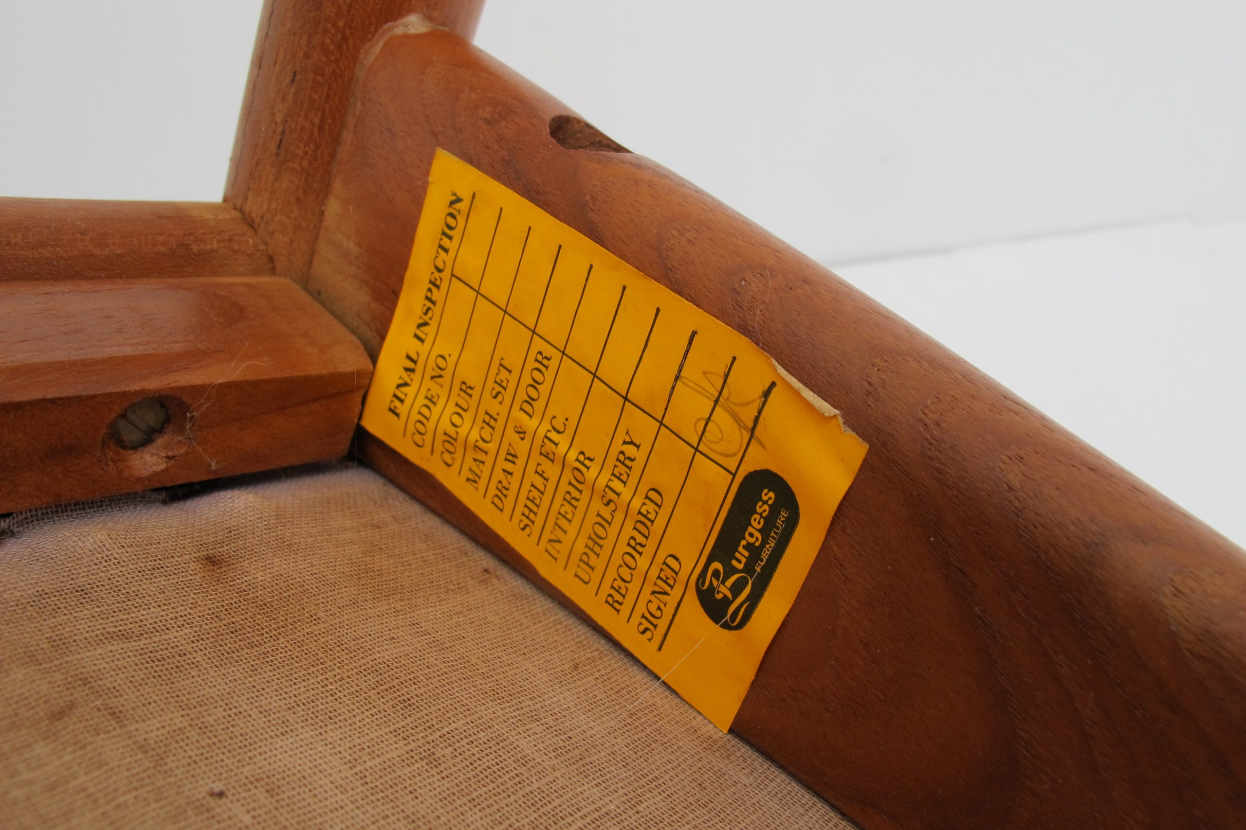 A set of EIGHT sculptural dining chairs with Danish influence by highly-regarded Australian company, Burgess. A few of these chairs still have the Burgess Quality Control label underneath. The construction is of the same quality as Parker Furniture or better. These chairs have curved timber seats (the section under the vinyl is timber)- if memory serves me correctly Parker armchairs like this are standard elasticized webbing- webbing is much easier and cheaper to produce and not as durable. These chairs are 1960’s, most likely mid-1960’s. They were custom-made by Burgess- this is the information given to me from the people I purchased them from. It makes sense- not many dining areas back in 60’s would have been able to accommodate 8 chairs of this size. Today, houses are often built for entertaining and will accommodate a larger dining suite and these armchairs are some of the most comfortable you could buy. Not only will your guests love them but you’ll fall for the comfort and practicality on top of the looks. They are more comfortable than any other dining chair in Danish styling I’ve come across and they look amazing. The leanness and refined quality of this design screams sophistication but because they’re armchairs there’s a boldness there as well.