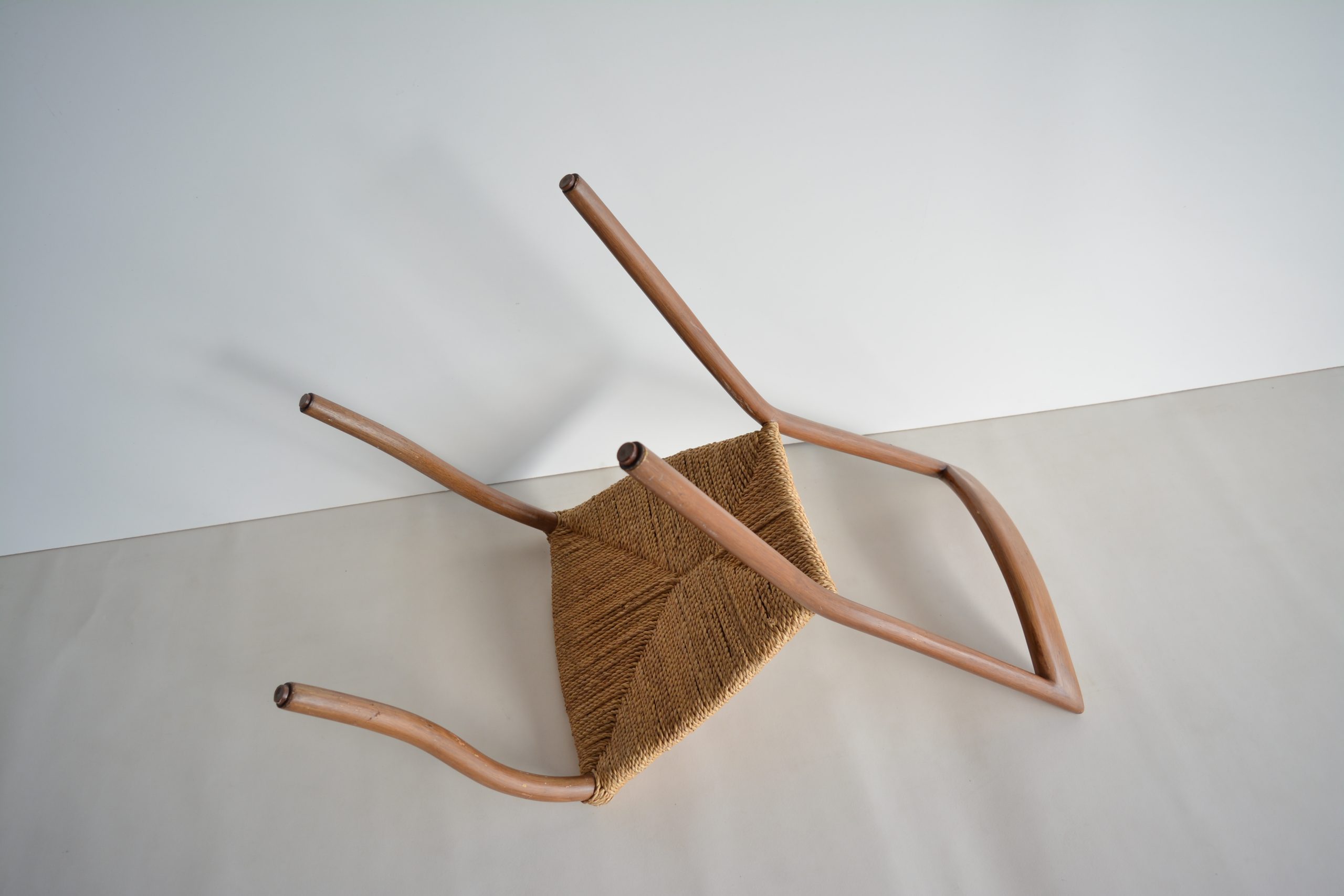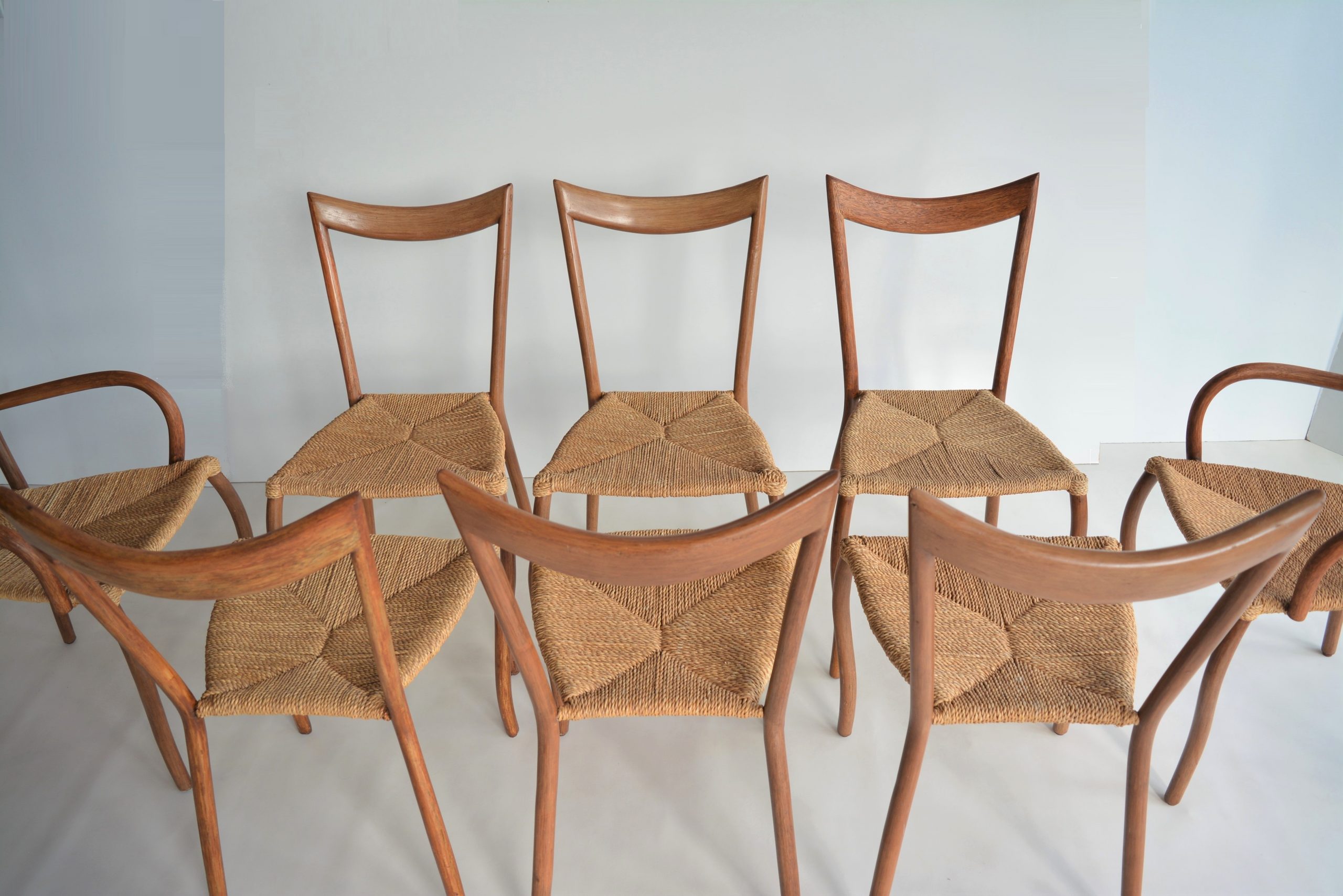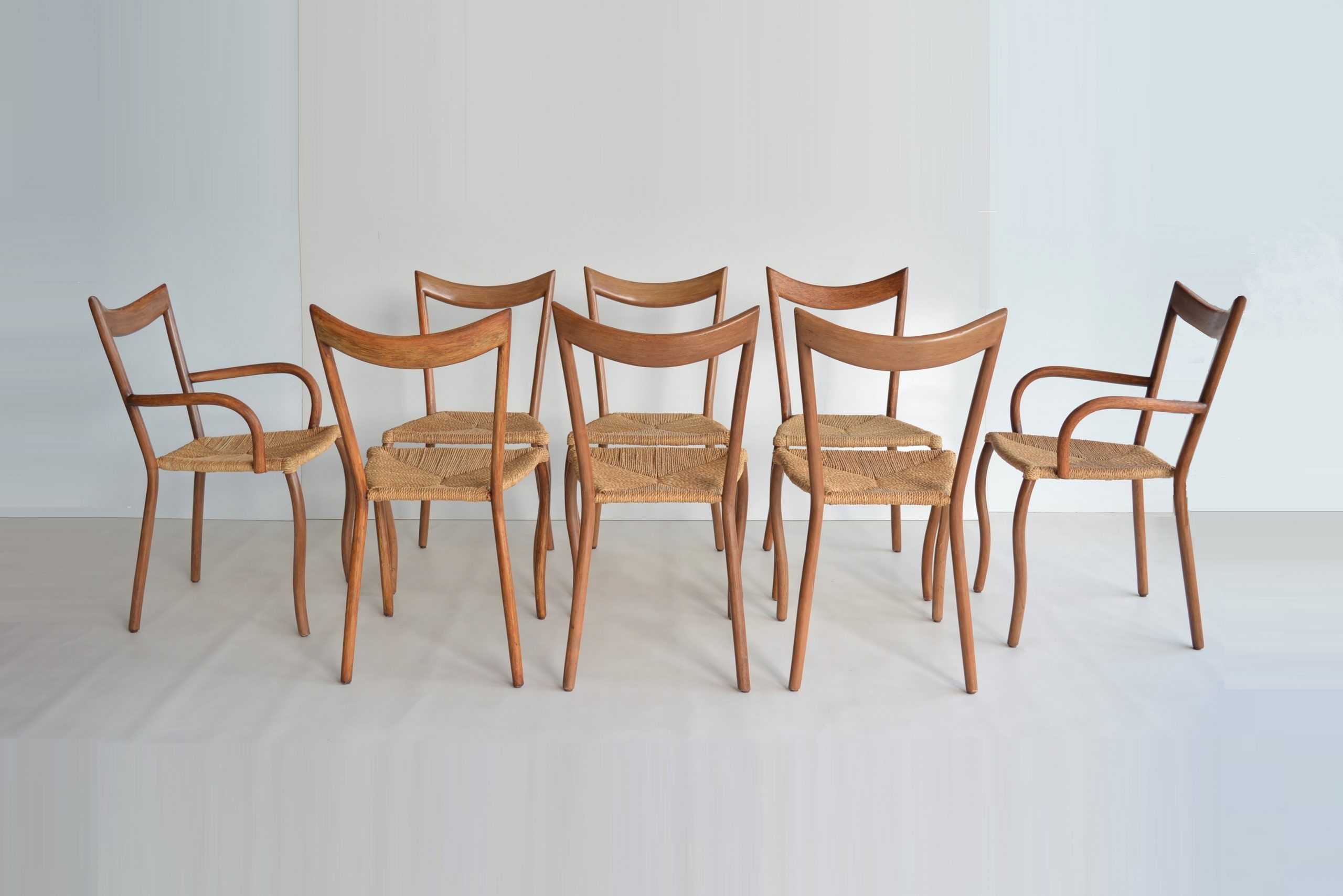All eight of these dining chairs are in solid sturdy condition. There are NO repairs, NO movement in any joint- NO structural damage of any kind. They are ALL solid, sturdy chairs. The suite presents very well as a set but the surface finish shows signs of use and age. I have spent time rectifying the finish so that all chairs present well as a set. For people who appreciate quality furniture this will enhance the value of the chairs as it shows that despite use and age the chairs are 100% solid and strong (despite 15 years of use) so they’ll continue to be strong for many years to come. Nit-pickers will notice old signs of wear to the finish if they want to scrutinize individual chairs but would agree they present well as a set (as the photos show). Around a dining table they look great. Two of the chairs have been sanded back to remove the old lacquer and then re-finished- the other 4 have not. These two chairs look slightly different in tone but this is not noticeable when viewing the chairs as a suite (as the photos show). You could get an orbital sander onto the other 4 (it’s not a major job). I don’t have electricity at the storage unit otherwise I would have done this myself and asked a higher price for the set. The finish on every chair would then be virtually perfect (after using an orbital sander on them)- you’d be getting chairs that are basically worth $4500 (the price for a new set of 8) for less than half the price. The wear is to the surface finish of the chairs and I’ve restored this where needed as well- it does not affect the form nor function of the chairs and is superficial- barely noticed (study the photos carefully). The current finish does the job and is completely serviceable so the chairs are ready for decades more use. There are no creaks or groans and no movement in any joint. I really can’t fault the set in any other way- the seagrass seats are also in great condition for the age. ________________________________________________________________________________________________________________________________________________________________________ Padilla Chairs. Measurements. Across- 45.5cm. Depth- about 53cm. Total height- 88cm. Seat height- 46cm. They stack cleanly into a stack of 2- you can get more onto 2 as well (at least 4 or 5 as a stack) but they start to sit up off each other. The pair of armchairs (AVAILABLE SEPARATELY!) stack cleanly as well. Across- 49cm. Depth- about 53cm (like the others). Total height and seat height- the same as the others. Read my 1200+ feedback comments (ALL for vintage furniture and decorative arts SALES) to be assured that all my items are described as accurately as I can.