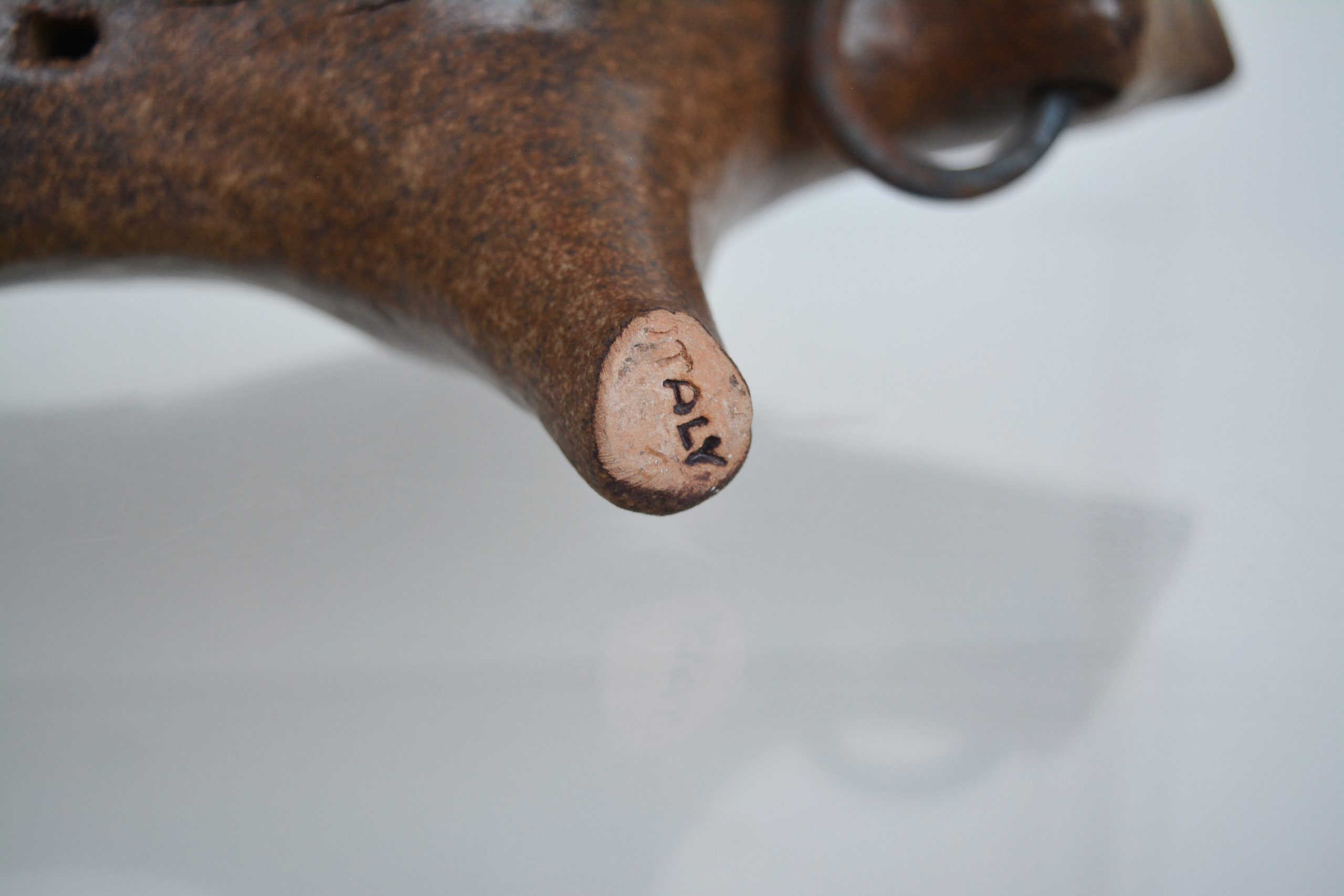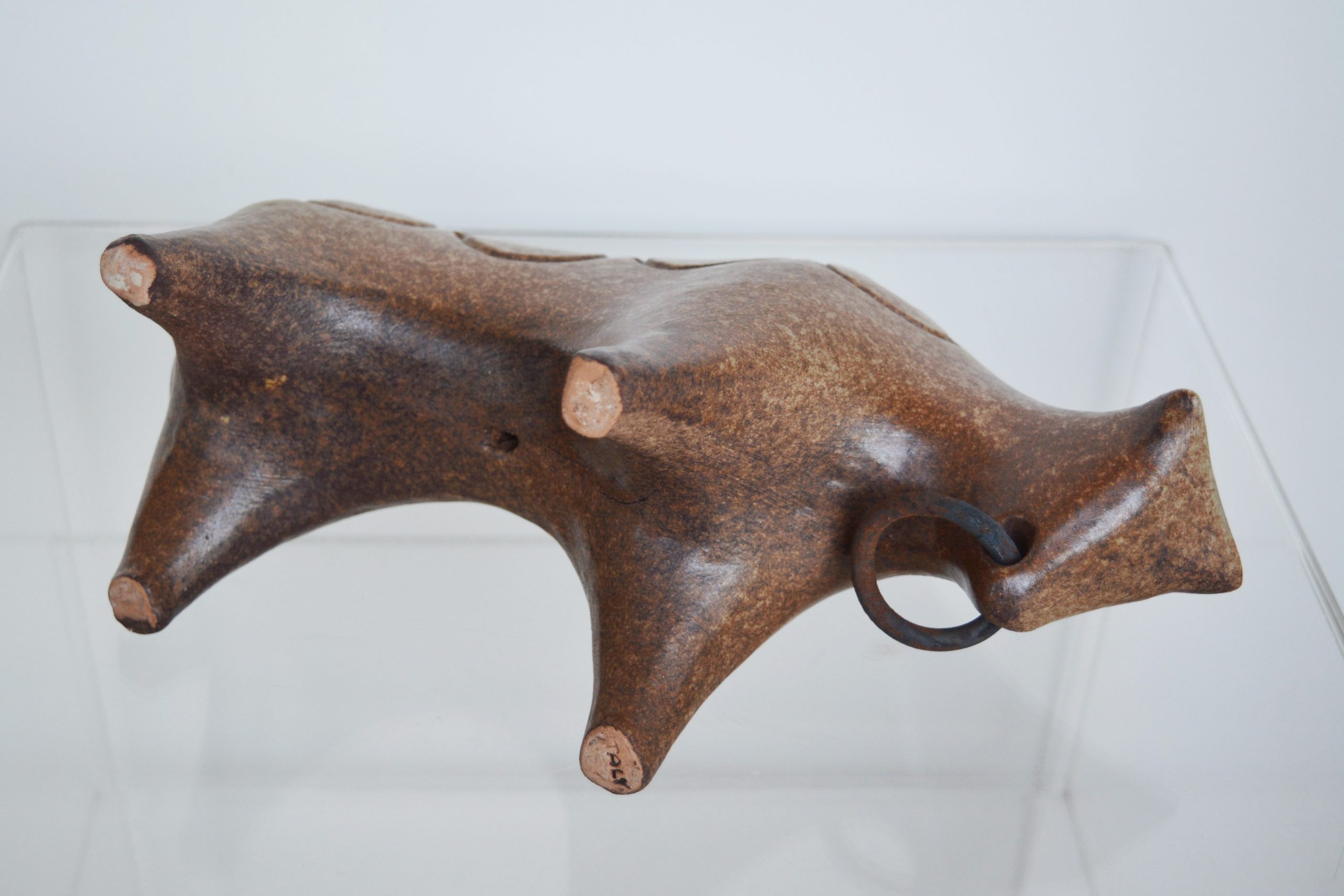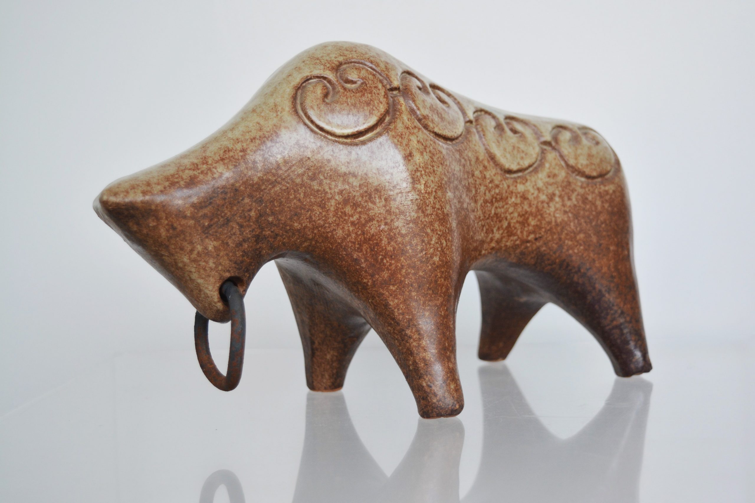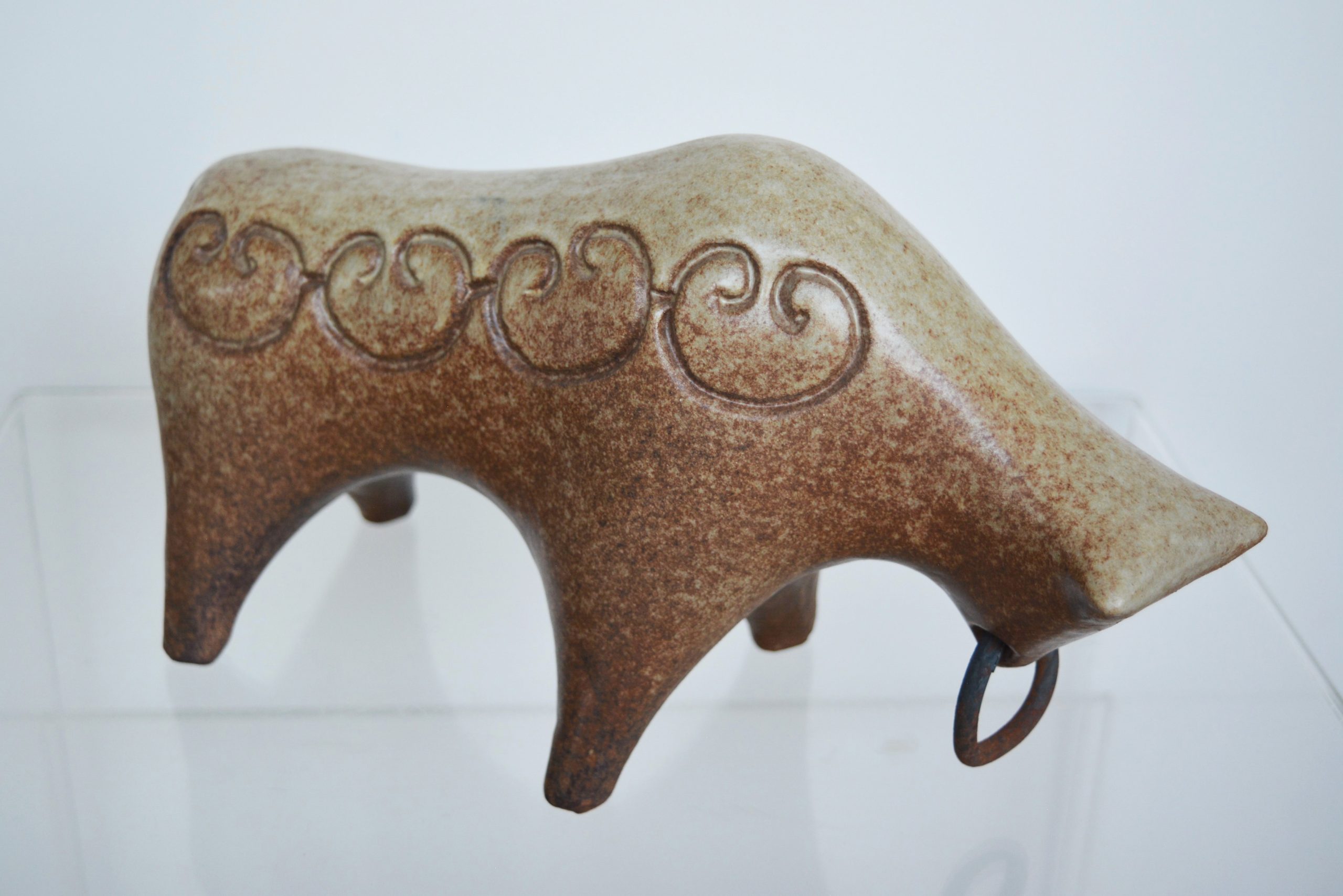 This piece was produced by Alvino Bagni in the 1960’s. Rosenthal Netter sold a lot of Italian decorative pieces in America during these formative years. They sold quite a lot of Bitossi pieces but other artists including Alvino Bagni were also represented (but in much smaller numbers). This piece has the distinctive ITALY imprint on the underside of one foot which is the marking of Bagni pieces. This marking gives the piece irrefutable history and investment appeal. There’s a Bagni bull in this identical shape on 1stdibs at the moment for a staggering AU$3887! (See the screenshot provided.) At my price, this is an obvious investment- I believe it will easily gain value in the near future (in the right gallery it could be sold for double this right now … easily). Bagni started off working for Bitossi and later cut loose and established his own studio. His designs are distinctly his own- they’re highly-celebrated and very collectable on a worldwide platform. This piece shows us why.