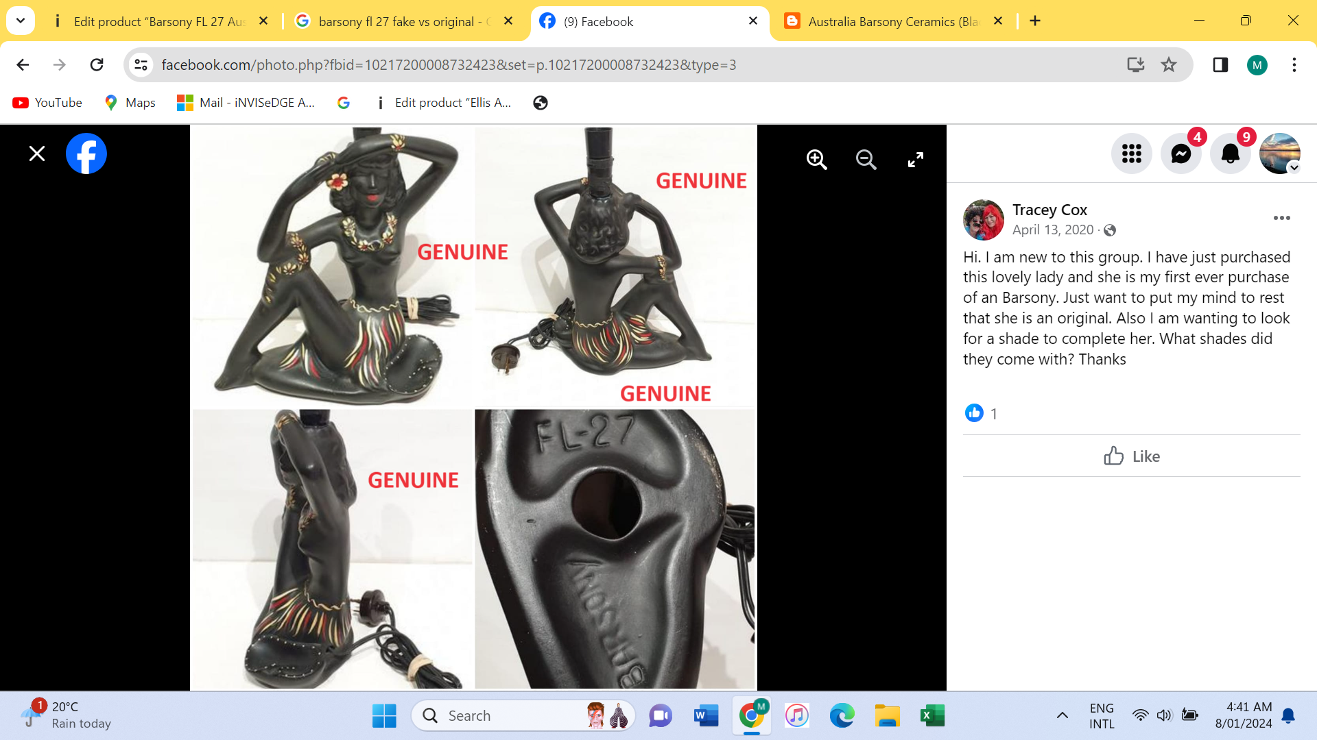 Barsony products became so popular in the 1950’s and 60’s that the factory in Guildford, Western Sydney operated 24 hours a day to satisfy demand. Barsony ceramics became unfashionable in the late-70’s and 1980’s when Chinese-made items started to flood the Australian market. Most vintage pieces at this time were seen as being “daggy” and “for poor people”. Many people thought of items such as Barsony pieces as junk and threw them out. Numbers have diminished over the years. Around 2002, fashions changed and vintage pieces slowly started to become more sought-after. Kitsch items became cool in the early noughties- Barsony black lady lamps started to feature in the upmarket vintage shops in our Capital cities. At around 2003 black lady lamps in good condition were being sold for around $300. Since COVID all things vintage reached a height of popularity never before experienced. Today in 2022, vintage pieces made in Australia have become extremely sought after and hotly contested when they come onto the market. Barsony ceramics have become amongst the most highly-prized vintage decorative arts pieces in Australia. Good examples are now consistently fetching over $1200 each- I’ve seen many bid up in auction to over $1500 (written 2022).