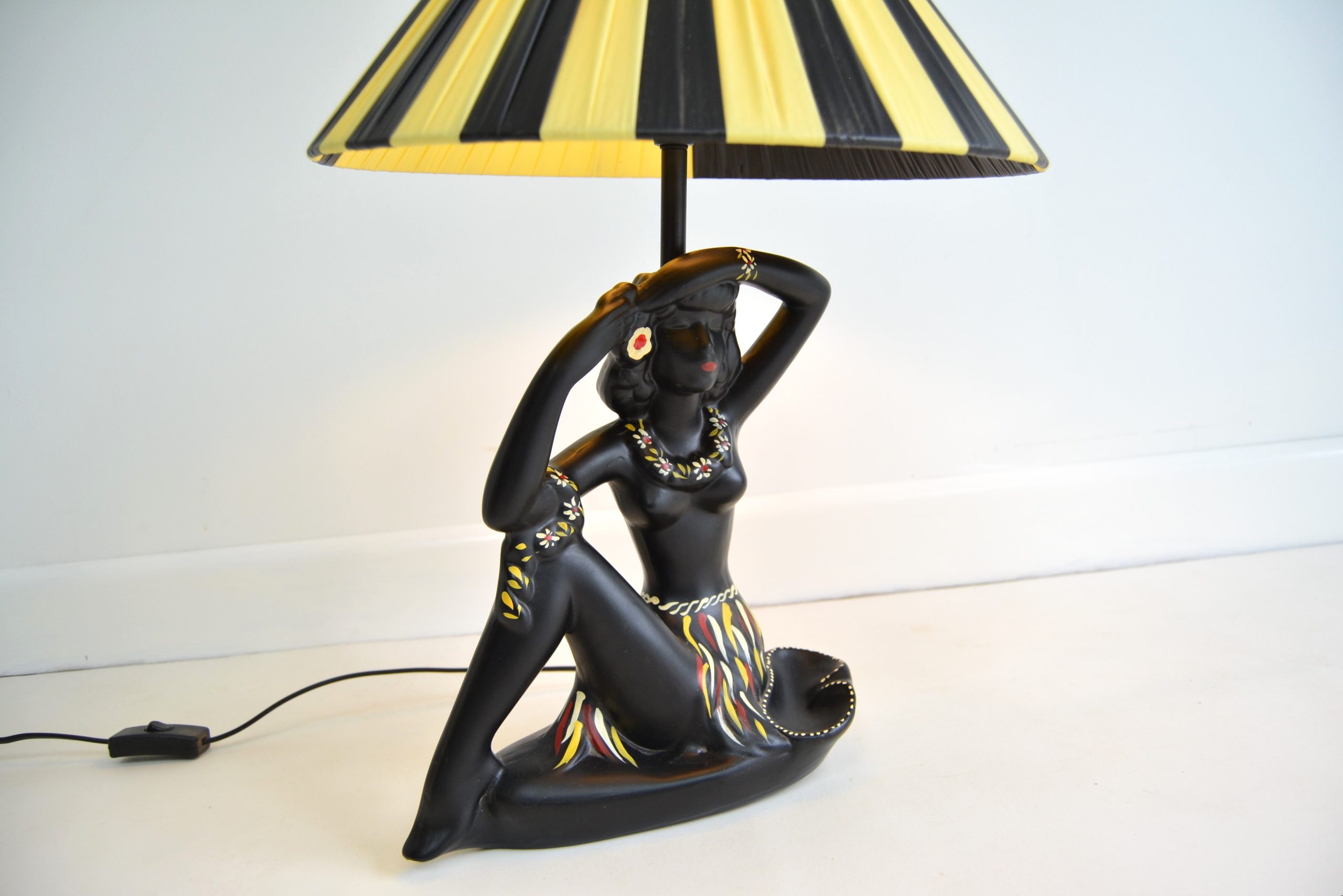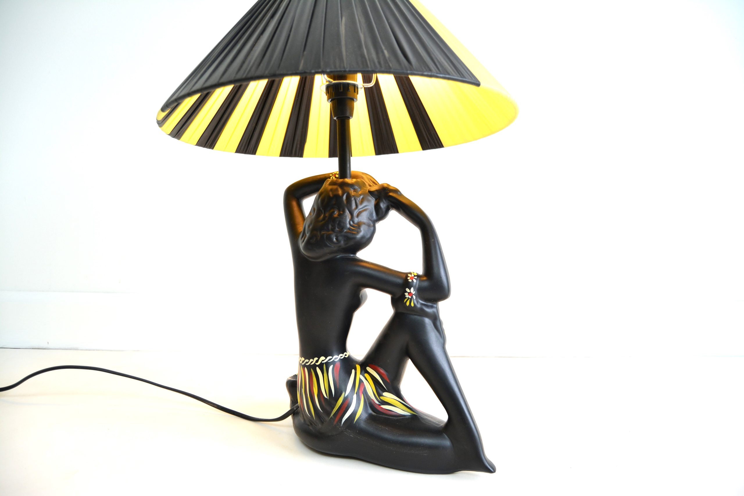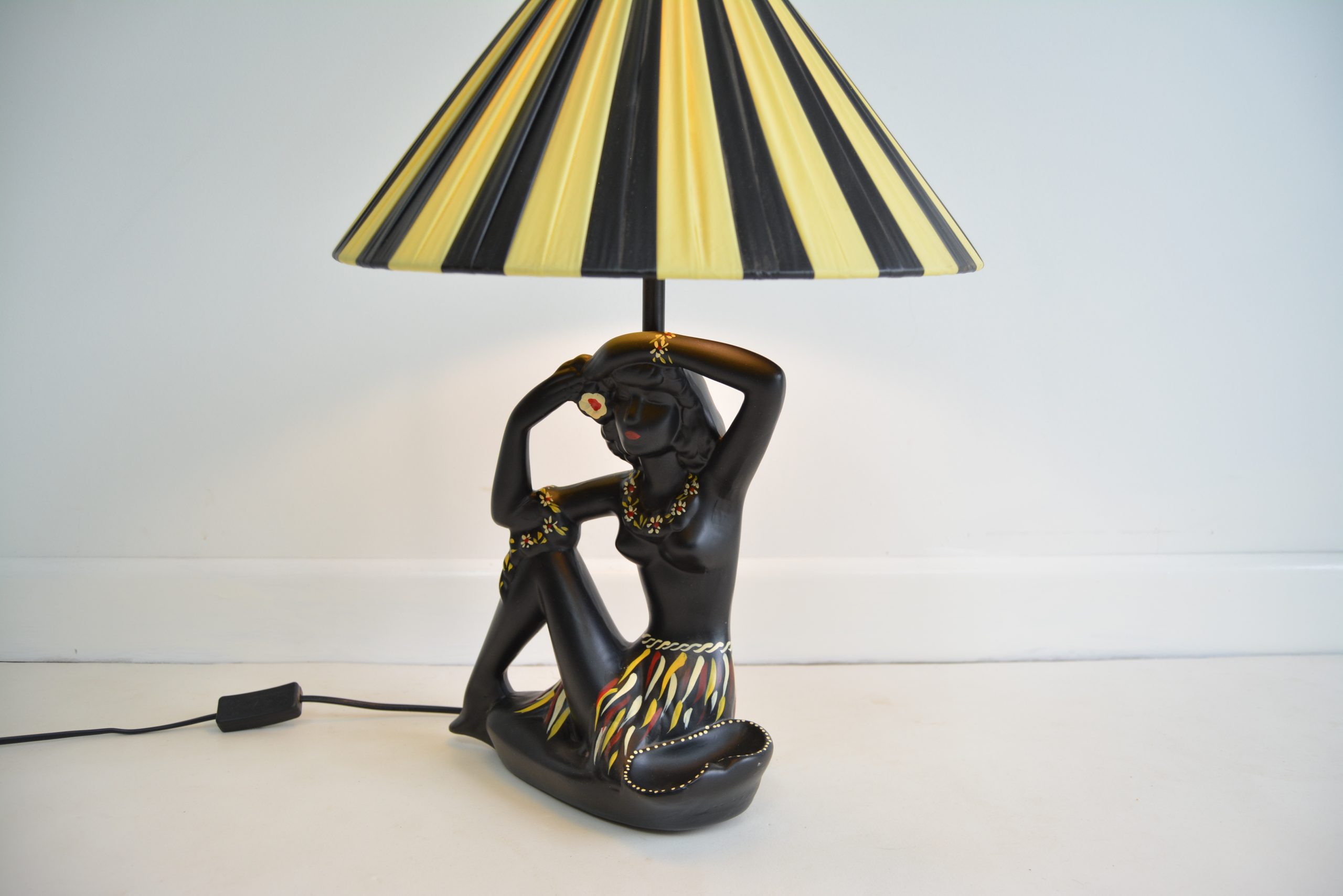 Barsony FL 27 Hawaiian Black Lady Lamp with yellow and black shade. This is one of George and Jean’s most recognisable figural lamp designs- complete with ashtray – a practical ruse to avoid the tax on decorative items in place at the time.