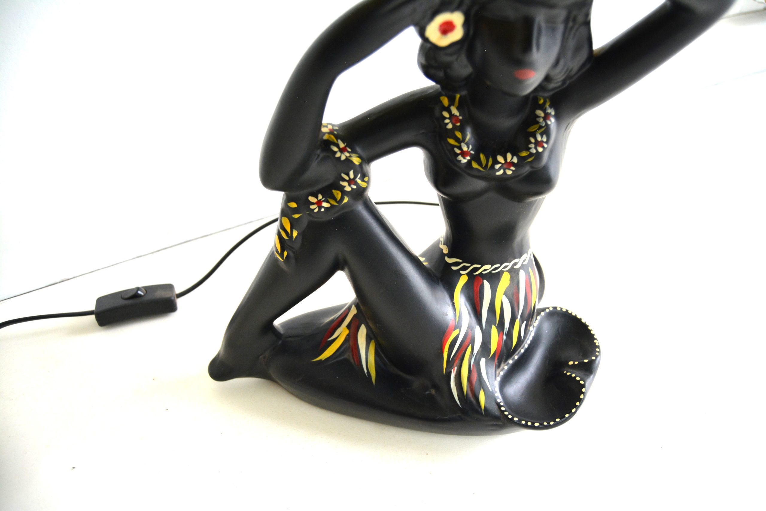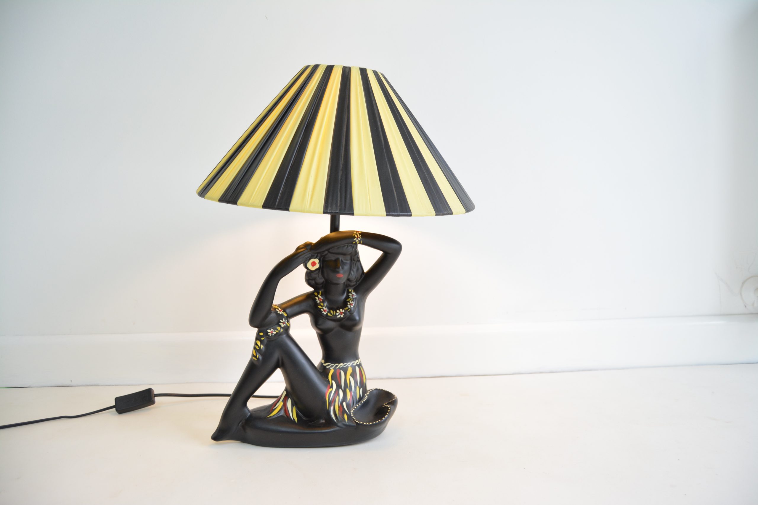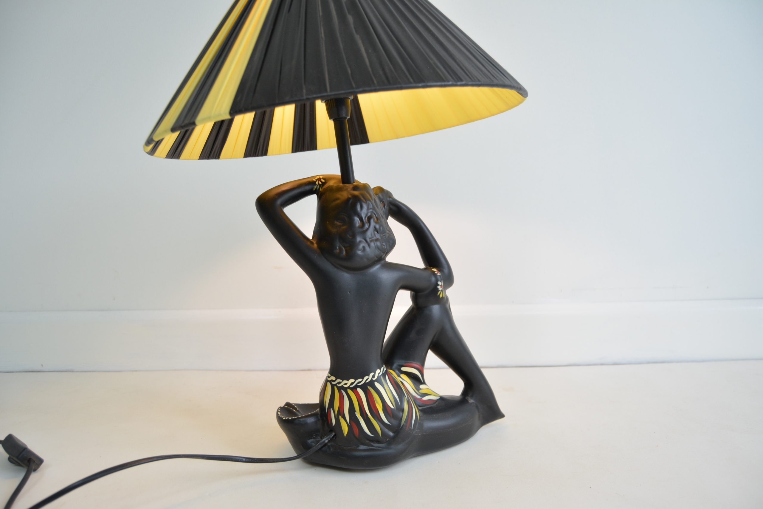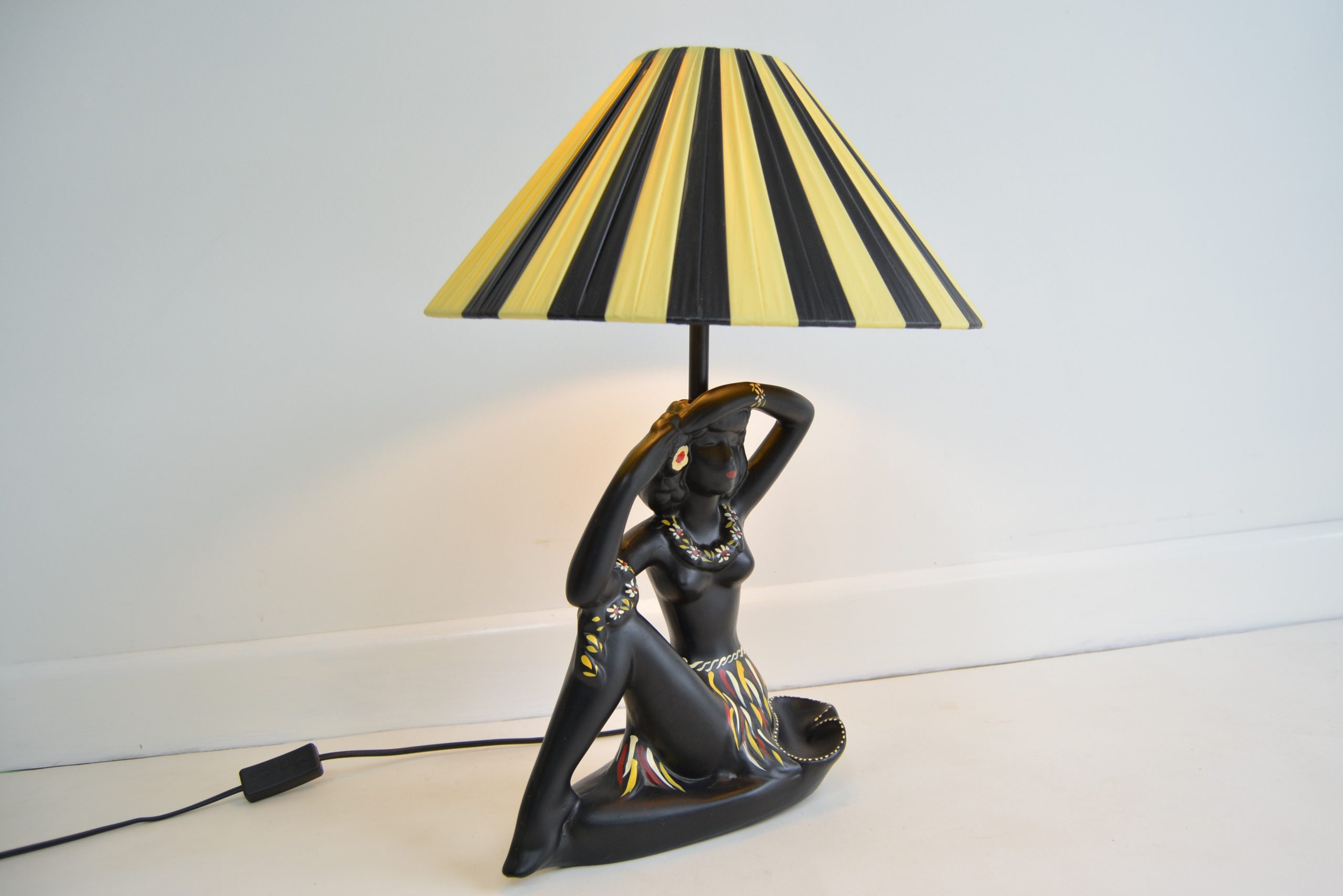 Barsony FL 27 Hawaiian Black Lady Lamp with yellow and black shade. This is one of George and Jean’s most recognisable figural lamp designs- complete with ashtray – a practical ruse to avoid the tax on decorative items in place at the time.