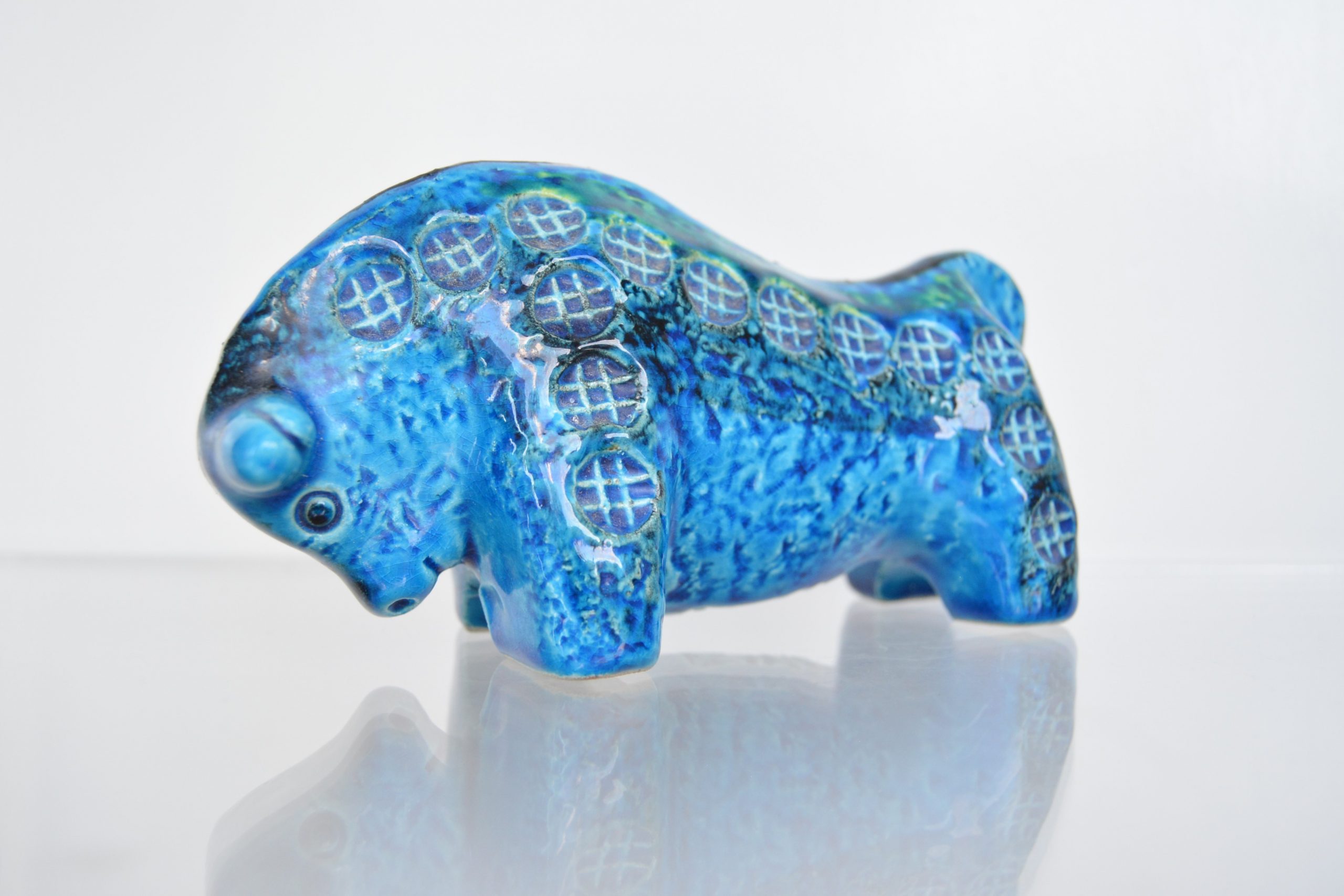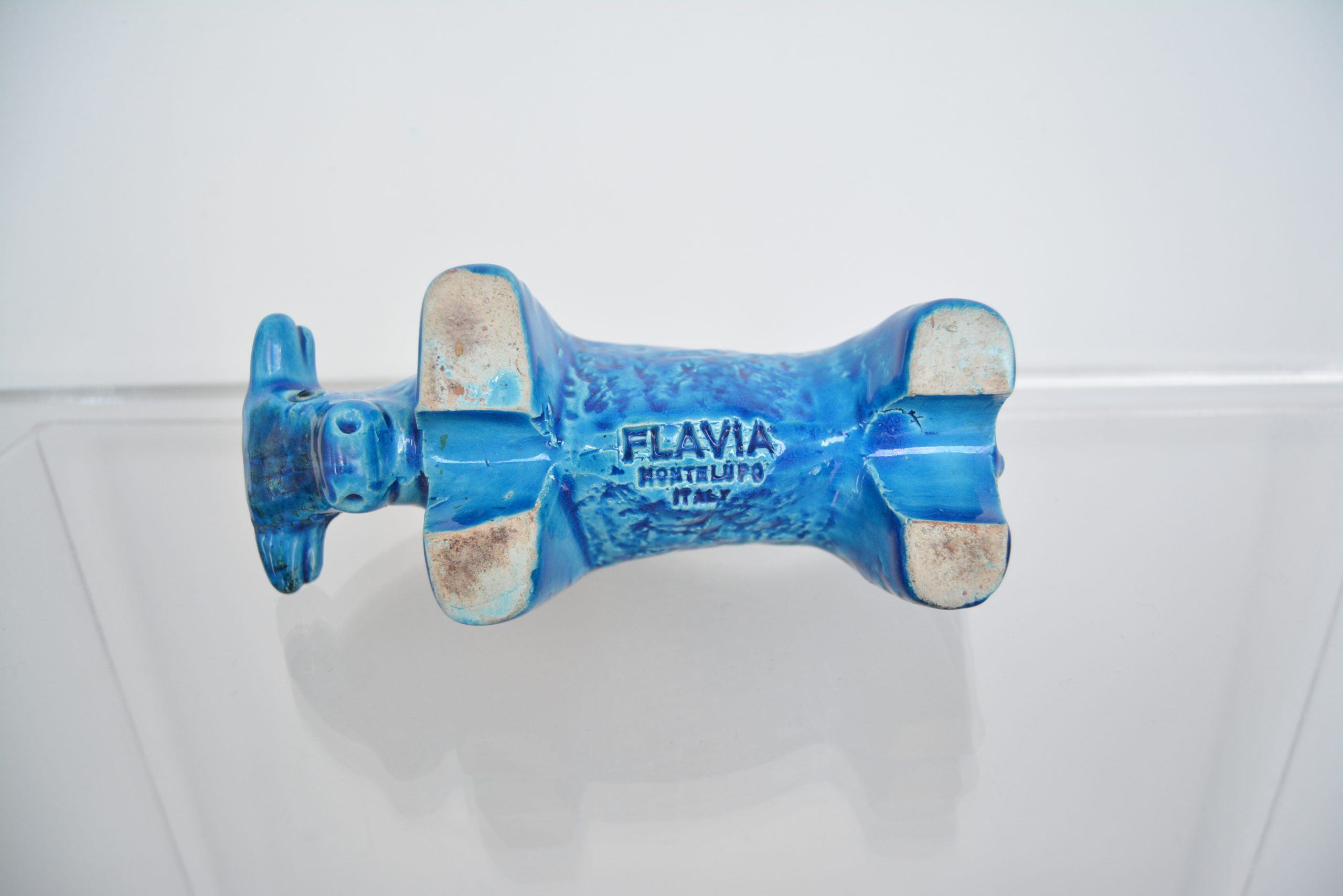 I purchased this Bitossi bull from an estate sale years ago when I was still in Sydney (along with several other Rimini Blu animals- several of these have recently sold). The people clearing out the estate told me this family immigrated to Australia from the UK in 1982 and bought some of their furniture and many of their special decorative arts items with them. This pinpoints the date of this piece to the mid-to-late 1970’s. The famous Bitossi factory in Italy started marking all their decorative arts pieces with a FLAVIA impression (like this) from 1976 onwards. In the mid-1980’s when mass-produced Chinese décor items flooded worldwide markets, production of decorative arts items at the Bitossi factory slowed. At this time, the output of items in this colourway (the famous “Rimini Blu” colours) reduced dramatically. By the 1990’s the Bitossi factory was producing a lot of other looks and styles. From the 1980’s, Giovanni Masone took over as artistic director and invited various Memphis group artists to collaborate with FLAVIA including Piero Fornasetti. Bitossi / FLAVIA items in the 1990’s were largely in different styles and the production of animals (particularly in this Rimini Blu colourway) virtually stopped (many earlier animals that remained popular for 30-odd years stopped altogether in the 1990’s).