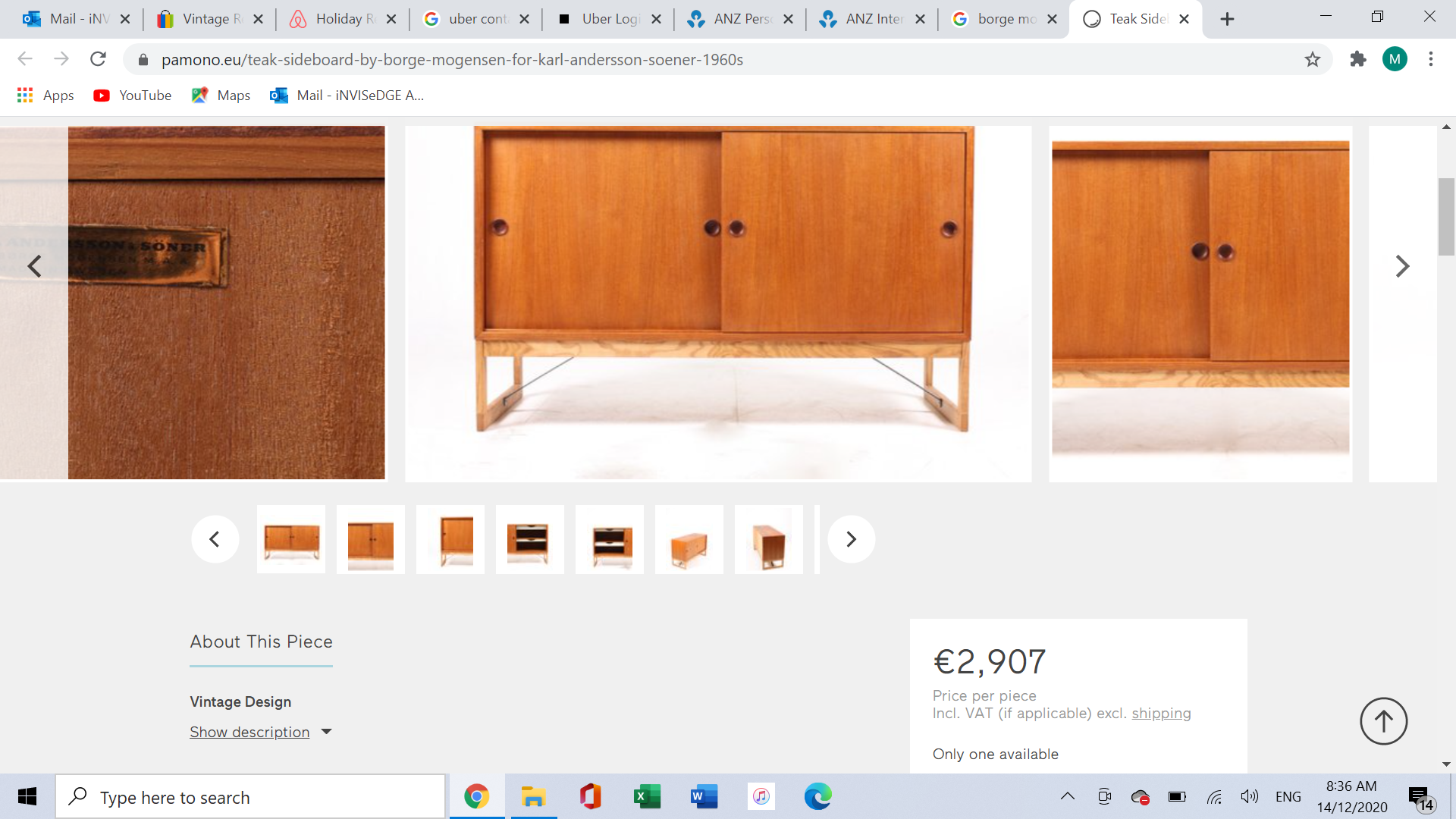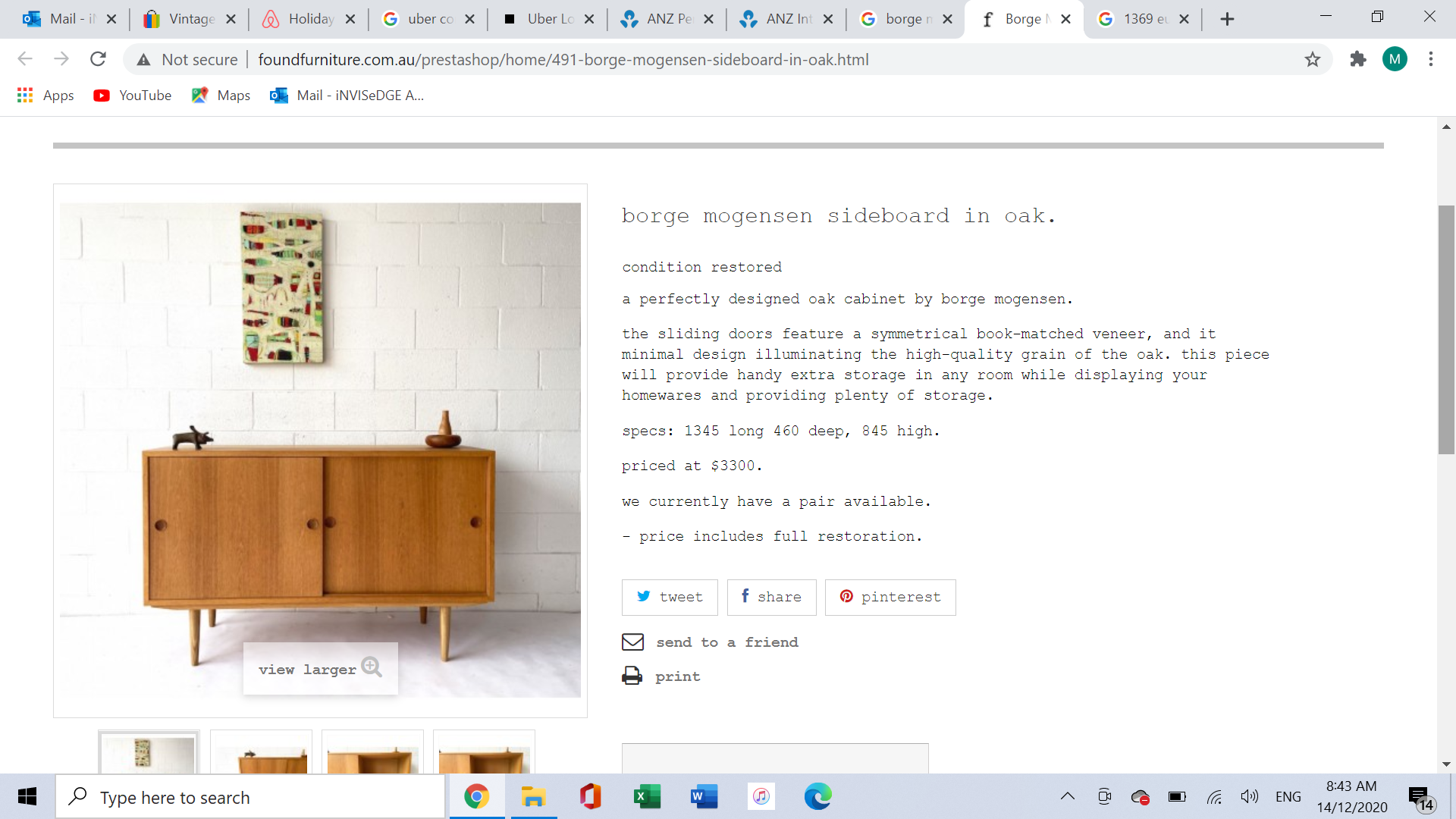 Which brings us to investment appeal. At iNVISeDGE we don’t believe you should be “purchasing” furniture anymore. Our aim is to ONLY stock items with inherent value- items that won’t lose value after you buy them. 99.15% of the furniture items we’ve stocked in the past 20 years have INCREASED in value and some markedly so! We’ve sold pieces in the past that are now worth over 6 TIMES more than what our customer paid for them! This exact vintage piece is currently for sale on an Australian website for $3300. There’s a similar Borge Mogensten piece on an international website for over 2900 euro (equivalent to AUD $3600). (See the screenshots provided in this listing). The investment appeal on offer here is a no-brainer. I believe it will increase in value along with inflation forever.