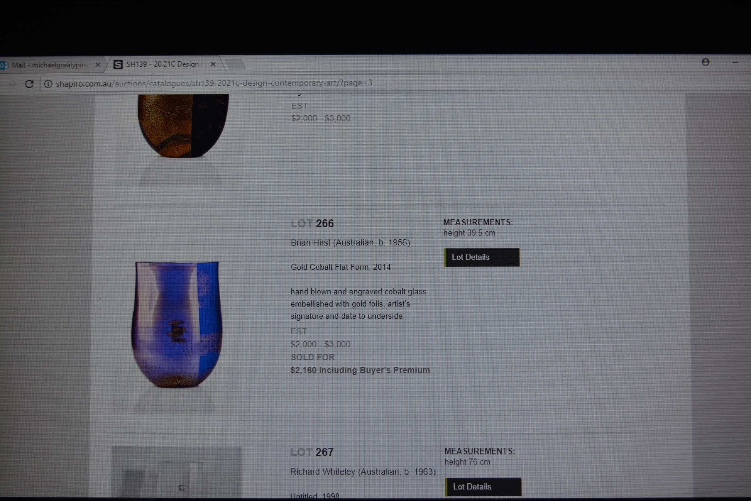 Brian has significant pieces in private and public collections, nationally and internationally including the Powerhouse Museum in Australia, Hokkaido Museum in Japan, Ebeltoft Glasmuseum in Denmark and the Corning Collection New York. His CV is as long as your arm and if you have short arms, it’d be longer! The awards, places he’s taught and galleries that have represented his work are truly inspiring. A quick trawl of the internet reveals Brian Hirst pieces commanding high prices- I’ve included 2 screen-shots- one piece sold in auction for over $1000- the other for over $2000.