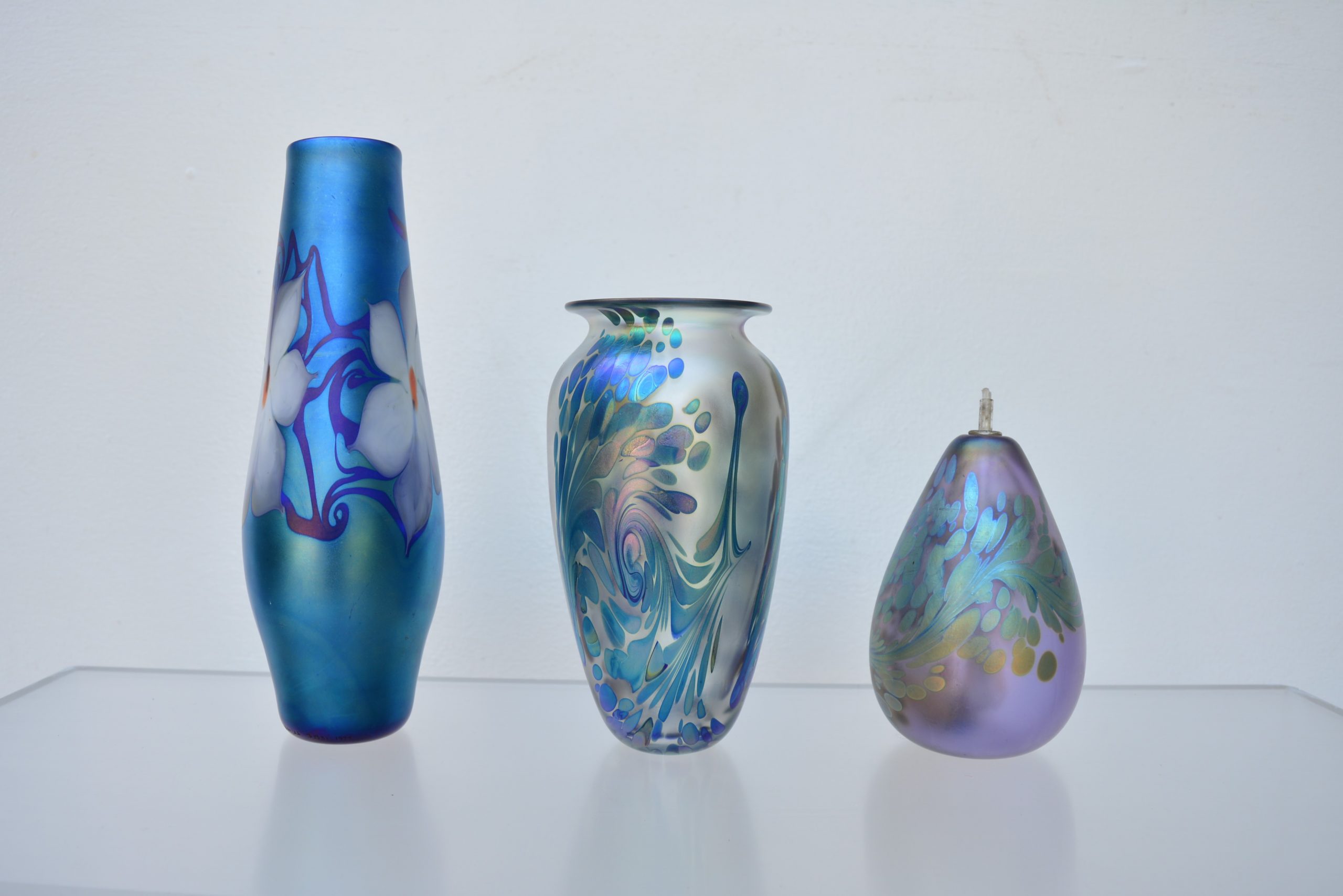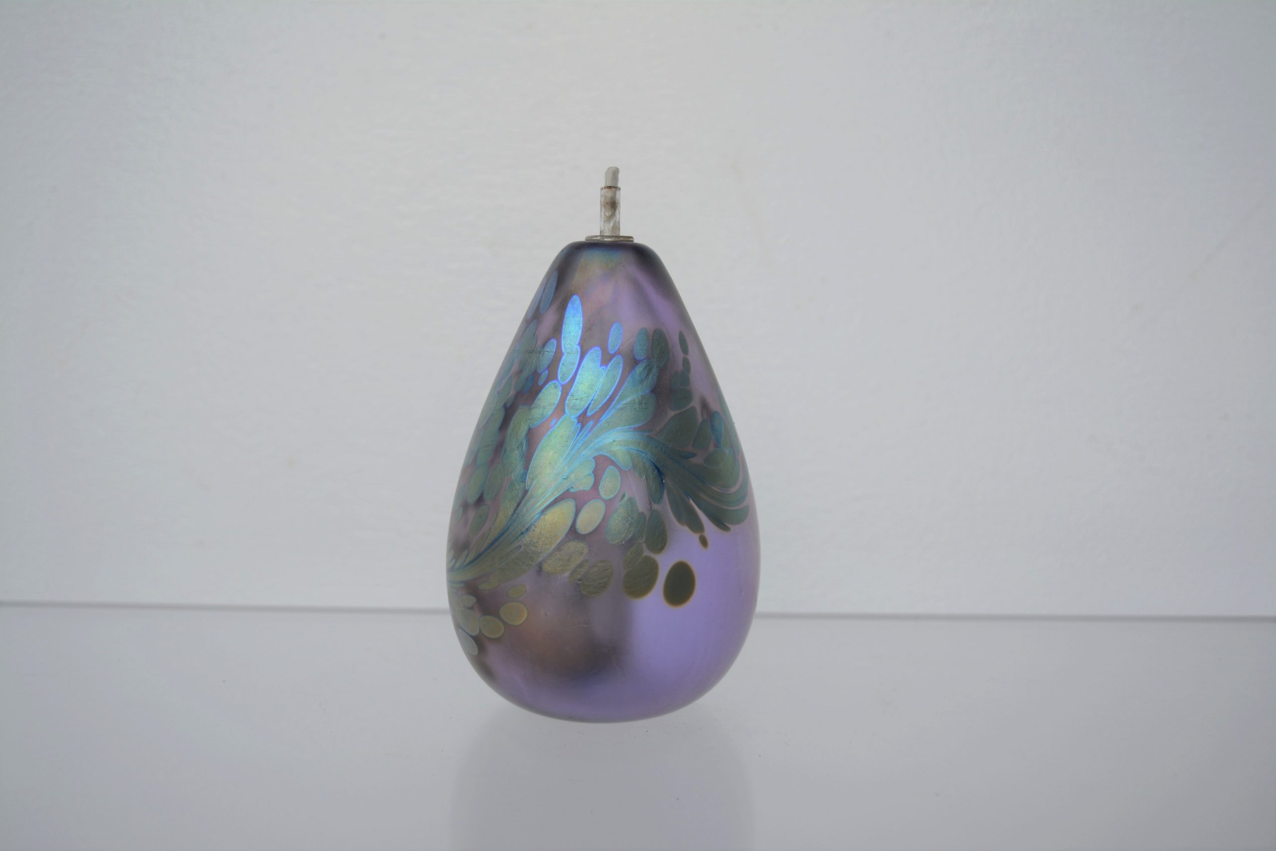 A HAND-MADE art-glass piece by highly-respected American artist, Brian Maytum. The piece is signed Maytum Studios, 1988 with the design number and the copyright symbol. This is a stunning piece as part of group- the colour is rare. This is an oil burner but if the wick was removed it could also be used as a vase. It’s the first iridescent piece I’ve come across in this colour in Australia. It has an expressive style- wispy and free-flowing and the iridescent swirls seem to just disappear into the piece.
