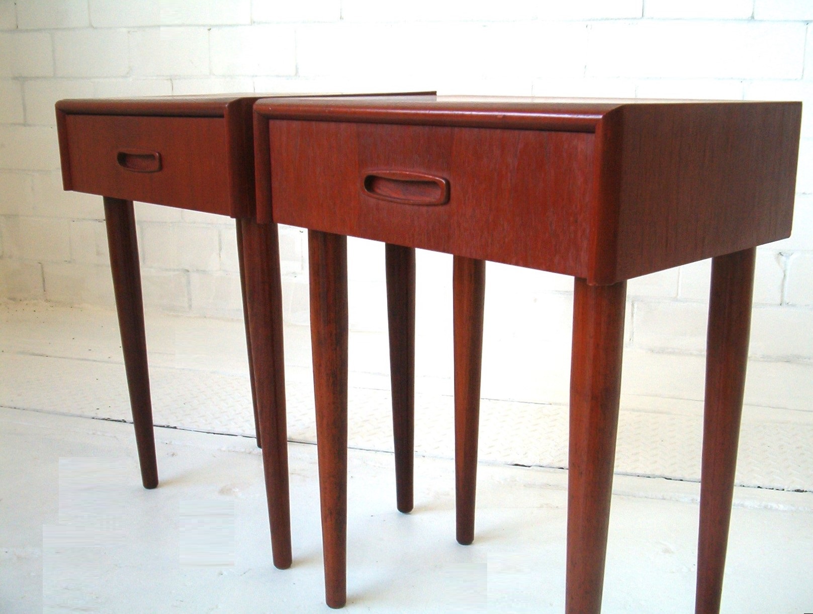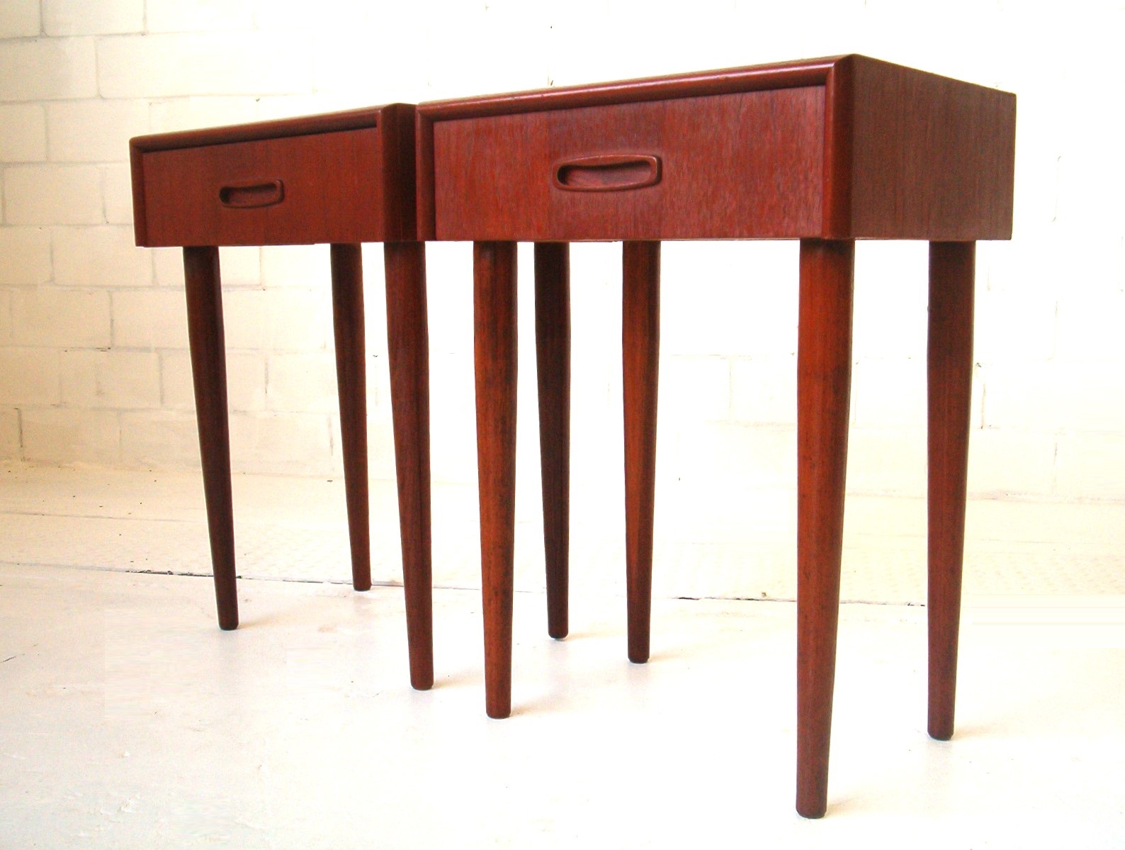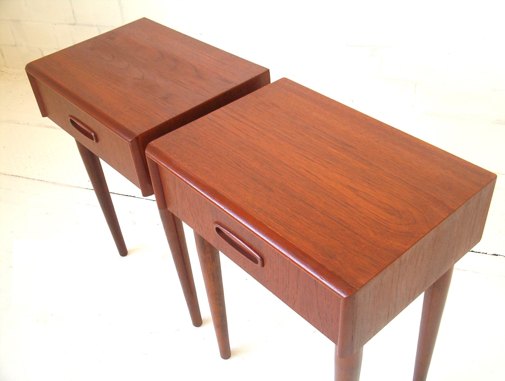 Constructed in the early-1960’s when the Danish-design movement was reaching its peak, this pair oozes stylish sophistication. Pairs of vintage bedside cabinets from this era are hard to get. This is because the pair concept on each side of the bed only became popular in the mid-to-late-1980’s. Back in the early-1960’s there was usually one bedside table and a dressing table on the other side (along the wall) with a mirror and small stool for the lady. (Politically incorrect by today’s standards- men can apply make-up too!)