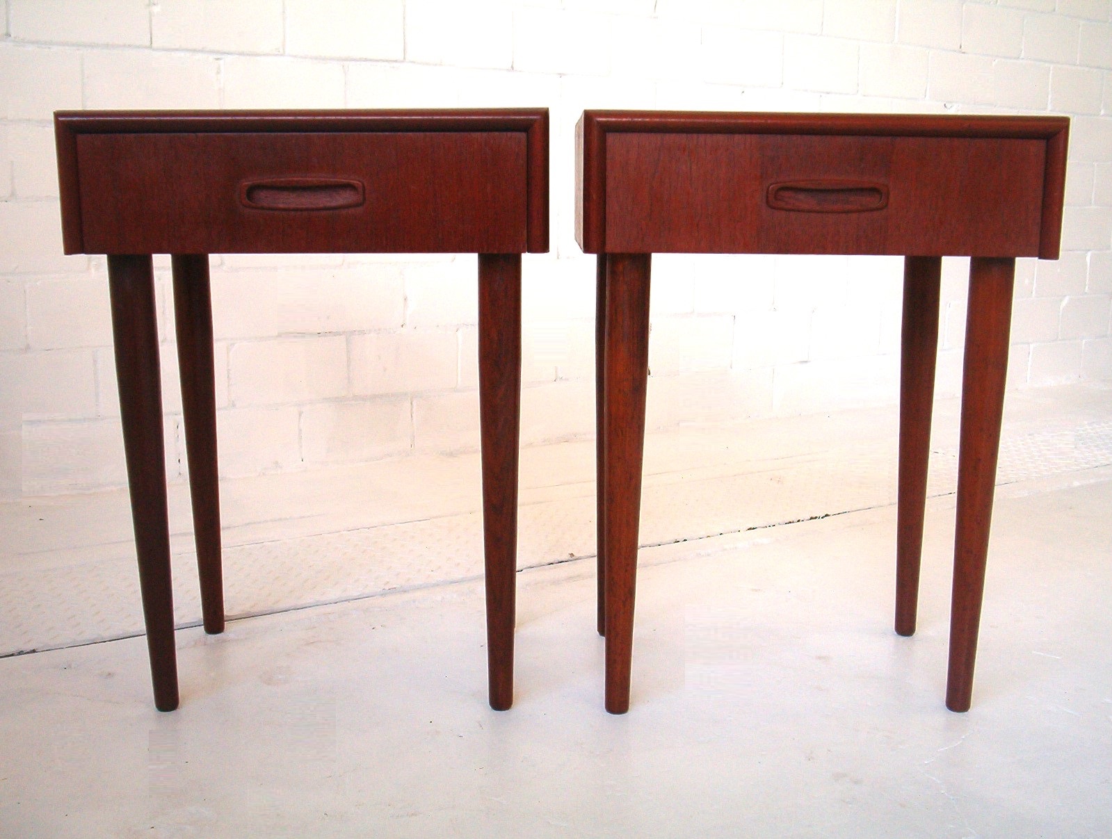 This vintage pair of bedside tables may have been made by Burgess, Australia (Melbourne) otherwise they’d probably be Danish. In 22 years of trading I’ve not come across this design again which leads me to think they are more likely Danish (or European).