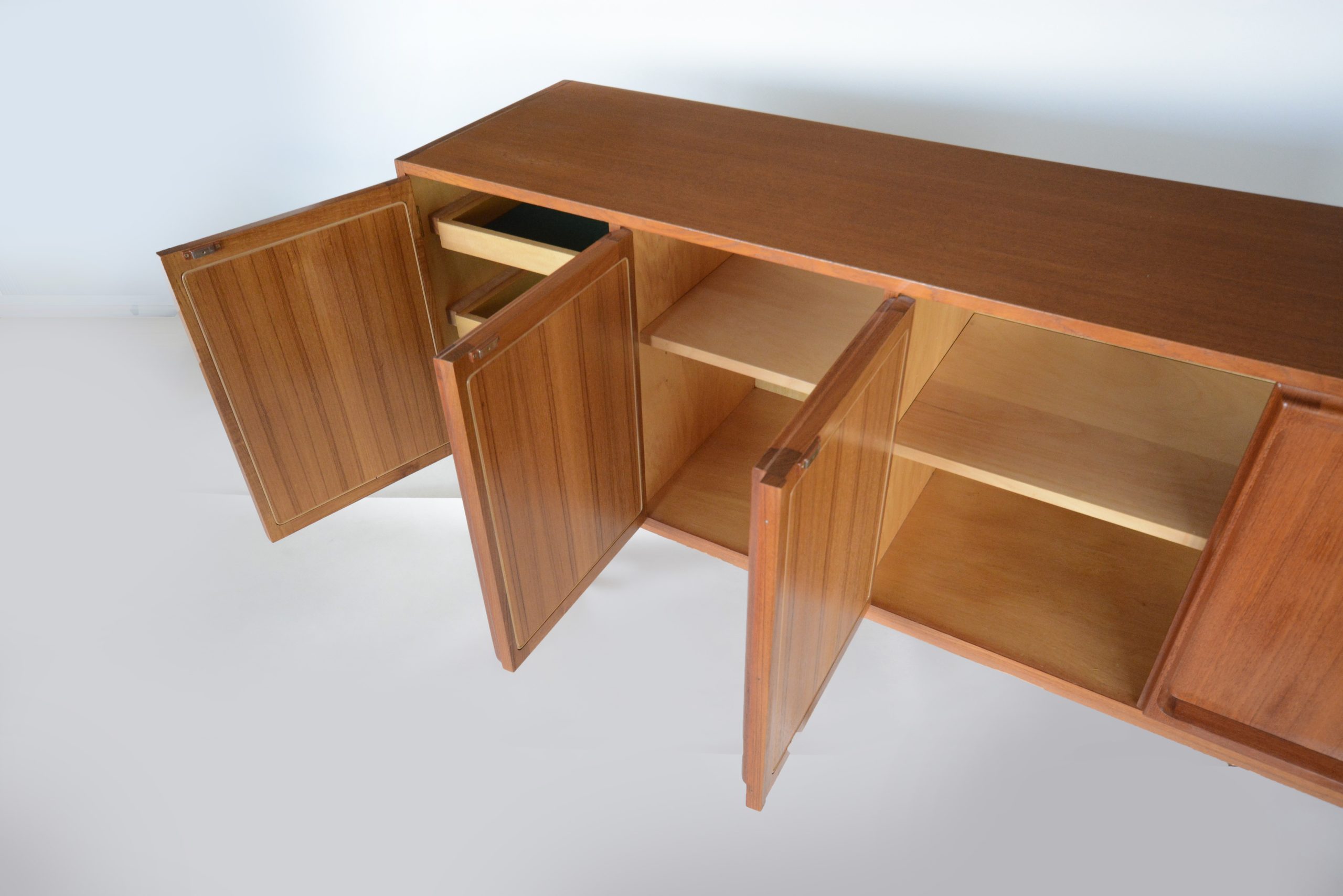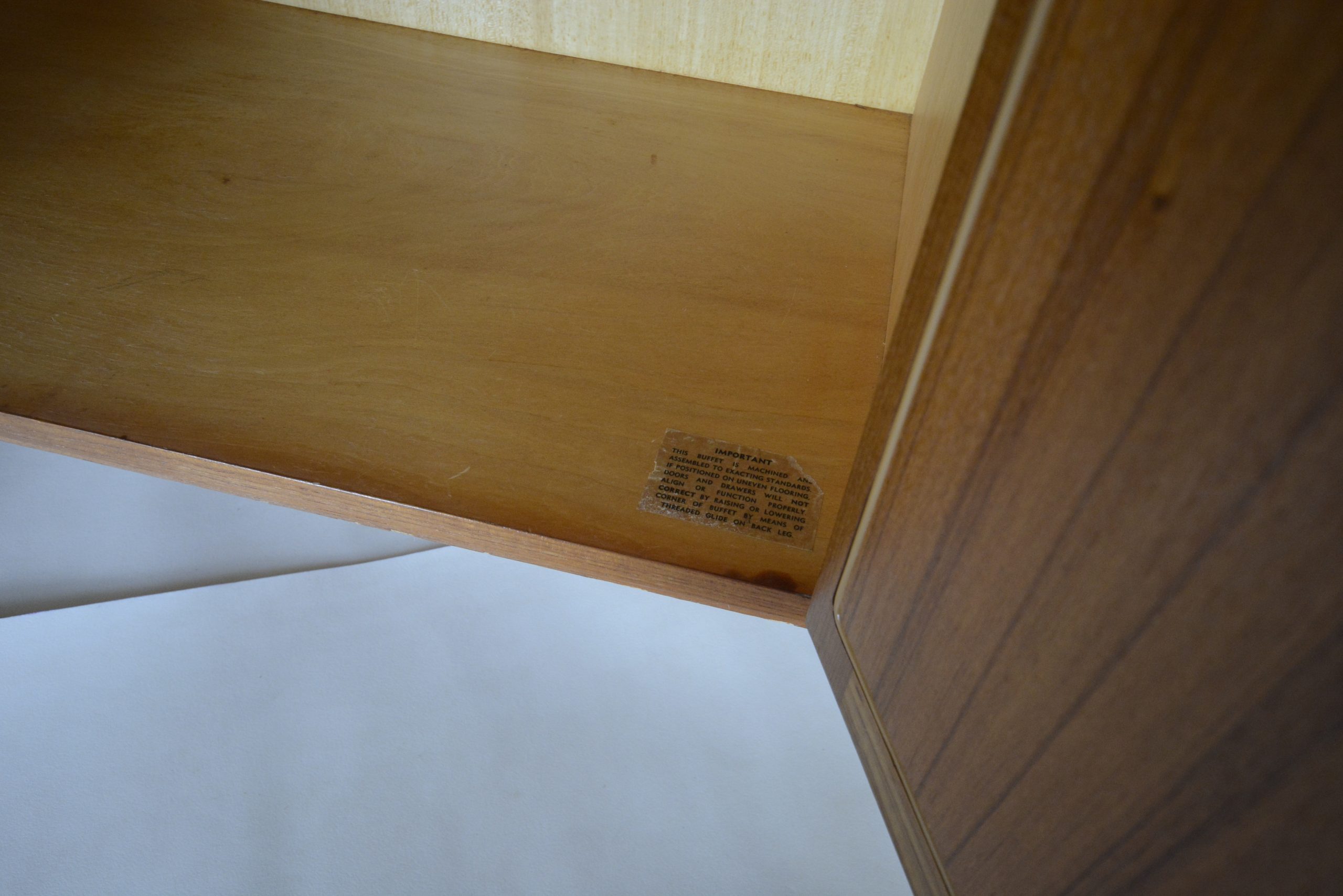 This longer cabinet (over two metres in length) would be at least four times rarer than the shorter version (1.67m) in the same design. I’ve not had one of these in this design and length since 2008 (16 years). Additionally, this piece is finished on the back which means it doesn’t need to be displayed up against a wall- this is the second one like this I’ve had (in 22 years of trading). I get the feeling it’s an early one in this design. Because it is finished on the back it doesn’t have the date stamp on the back but my guess it was made in about 1966. This piece has the “This cabinet is machined and assembled to exacting standards …” plastic label. This is the label Chiswell used on all their sideboards at the time. It doesn’t have the small red Chiswell paper label but the plastic label is enough to identify it conclusively- the design, construction, everything is unmistakably Chiswell. I have sold a number of these sideboards over the years (they’ve all sold quickly).