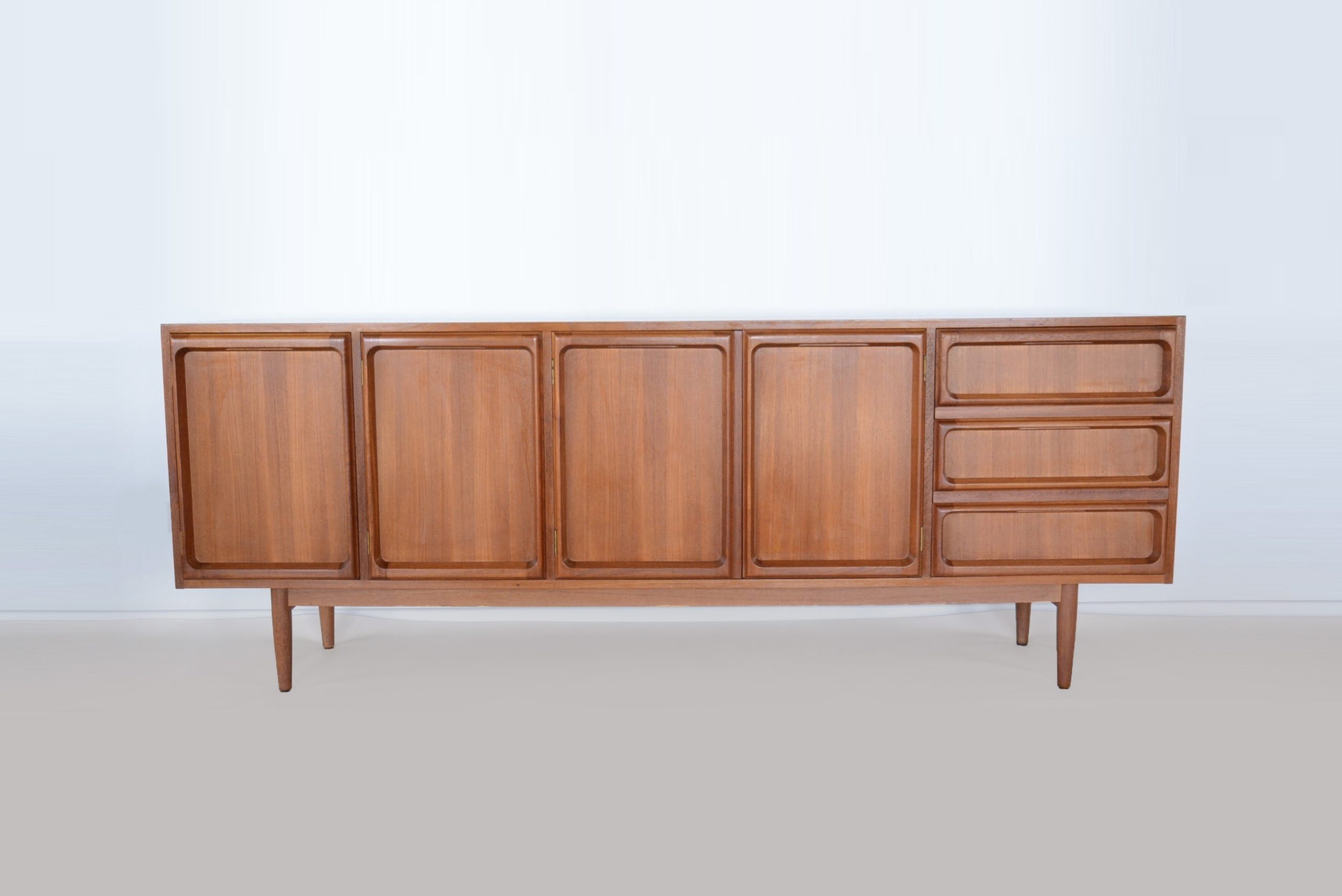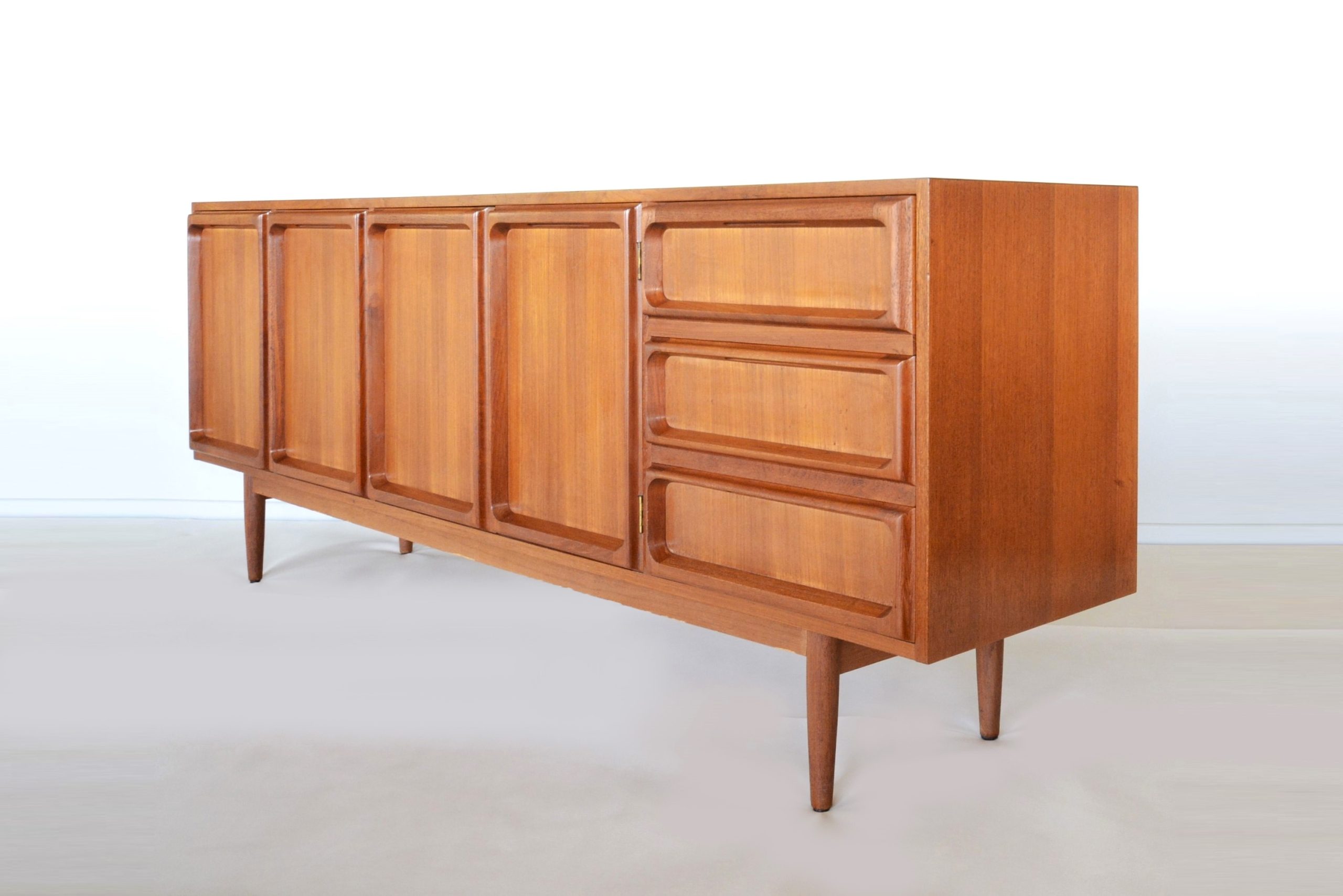 A fantastic mid-century sideboard designed by the Australian firm, Chiswell Furniture, in the mid-1960s. In my opinion this design is the best Australian sideboard of the era- the sculptured bordering in the front sections is stunning. I’d choose this piece above a Danish sideboard because of the unique styling to the front and also because it’s Australian. I’ve never seen any Danish pieces with a design like this- (they may exist but after 23 years in the business I’m yet to see one). I’m proud of the best Australian furniture of the era and feel that this design competes with the English, American and Scandinavian work of the era- its construction qualities are also up there with the best. After studying what’s available in new furniture stores, I’d say the retail price ticket of a cabinet of this callibre would be about $4,000 new (but this is an AUTHENTIC vintage piece). This piece has not been flat-packed and sent from China in the thousands- it will be a statement in your home that’s all your own and one that will continue to increase in value like it has for the full 22 years I’ve been in this business.
