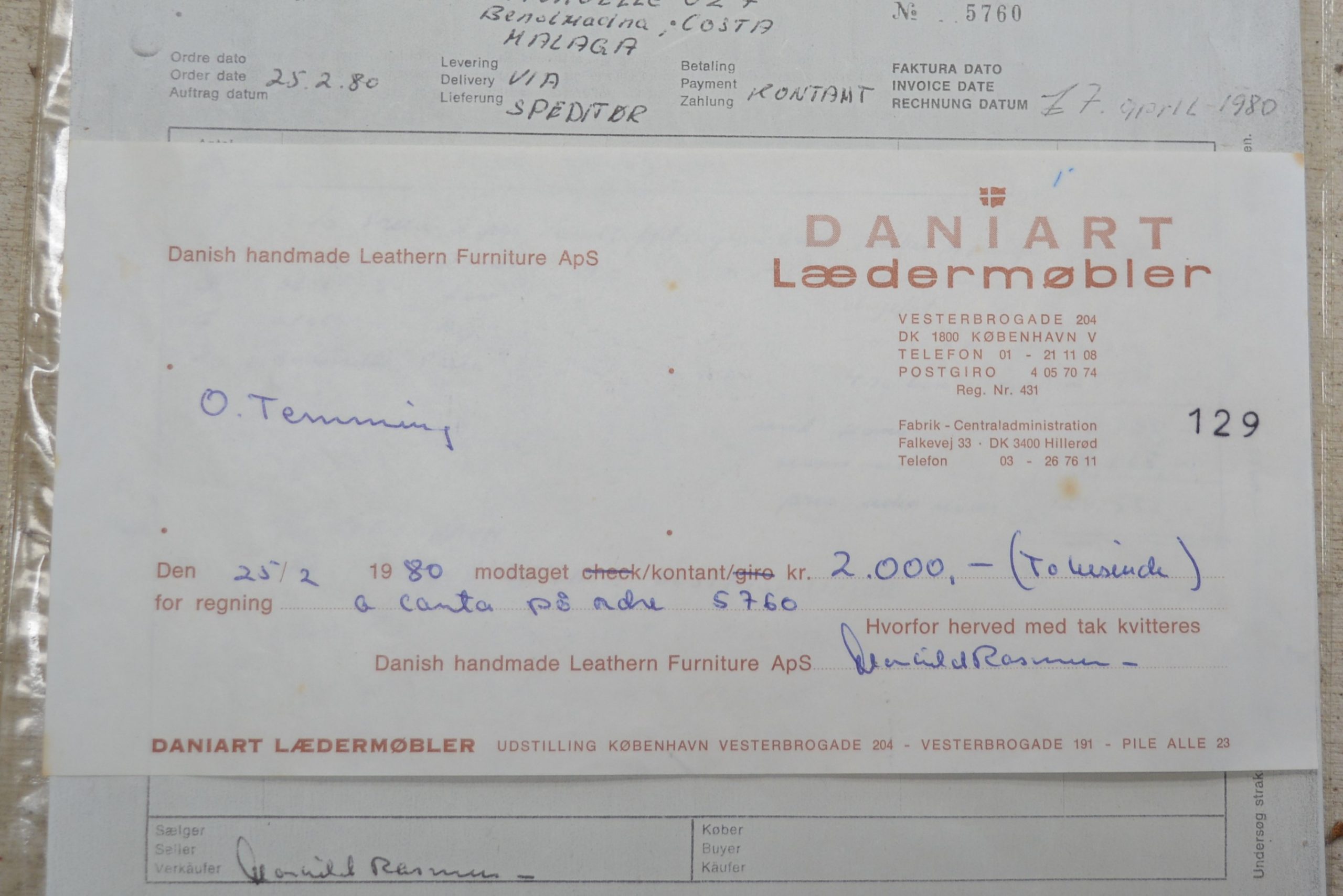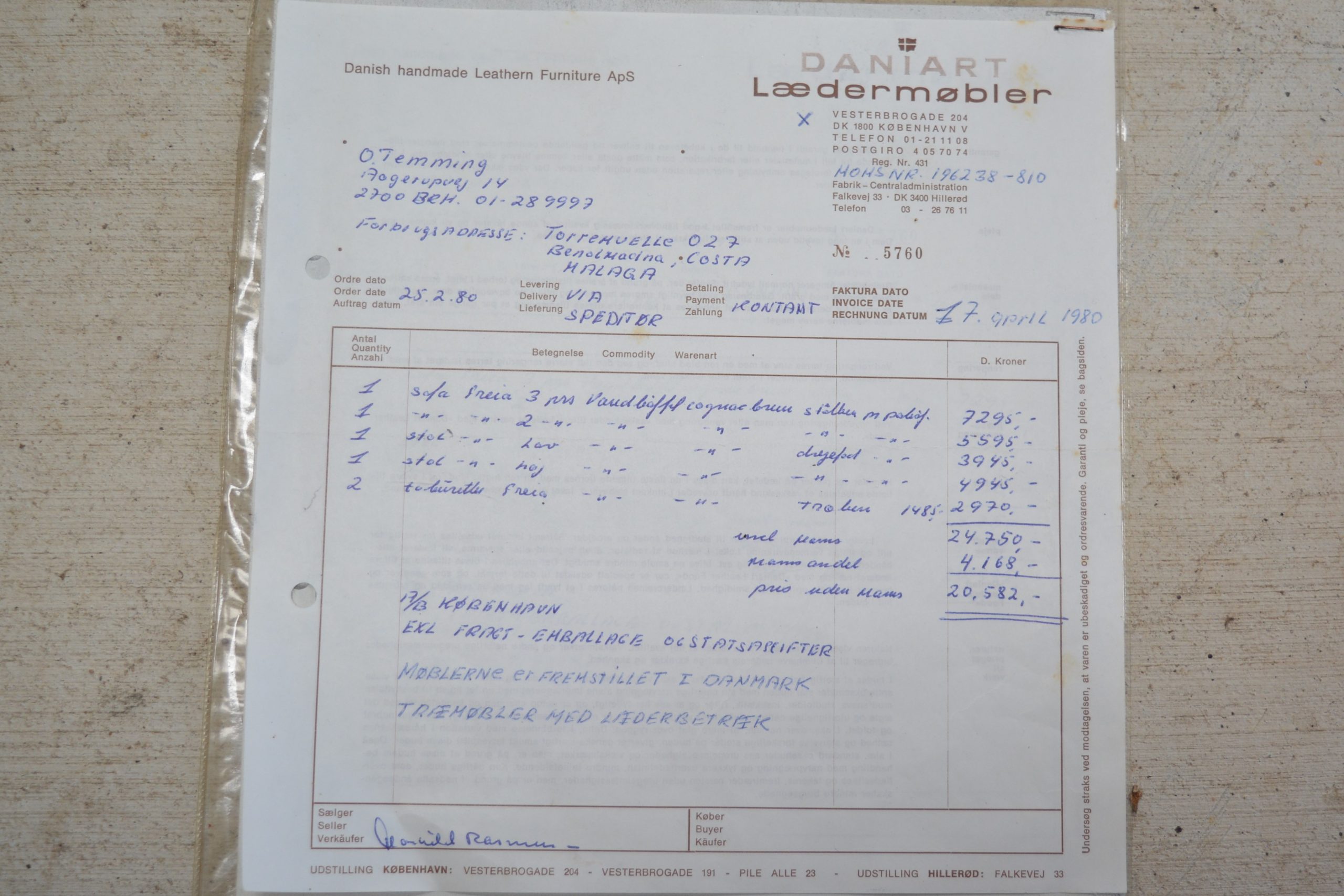 AGE. Very late 1970’s / early 1980. I have a receipt from when this suite was purchased (see the photos) but I can’t read any of the handwriting except the word, cognac (describing the colour of the leather). It was sold in a shop in Denmark (a retail shop in Vesterbrogade, the main shopping strip in Copenhagen). I can clearly read the prices. The FULL suite sold for the equivalent of AU $5500 back in February 1980 (24 750 D. Kroner). That’s out of Denmark- transport to Australia would put up this value up to about AU $6000 at the time. That was a small fortune in 1980. You could buy a house and land package in most Brisbane suburbs for $60 000 in 1980 (4 bedroom, 2 bathroom brick house). With inflation $6000 is worth about $20 000 today (I’ve checked this out on various websites). (But a $60 000 house and land package sold in 1980 is NOT worth $200 000 these days- more like $400 000!) Unfortunately all the letters on the receipt run into each other badly (it’s doctor’s scrawl!) and it’s in Danish so I can’t predict what letters could be. The old letter b for example could be a b or le or li. And then there’s the letter o with a dot on top which I can’t type into Google. The receipt is on a professional printed letterhead of the retail store it was purchased from- the suite was not purchased from the manufacturer.