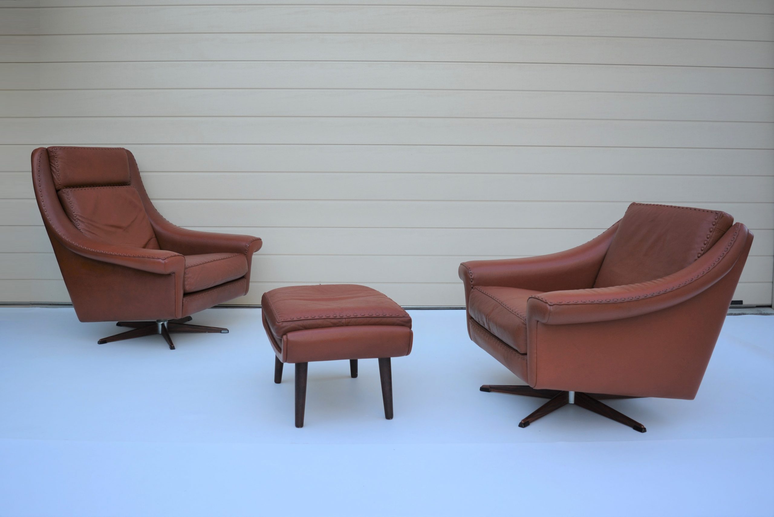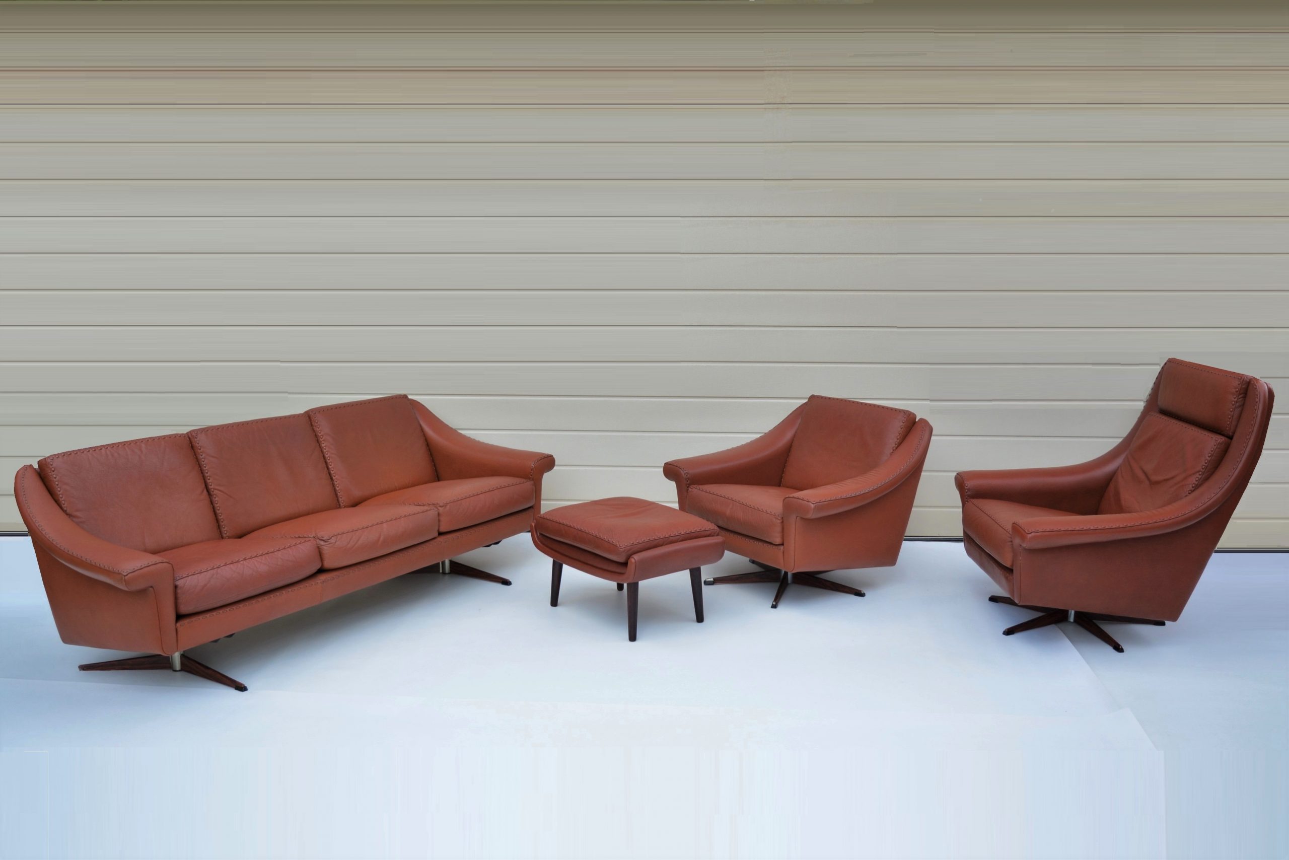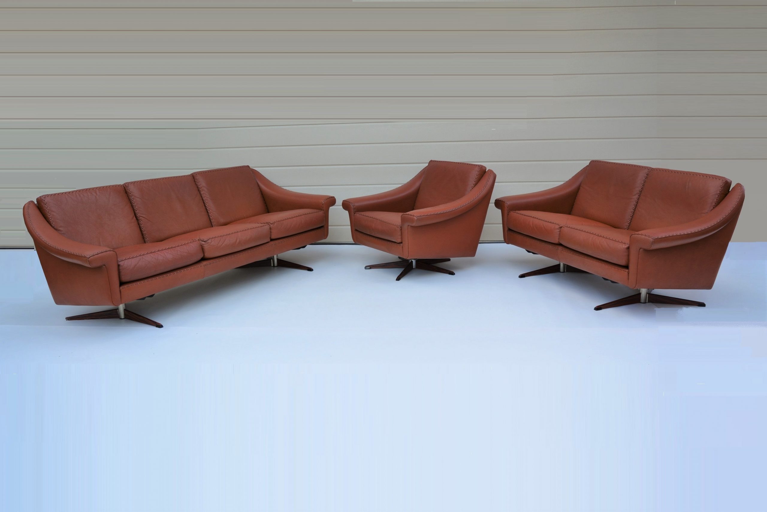 For something that is 39- almost 40 years old and has had use in the main lounge room of someone's home, the full suite is in excellent condition overall. This is FULL-GRAIN LEATHER over the FULL suite- even the back which is virtually never seen in furniture anymore. For the HIGH-BACK swivel chair, the leather on the back, sides and armrests is in brilliant condition for a piece of this age. The leather on the back cushions is in remarkable condition. All cushioning, the inner steel springs in the seat section and the structure of the chair is in brilliant condition with no damage at all because it's all top-quality. The leather on the seat cushion is in excellent condition and presents very well. One cushion has a couple minor shallow cracks forming in creases. (Only about 3cm long). Because they're in creases they're not noticed. I only noticed them when I got the suite out into the sun. They are near the edges of the seat cushion where you'd expect them for normal use. ________________________________________________________________________________________________________________________________________________________________________