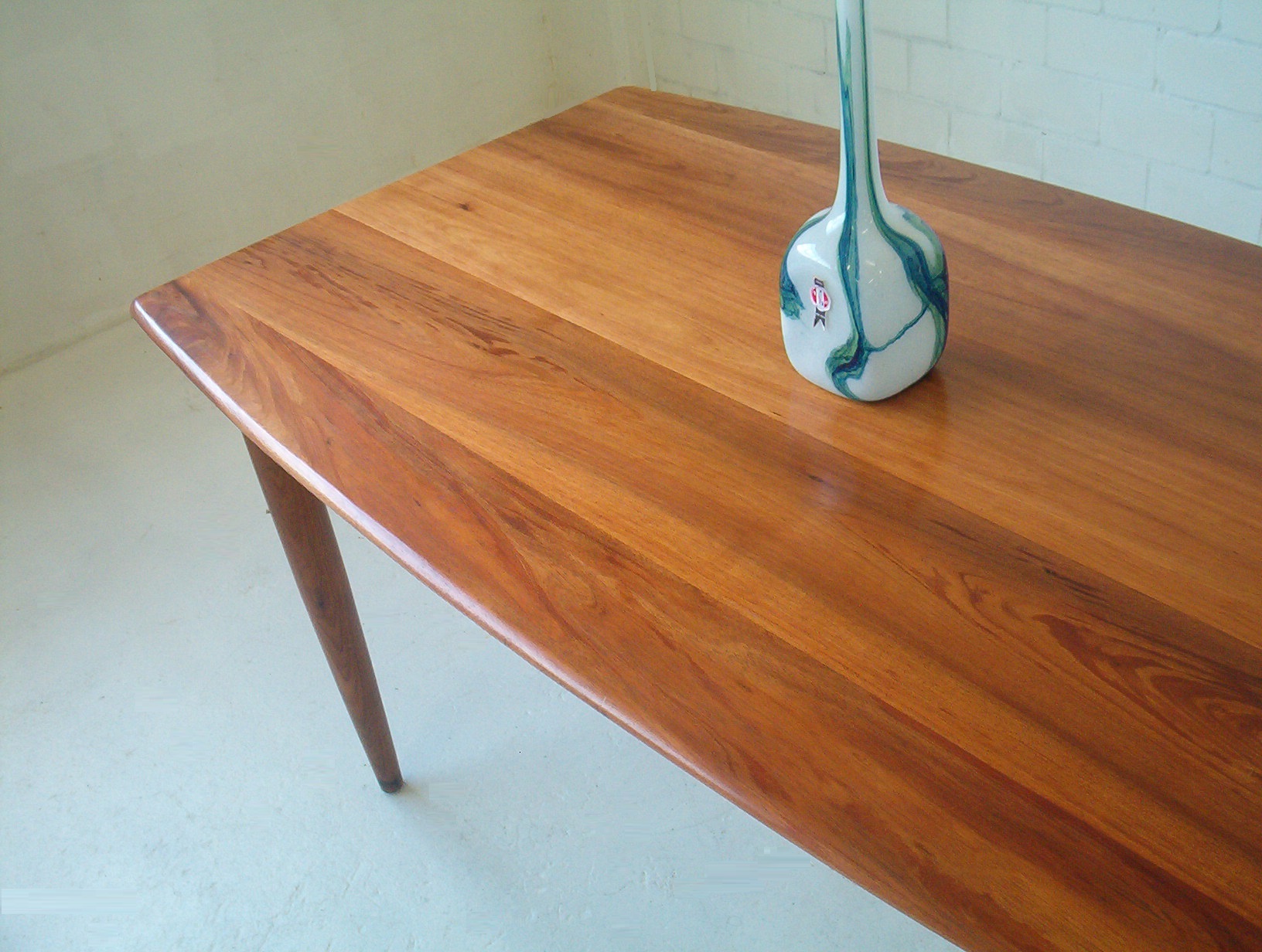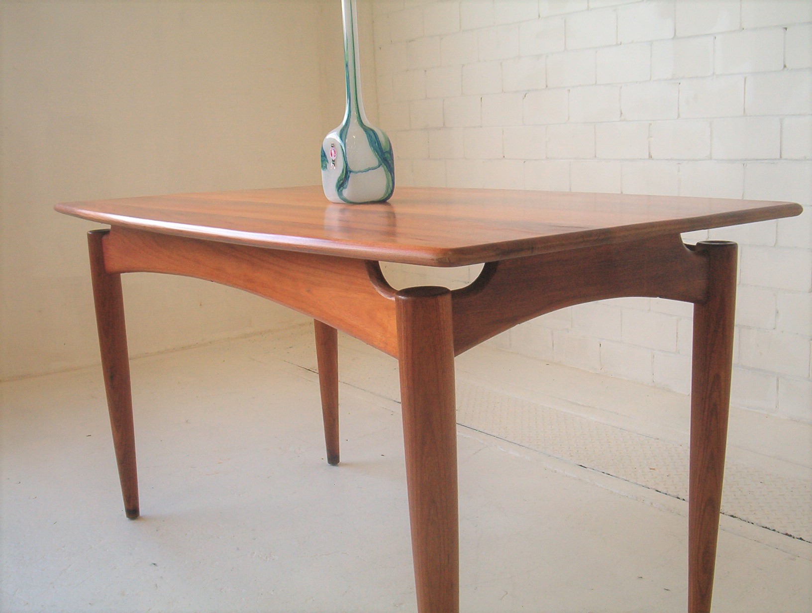 A classy dining table from the early 1960’s (or possibly even 1950’s). This piece boasts the very best quality workmanship and design. This is the only table in this style I’ve had in the 7 years I’ve been doing this that has a solid timber top with NO VENEER. No crappy Parker table “Weetbix chipboard” here that can swell, bubble, chip and can only be sanded back once or twice before it ends up as landfill. This table is meticulously constructed with solid timber planks that can be sanded back as many times as you want, making it a LIFE-TIME investment and something to be passed from this generation onto the next. This table has a beautifully refined style of Danish furniture. It could be a Danish piece but I think it’s more likely to have been made by one of the boutique makers of the era such as of the Rosando Brothers, Jakob Rudowski or Dario Zouref. It appears to have the design features of a couple of Jakob Rudowski pieces I’ve seen but I have no idea who made it. It has been crafted beautifully from solid timber and it’s a more “exotic timber” (not the standard teak and blackwood you usually see from the era). It looks like it could be Tasmania Myrtle but I don’t know for sure.