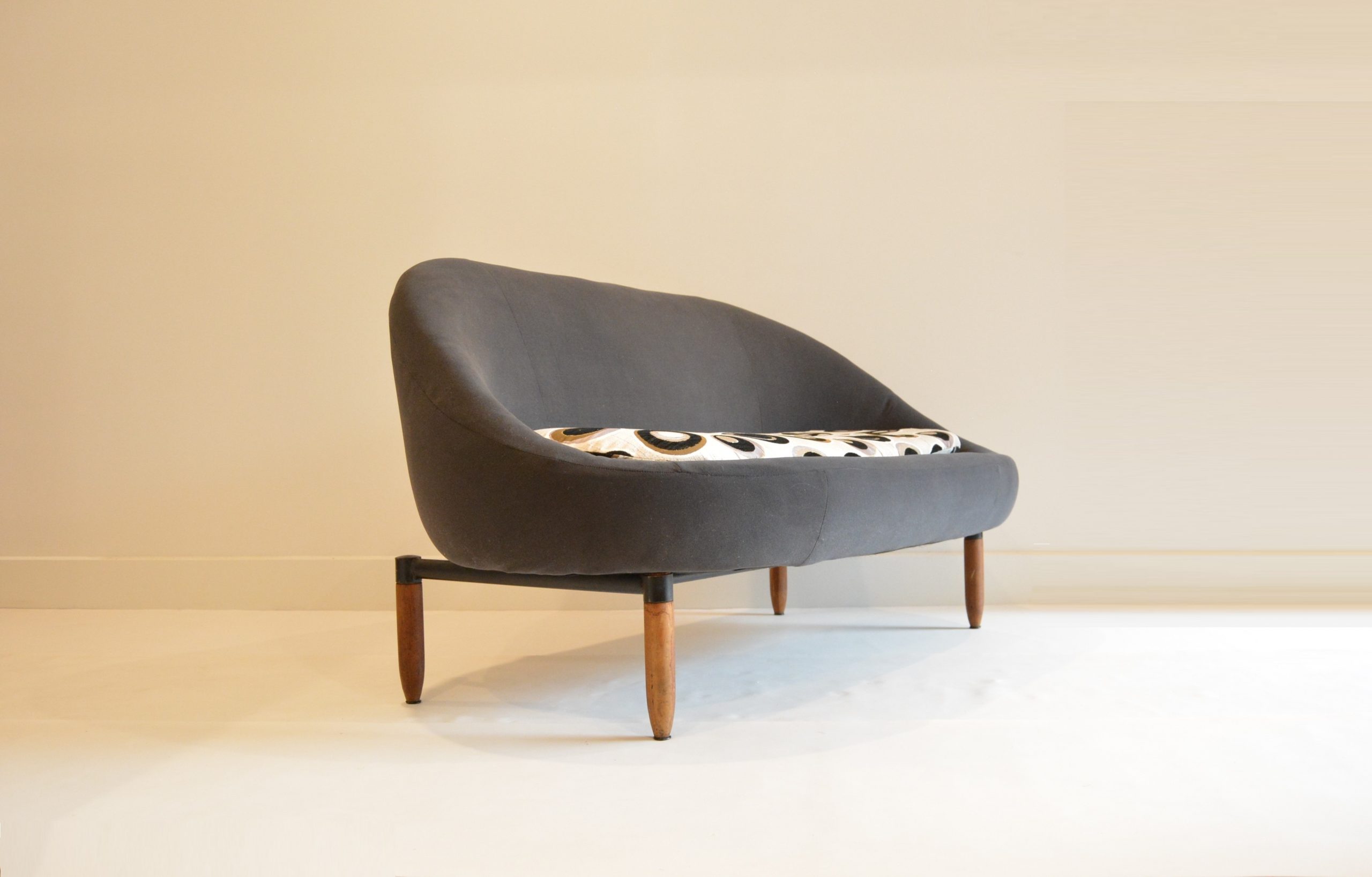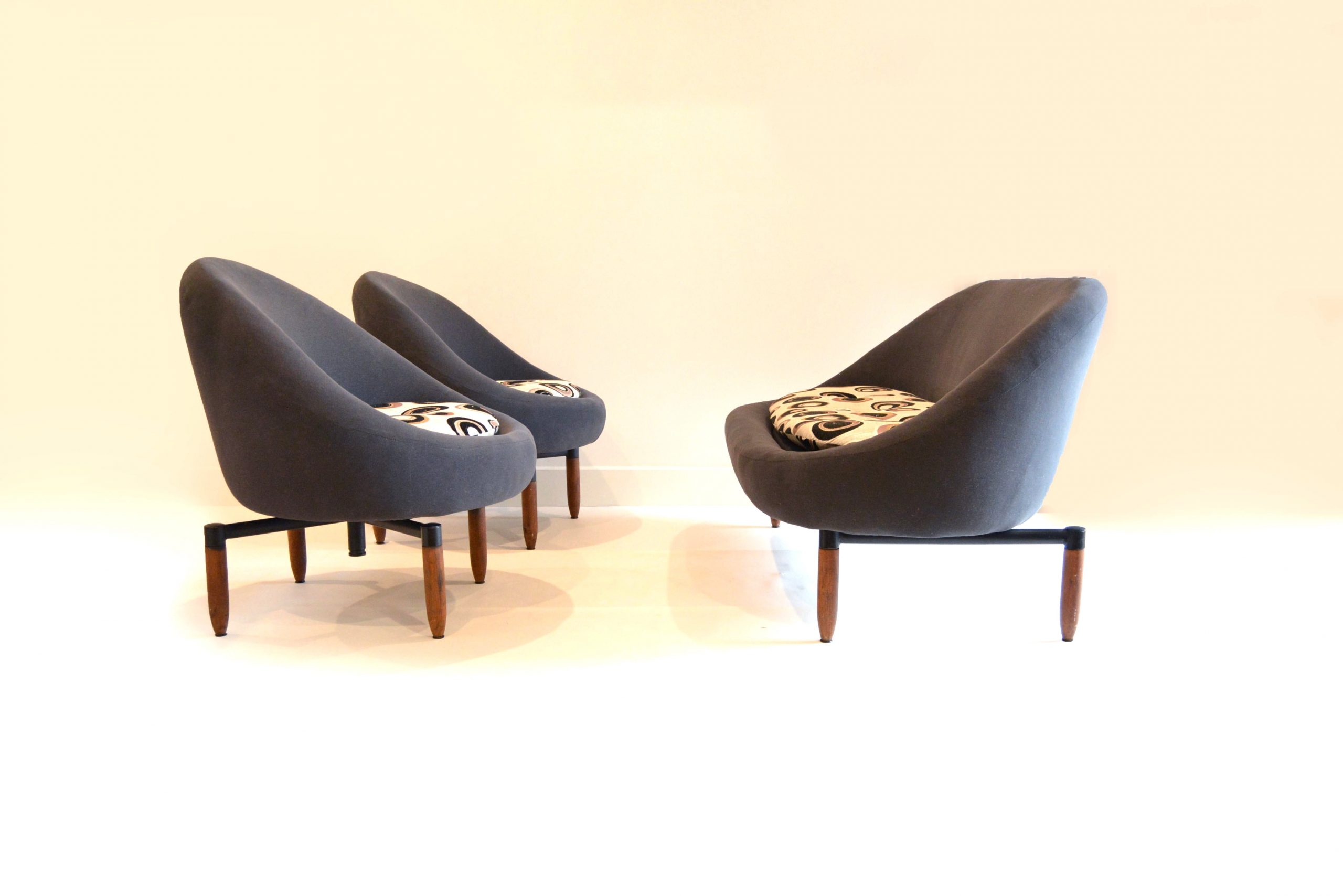 This suite was produced in the late 1950’s in Moorabbin, Melbourne by Isobel and Gerard Doube. The full suite was recently re-upholstered- the sofa still retains the original Doube makers label. There’s virtually no information online about Doube except that they won various design awards back in the 1950’s. I saw a couple pairs of these chairs in Google Images but when I clicked on the image it went nowhere and there’s also a couple of Doube pieces in Images in different designs that are definitely 1950’s. This suite is rare- after 21 years in this business it’s the second Doube suite we’ve had (and I only got the opportunity to stock both these suites because I offer a consignment sale process). I’ve perhaps seen this design 4 times over 21 years (and only twice ever in the flesh)- that’s about as rare as you can get! Much rarer than Featherston and Snelling designs. And I think it’s as cool as anything done by Featherston.