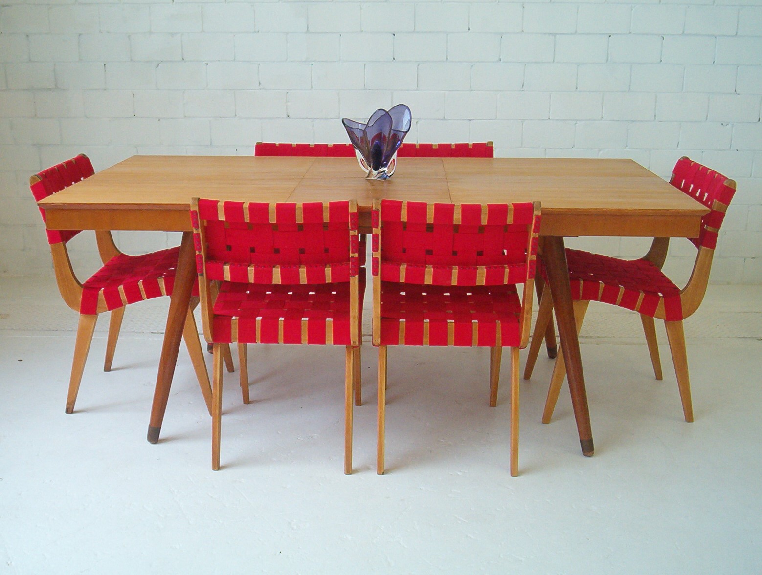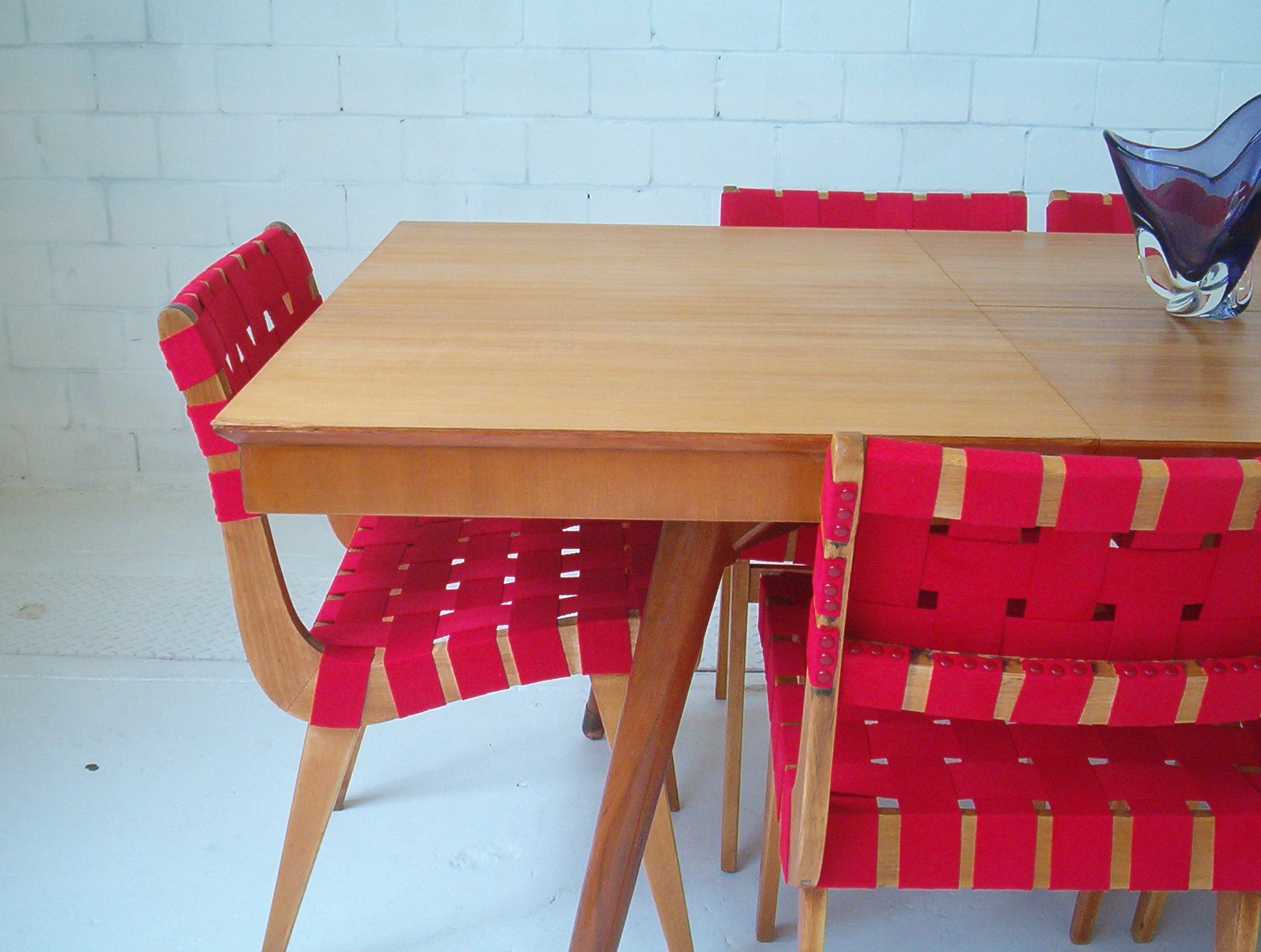 (These Snelling dining chairs sold through iNVISeDGE in 2006 for $3,000 for all 6. Four of them had Snelling Functional Products labels. All six chairs had been completely refurbished with new webbing (that was professionally dyed red). These chairs are worth similar today (2019). I haven’t sold a set of these chairs for some time now because there are now replicas on the market. Values have not gone ahead like lesser known vintage designs where there are no replicas around.)