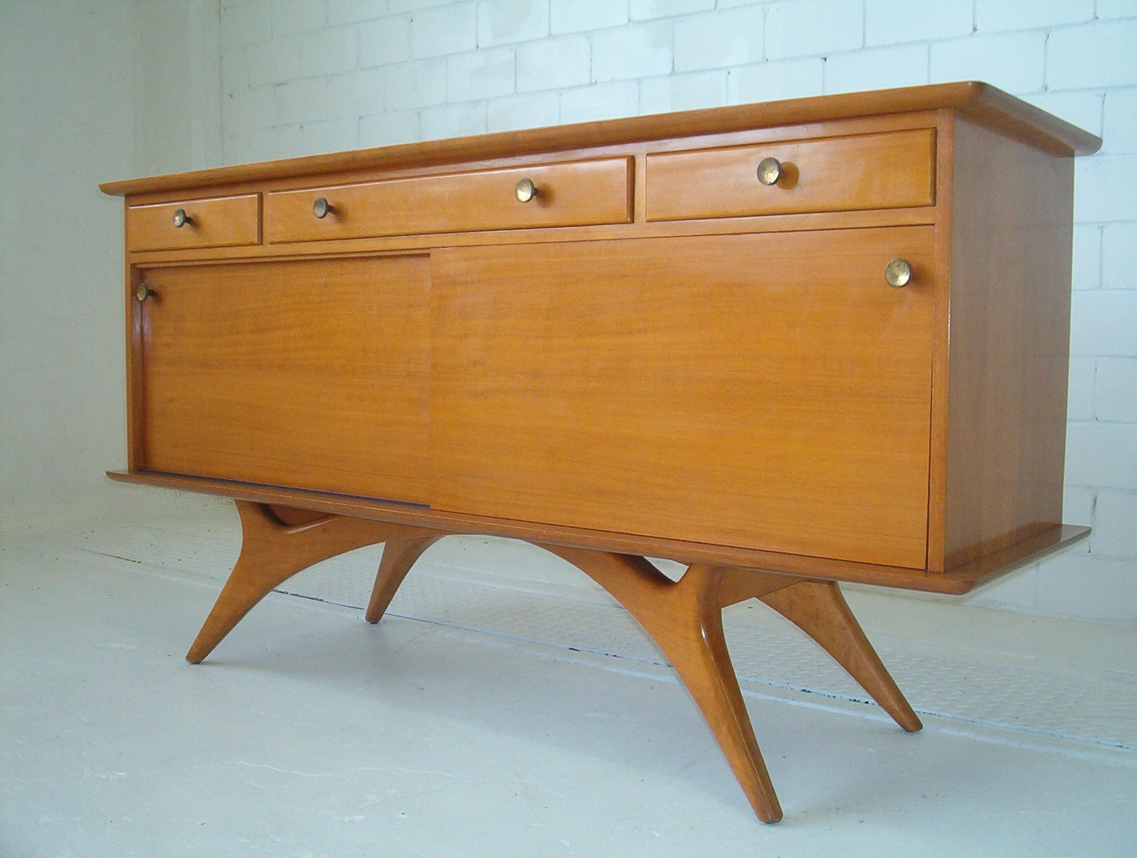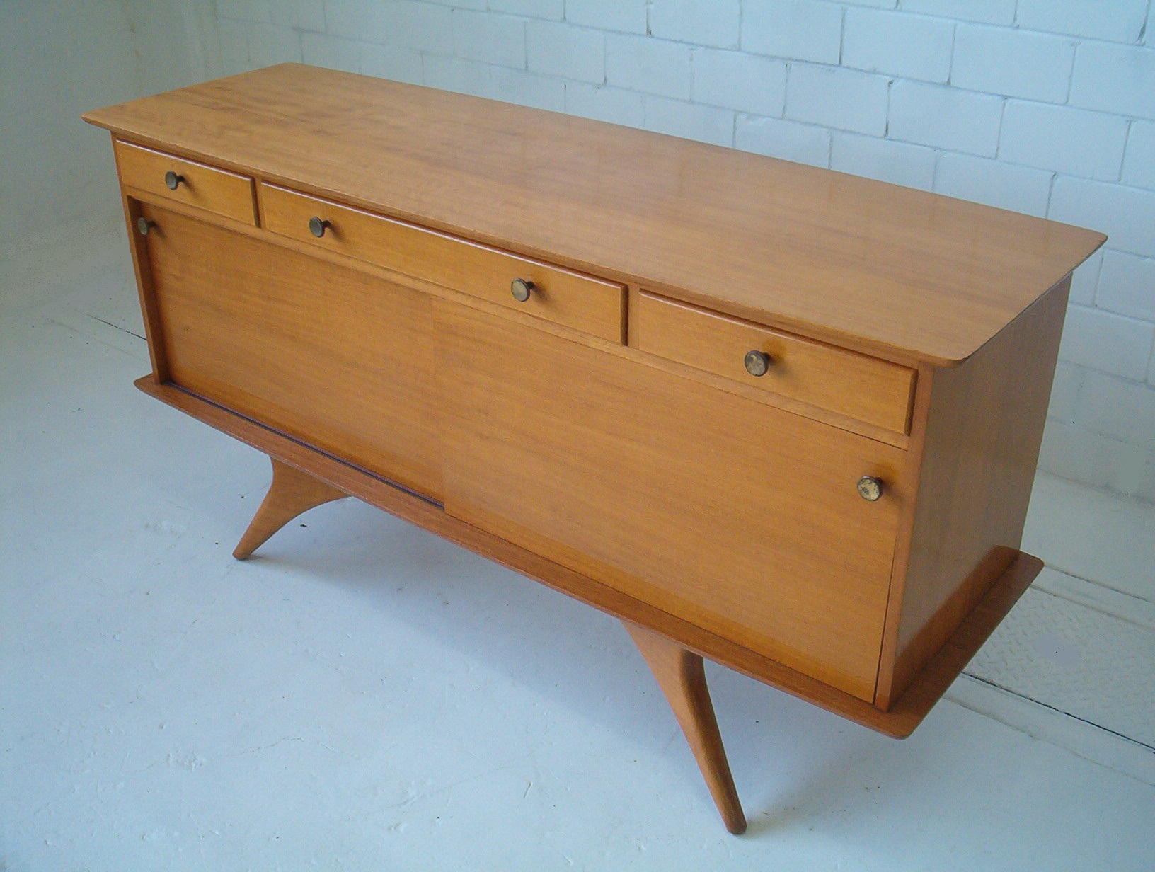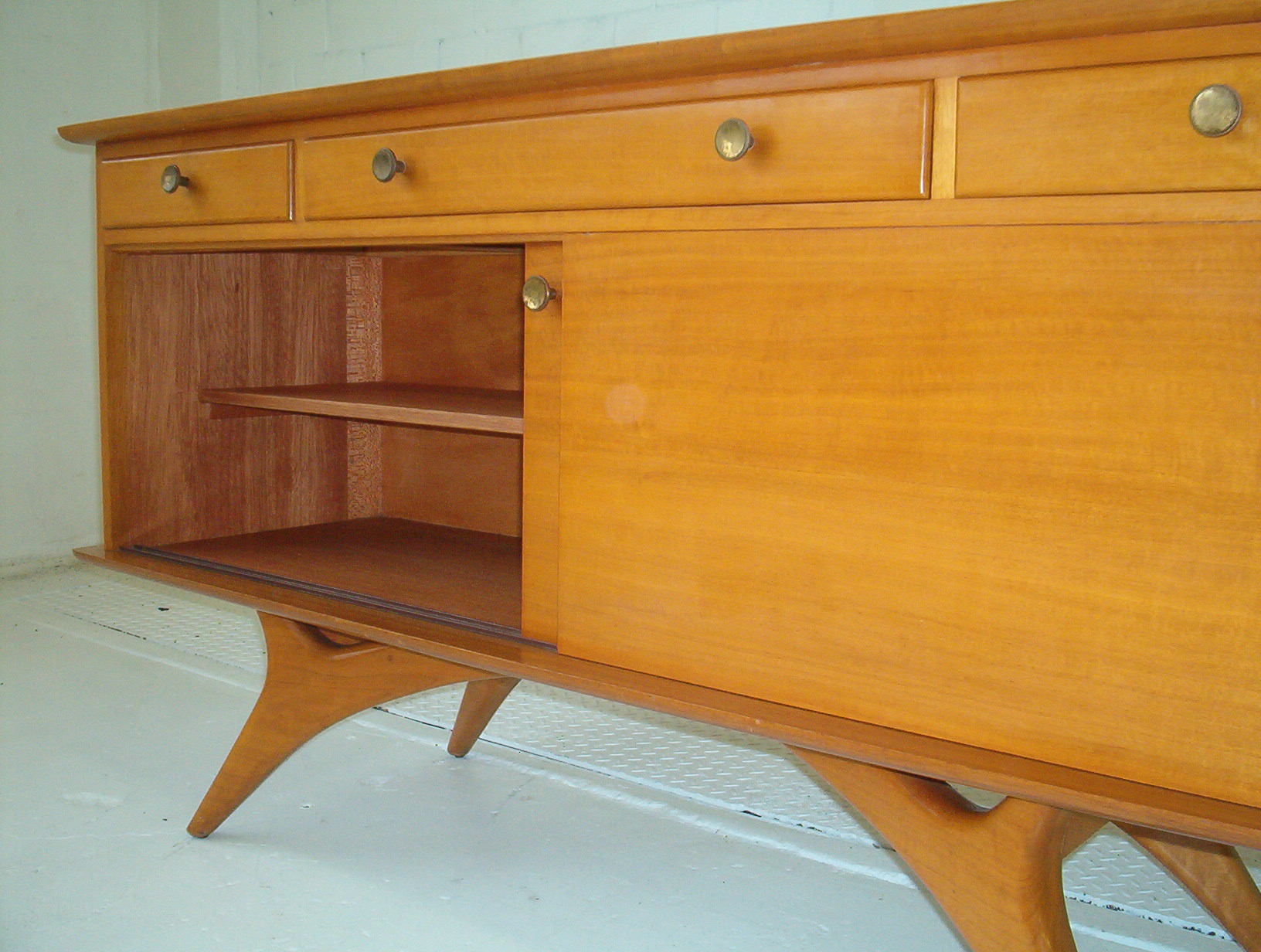 One of the best pieces I’ve ever stocked, this exceptional 1950’s sideboard was created by Edward Hill of Sydney in the 1950’s. Featuring as stunning base with splayed legs and plenty of curves, this vintage piece is a real gem. It was through some interesting detective work (!) that I ascertained this piece was done by Edward Hill of Sydney. There’s a small section of his maker’s mark on one drawer just enough to be certain it’s by this highly-regarded furniture maker. All of Edward Hill’s work reflects amazing design qualities and outstanding craftsmanship (much of which was done BY HAND)- this piece is up there with the best sideboards I’ve seen.