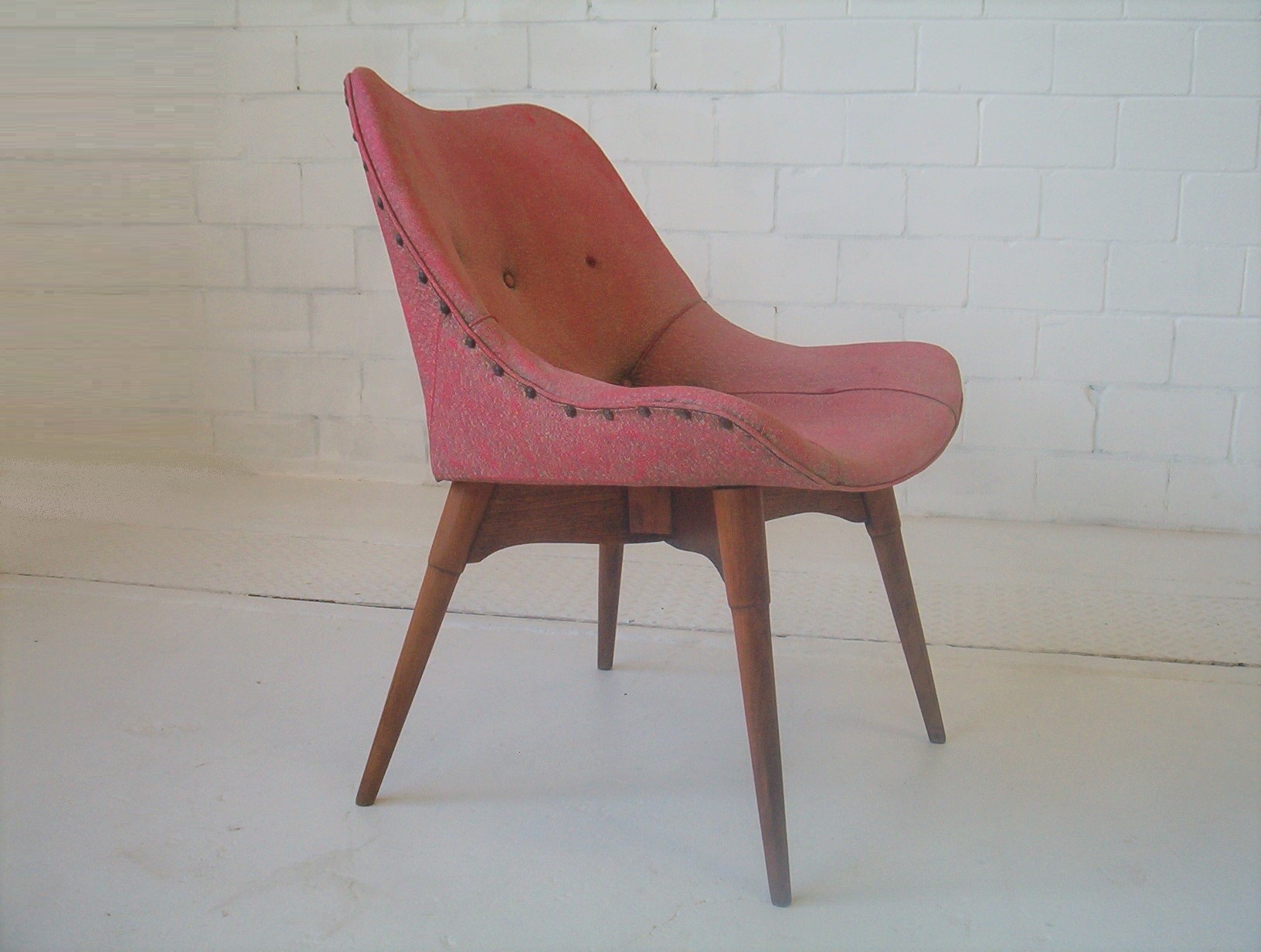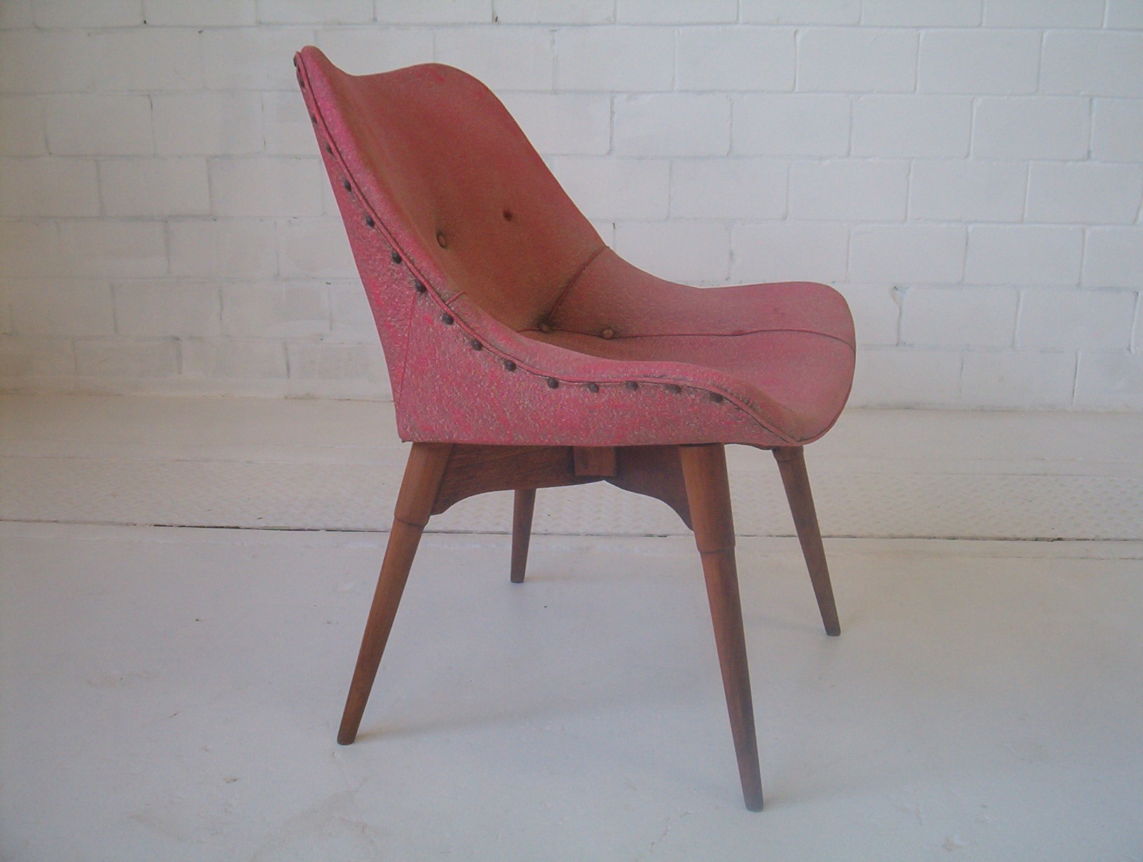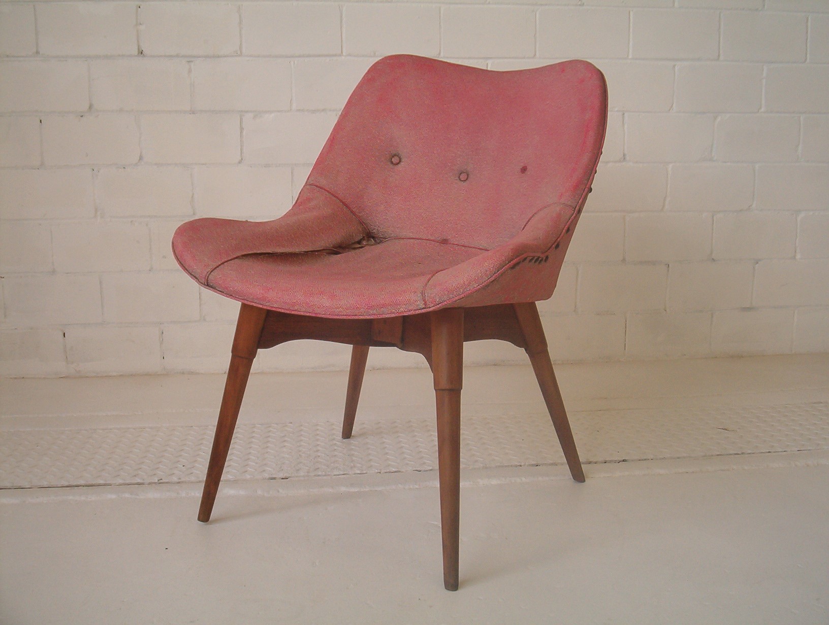 A GENUINE and fully ORIGINAL VINTAGE Contour chair designed by Grant Featherston in the mid-1950’s. I’m not sure of the design number of this one. It looks like the A310 but without armrests. It’s a beaut side chair or could even be a contour dining chair. This design is rare- I can’t find many photos of it online. The value of this particular chair is tied up in it’s historical appeal and the fact it’s fully original. Of course it looks a little worse for wear these days- everything does after 70 years! If you want a perfect “vintage” chair buy one of those God-ugly things coming out of China. I’m not saying that God is ugly here. God is the most supreme thing that exists. What I’m saying is that the God-ugly replicas are the “most supremely-ugly thing” you can possibly put into your home.