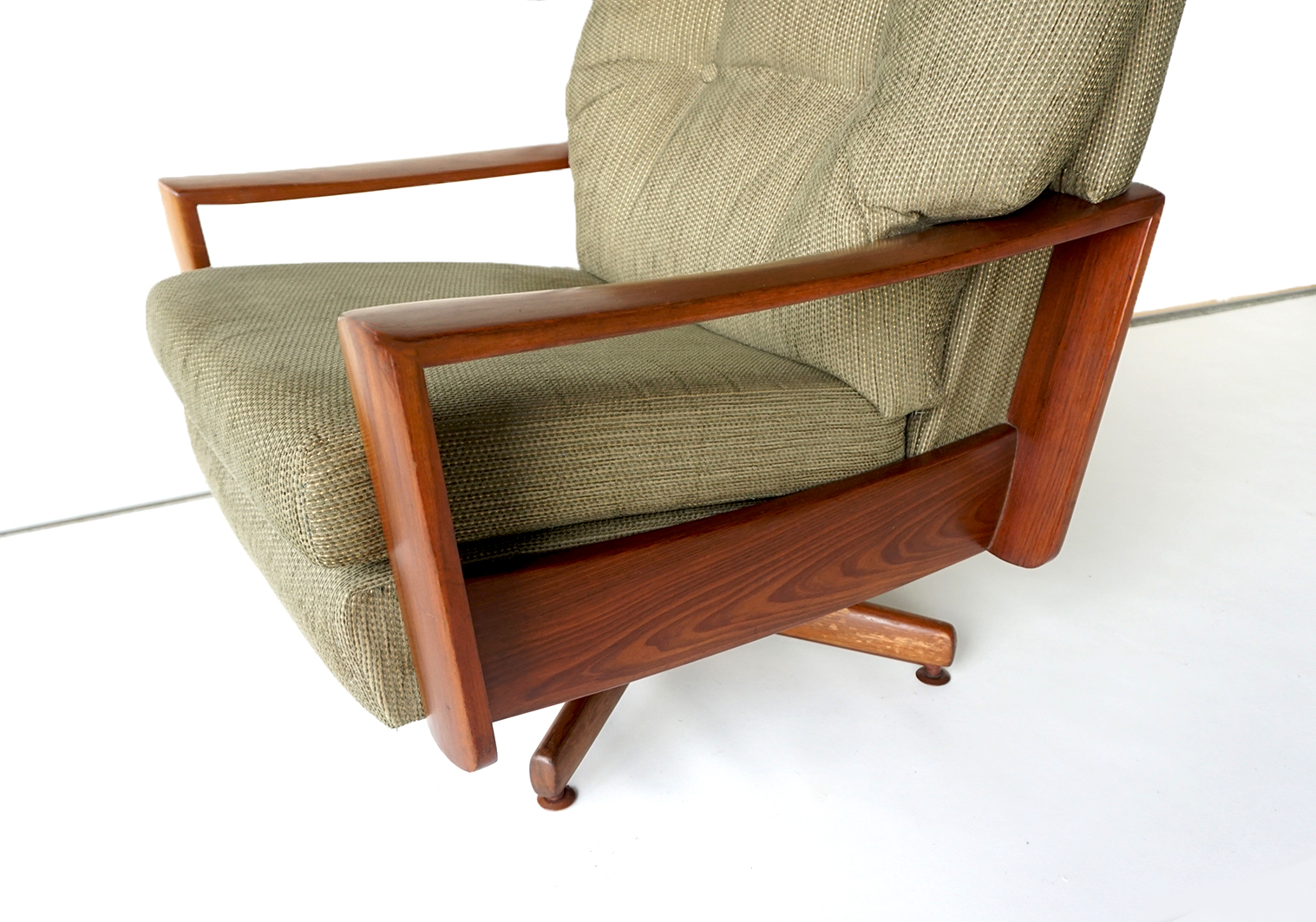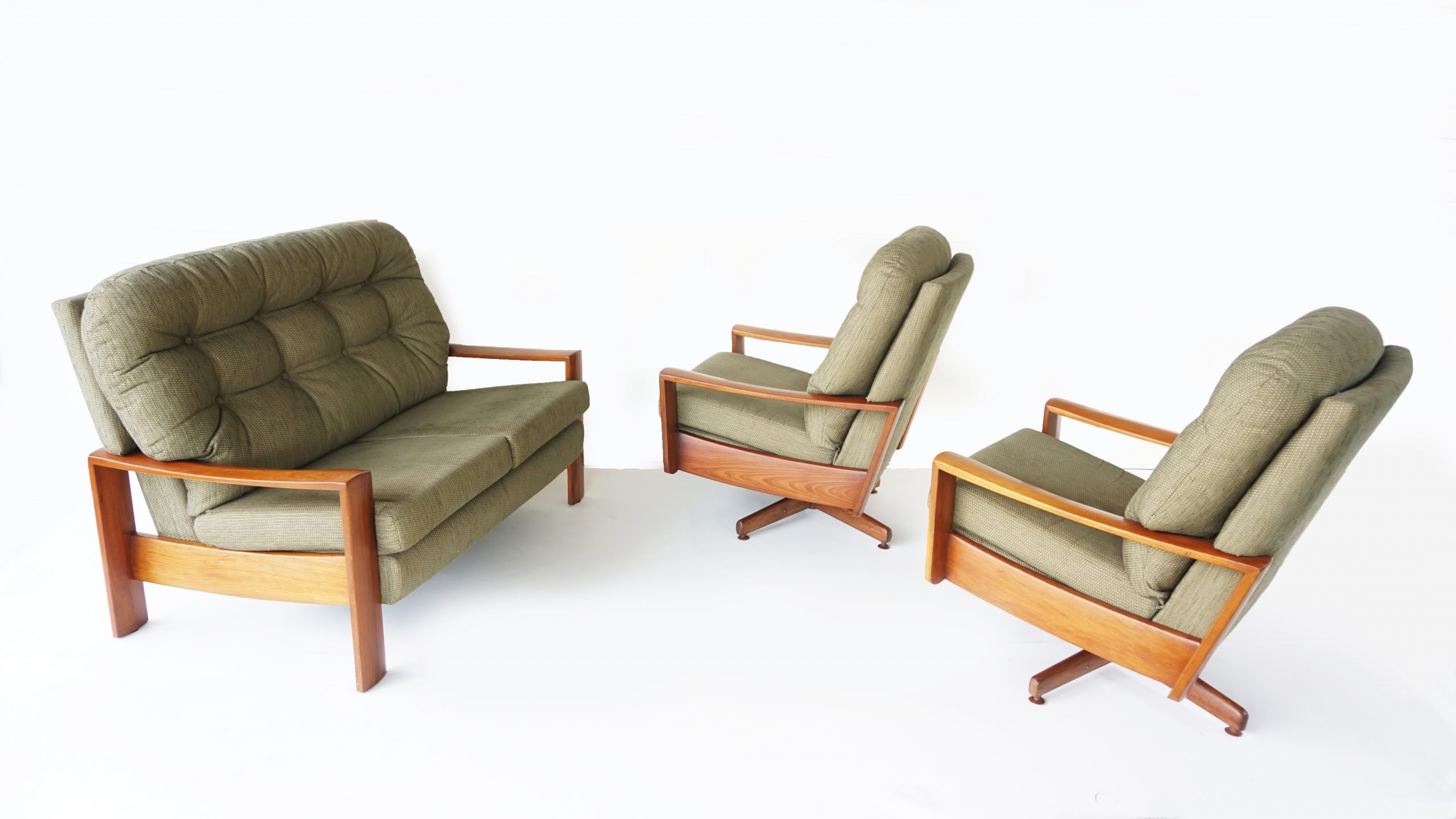 FLER swivel chairs designed by Fred Lowen and Ernst Roddeck in the mid-1960’s. (Price is for one chair only- this price was marked down during lockdown- but we have various pieces available from this suite.) This design, called the FLERENA, came out several years before the famous T21 by Tessa- the T21 draws strong inspiration from this earlier FLER release. FLER re-branded to become TESSA in 1969. I like this design just as much as the T21. It’s more minimalist compared to the T21- the exposed timber frames are classy and stylish. The timber will also add warmth to your space.