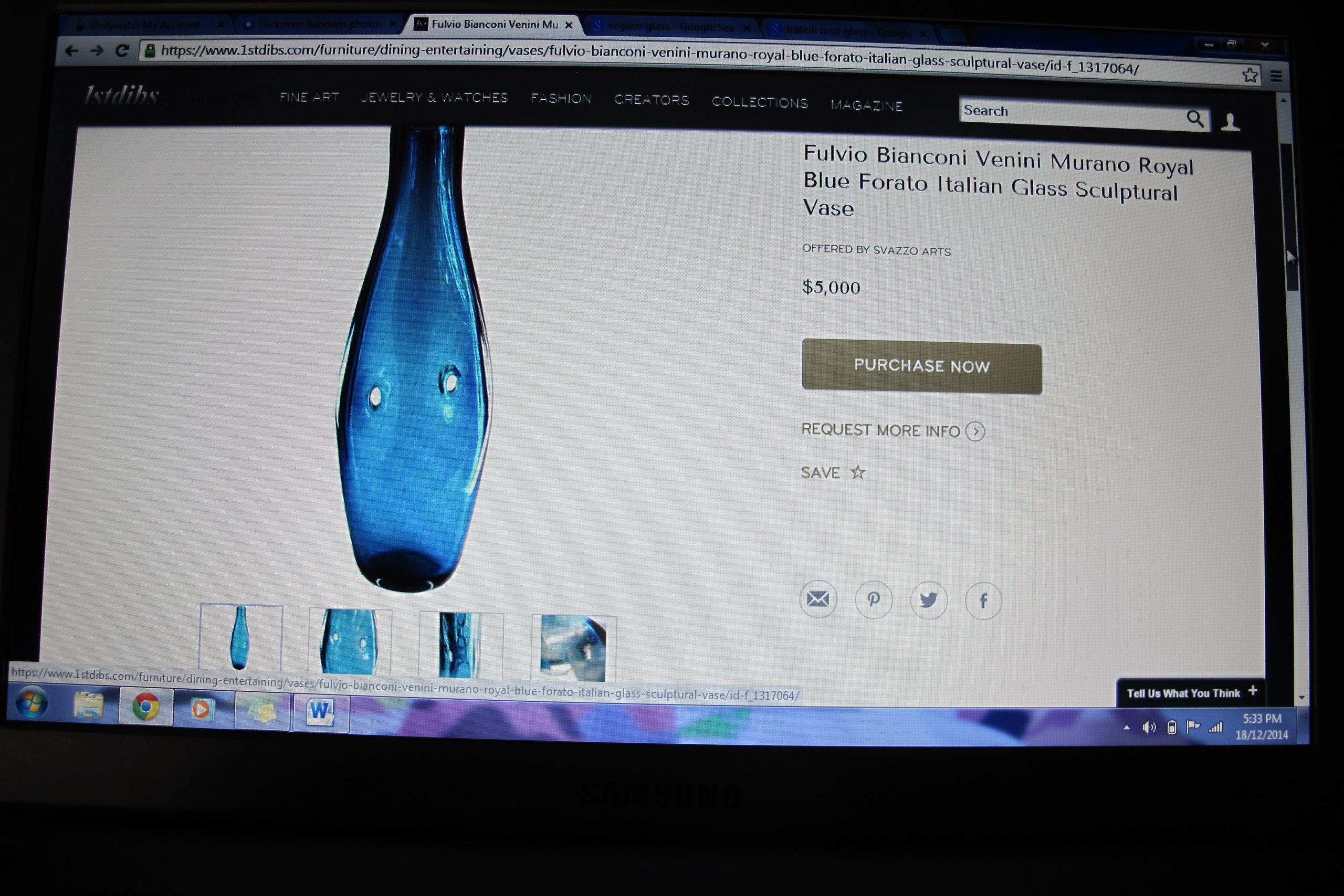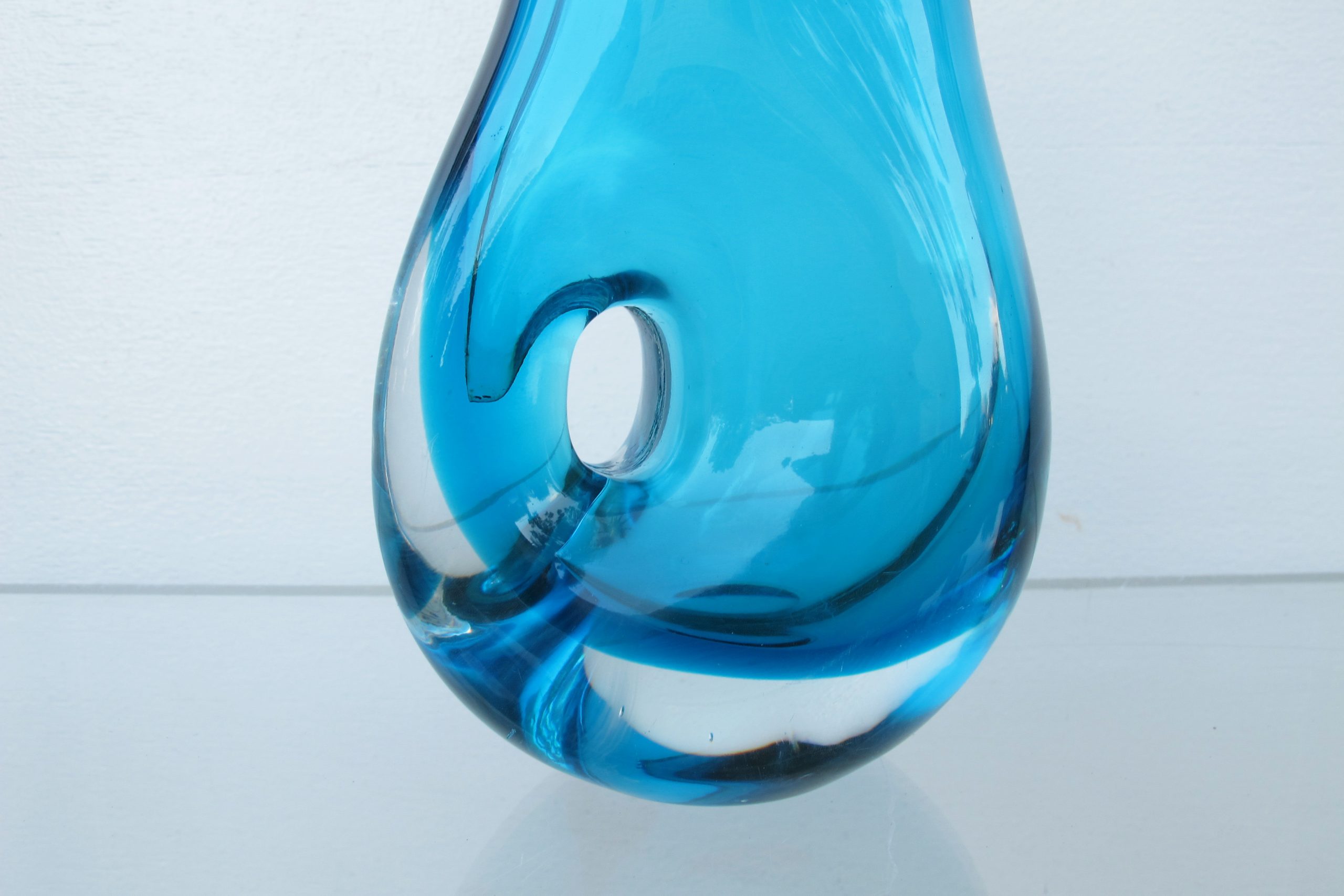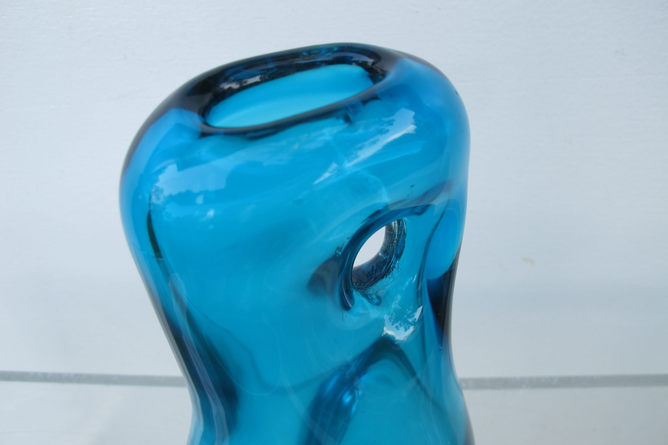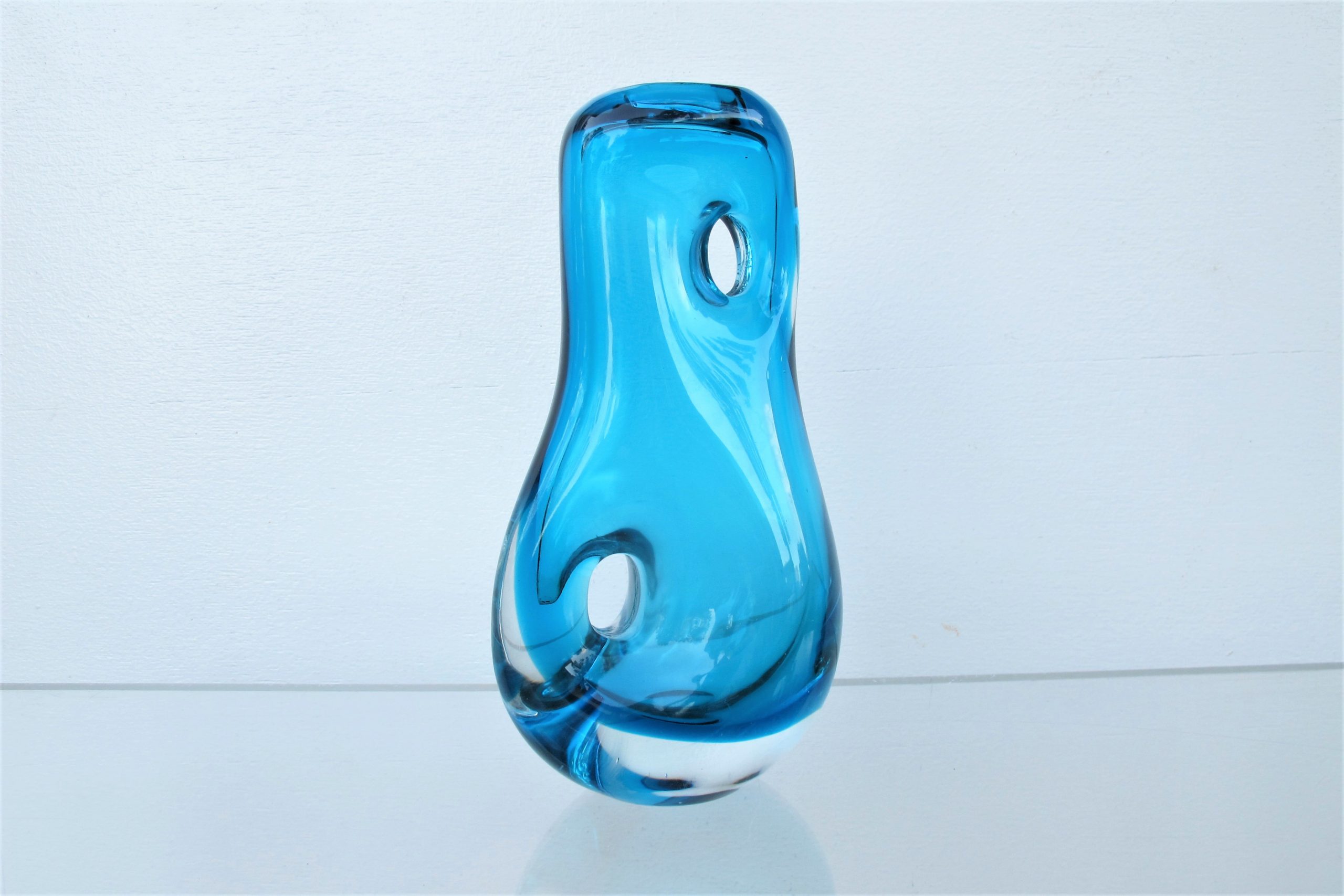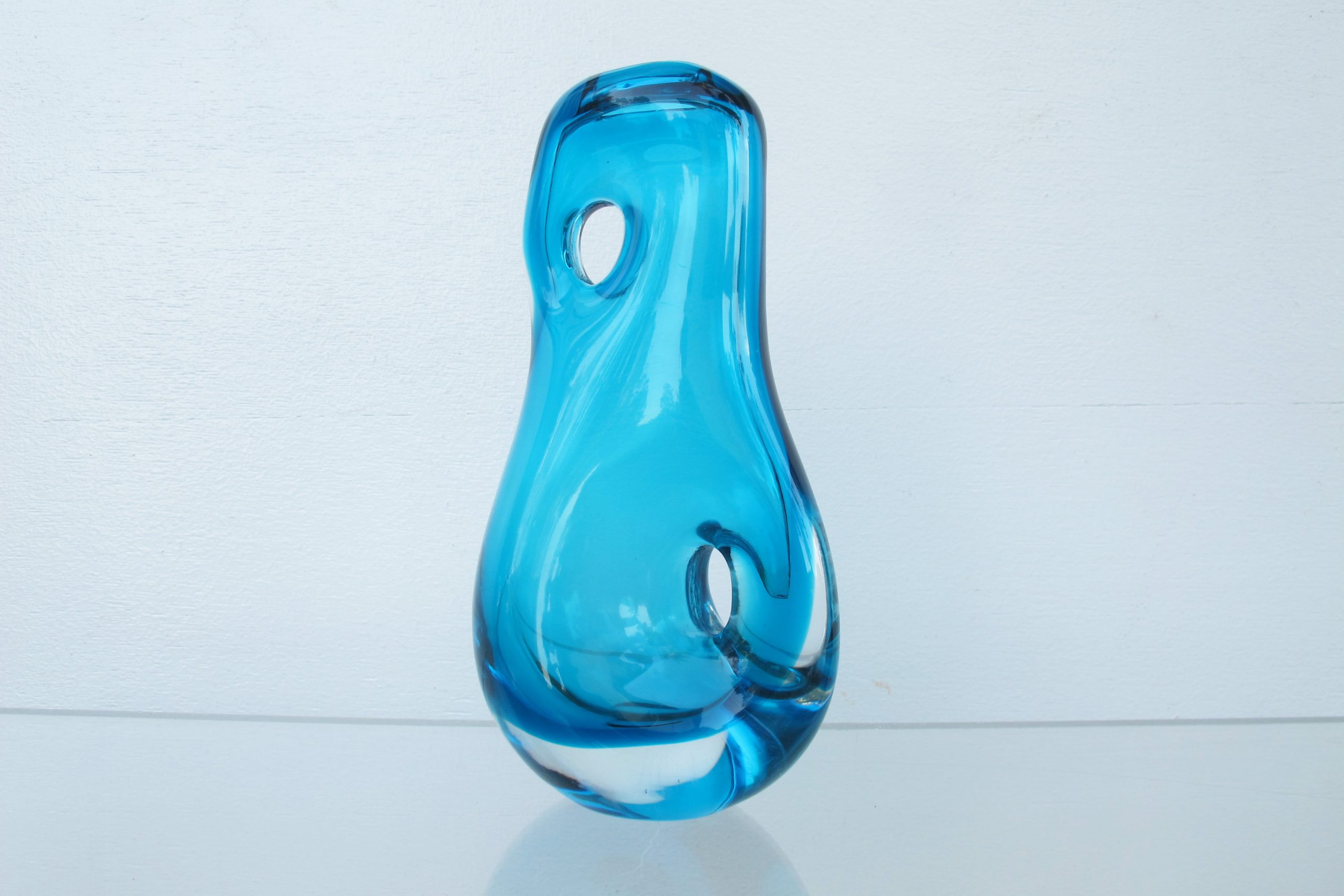 A piece of vintage Italian art-glass from the Murano region. I’ve held onto this one for several years hoping to find a definitive maker. I believe it was done by Fulvio Bianconi. He first did these designs with holes during the late 1940’s and carried them through into the early 1950’s. I believe this came a bit later (maybe later 50’s)- it’s a lot more sophisticated than the early ones I saw online. There is no signature but I’m certain it’s a piece of vintage Murano but by whom I’m not so certain. One thing is for sure though- this style of design is ridiculously rare and must be near impossible to do by hand (it’s obvious this is a HAND-MADE piece). I’ve Googled the internet for ages and found very few like this. One of the Bianconi pieces I found on-line was on 1st Dibs for US $5000- US$5000 was average for this style, many were more (the US$5000 one has been included in the photos above). The 1st Dibs one is relatively flat- the piece on offer here has a wonderful biomorphic shape- it’s an incredibly fluid, curvaceous piece. The colour is distinctly mid-century Murano particularly with the clear base. The workmanship required to create this piece is nothing short of inspiring!