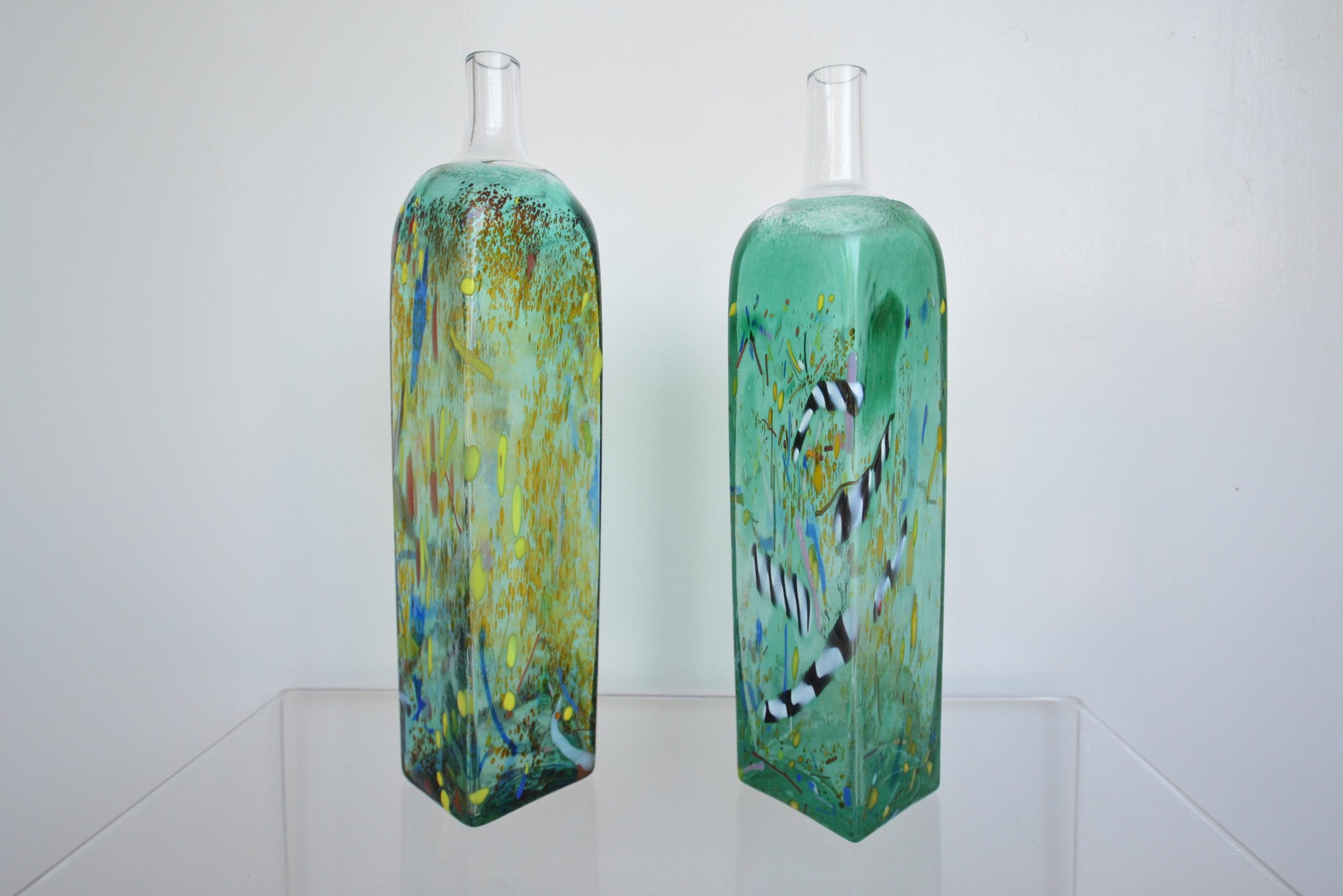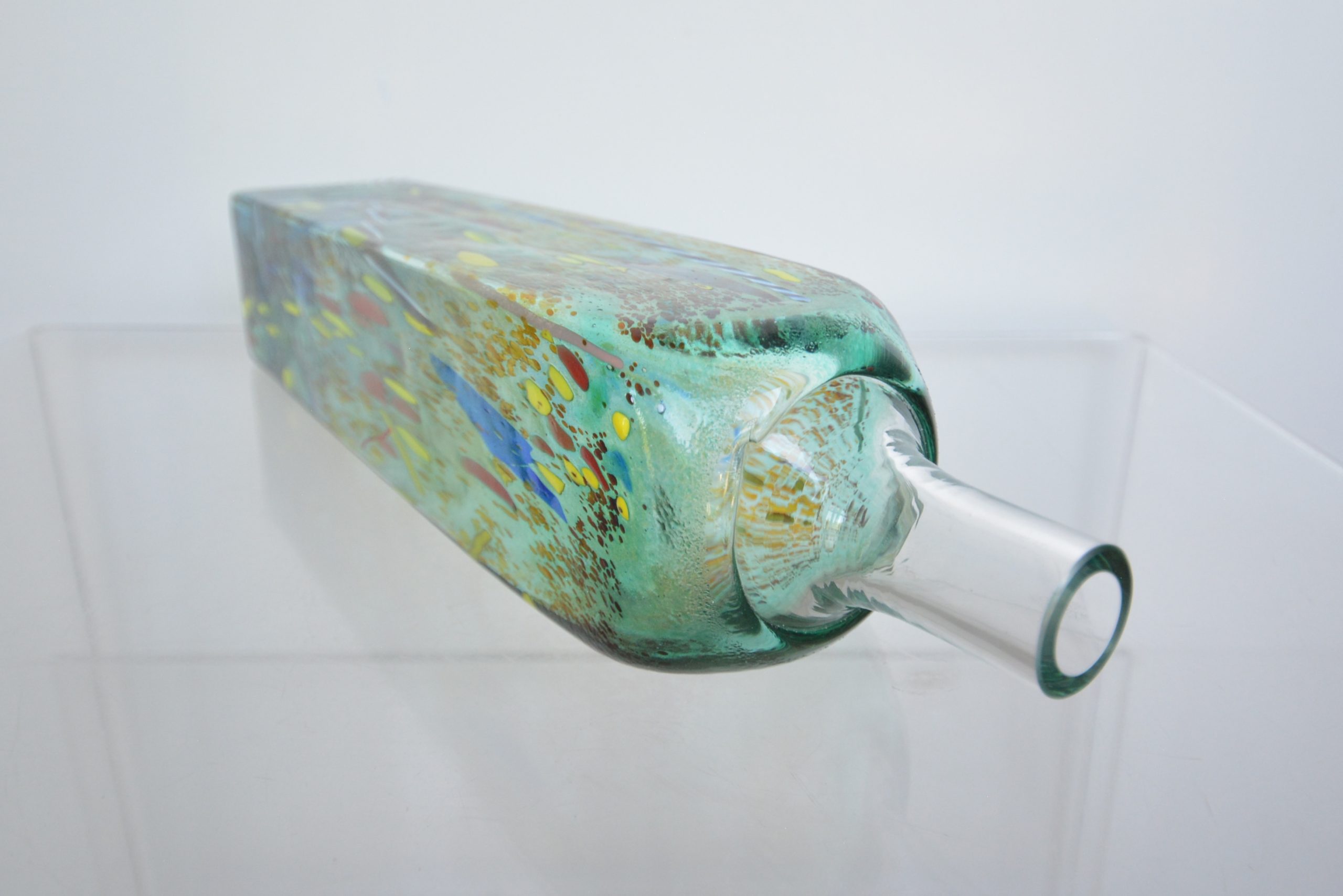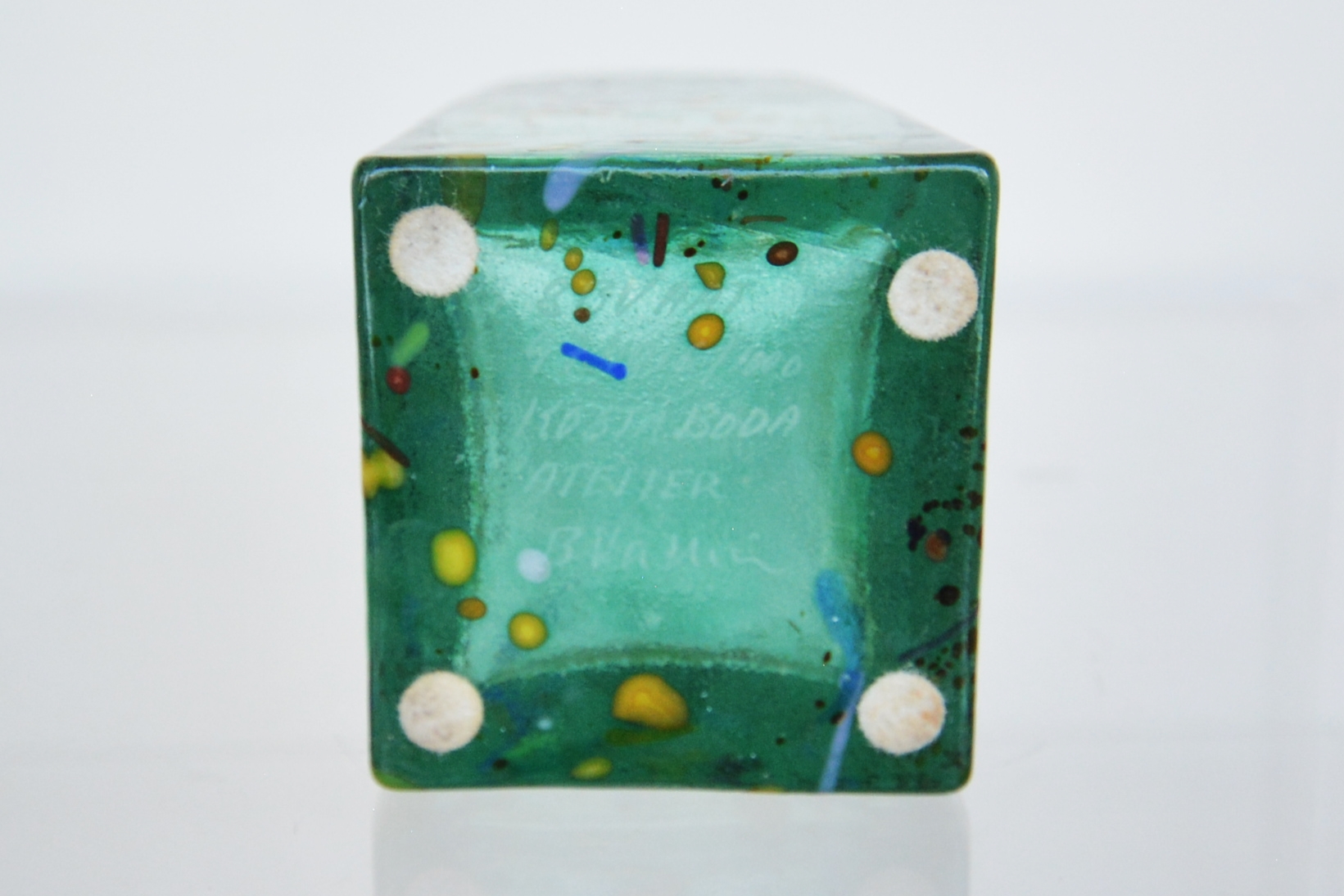 A large Limited Edition piece designed by Bertil Vallien for Kosta Boda. This piece is signed to the base, “8BVAAT 974016 – KOSTA BODA ATELIER B VALLIEN”, which verifies it was done as a limited edition. The second vase I have in the same design has exactly the same base marking with /1000 after the design number. This signifies that this design was made in a run of 1000 pieces only. Atelier means “studio” in French but the word has been adopted worldwide. The unique pieces and pieces done in small runs were made in the private studios (ateliers) of the professional artists. I’ve scoured the world online for some time and have seen one other photo in this design- that piece sold some time ago. There are none for sale at the time of writing that I came across. This one has really grown on me. I love how a lot of the glass is transparent. What this does is bring the back surfaces to the front with differing intensities. The decoration at the back gets washed out and is seen as various blurry splotches which adds to the depth of the piece. You get lost in this vase and I’d say this was Bertil Vallien’s intention- it creates a dreamlike state where images seem to be floating with no beginning and no end.