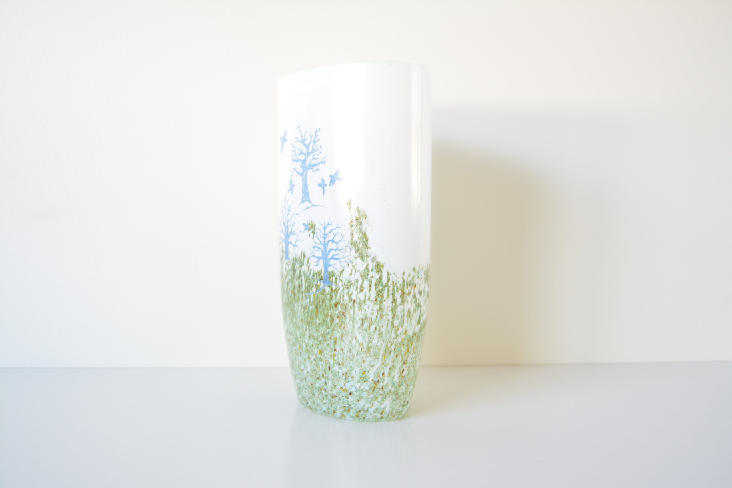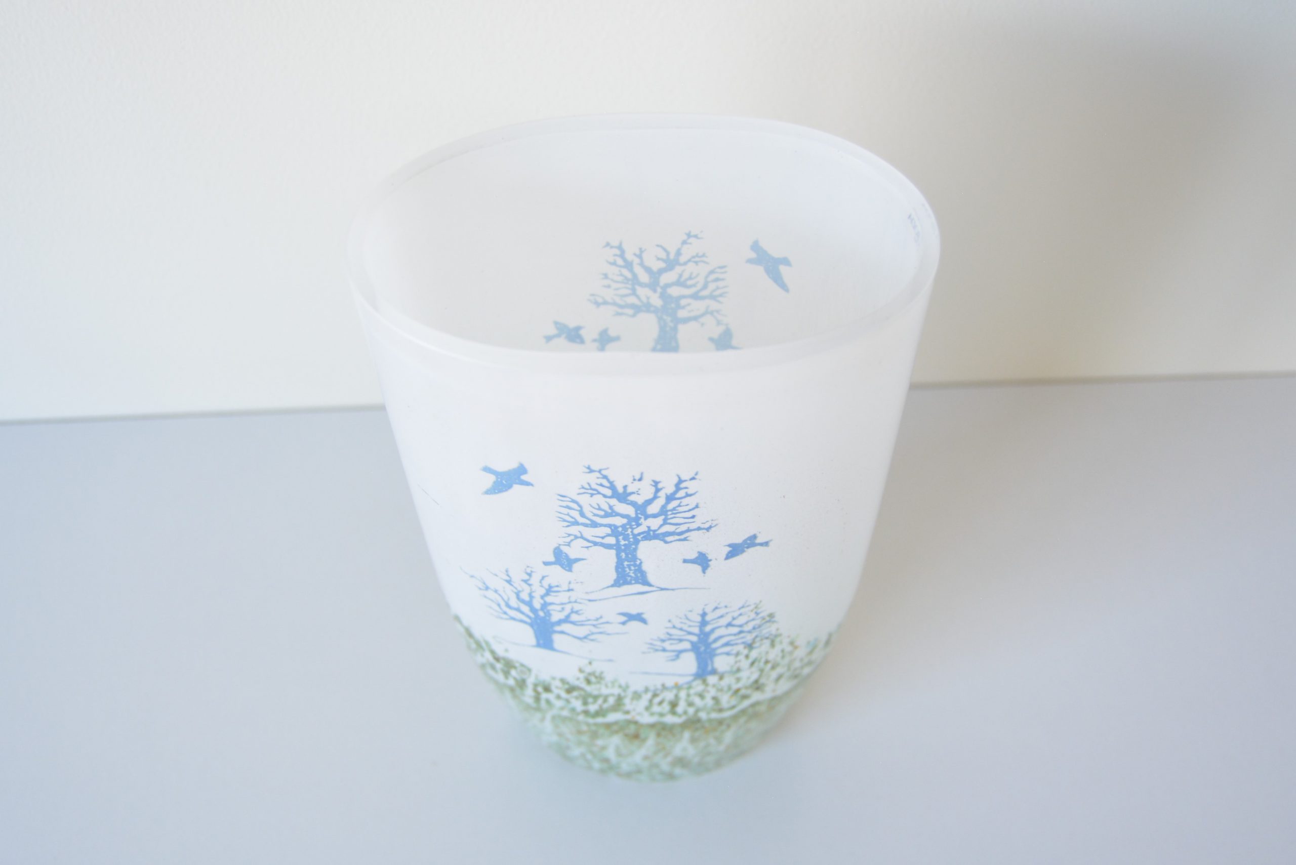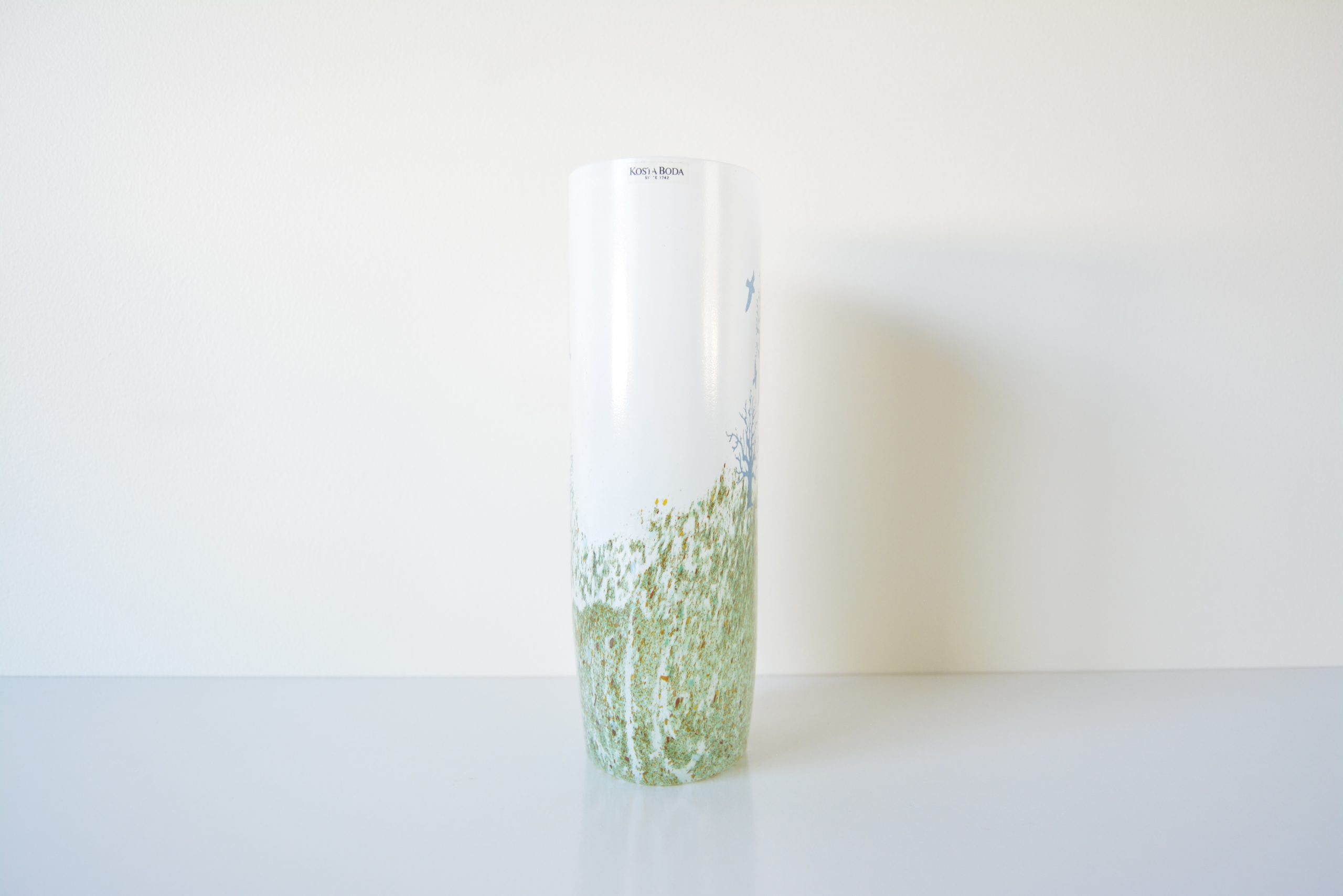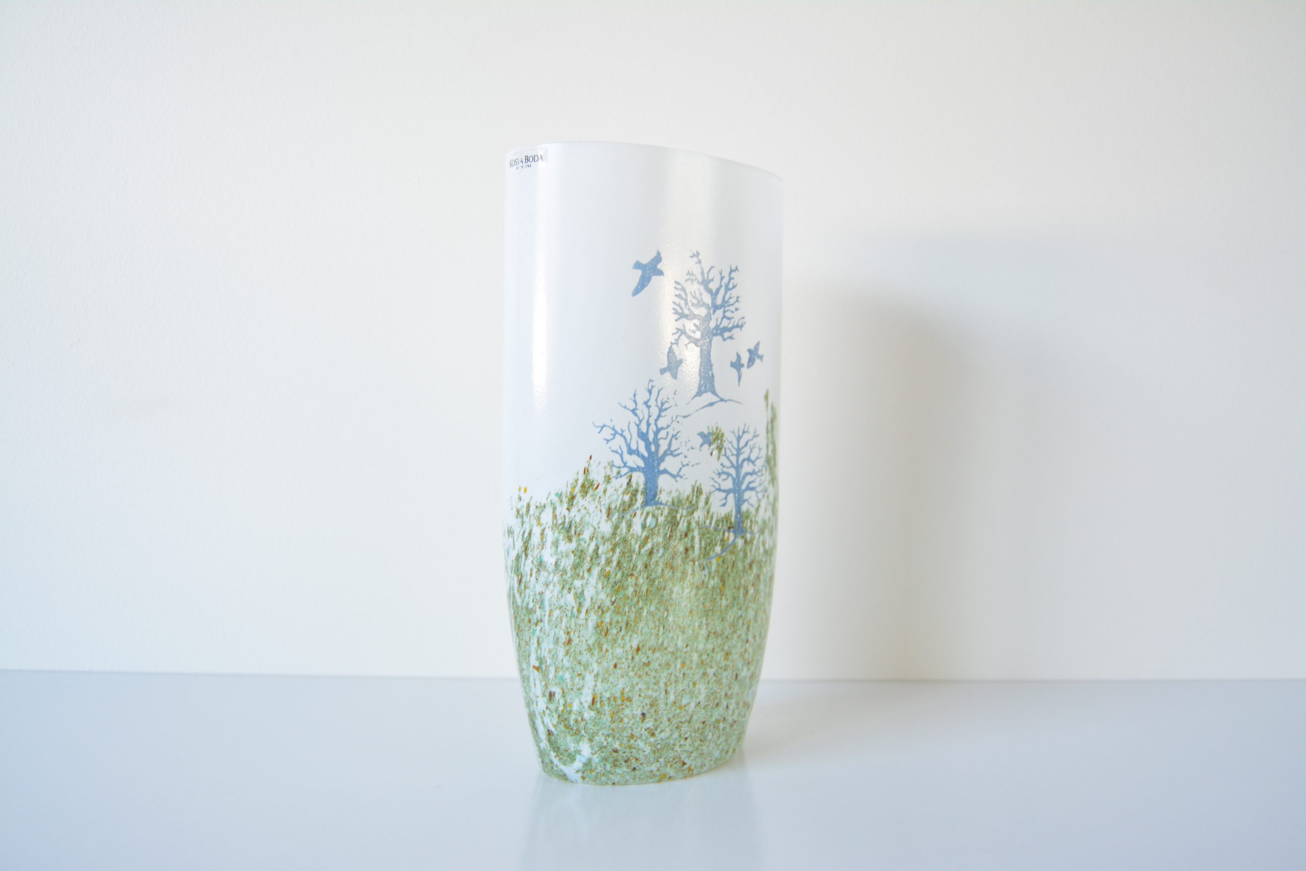 A Kosta Boda “October” Vase designed by Kjell Engman 1982. This is the LARGEST size in this series standing 22.5cm in height (and 12.5cm across). This vase is vintage (early-1980’s) and none of them in this series are still available through Kosta Boda so they have strong collector appeal. Engman has captured the essence of Europe late in autumn so well in this piece. I love its “watery” feel. Everything is “washed out” lacking definition which gives it the feel of autumn. There is an impending starkness there as well with winter around the corner but the piece is still uplifting with birds taking flight.