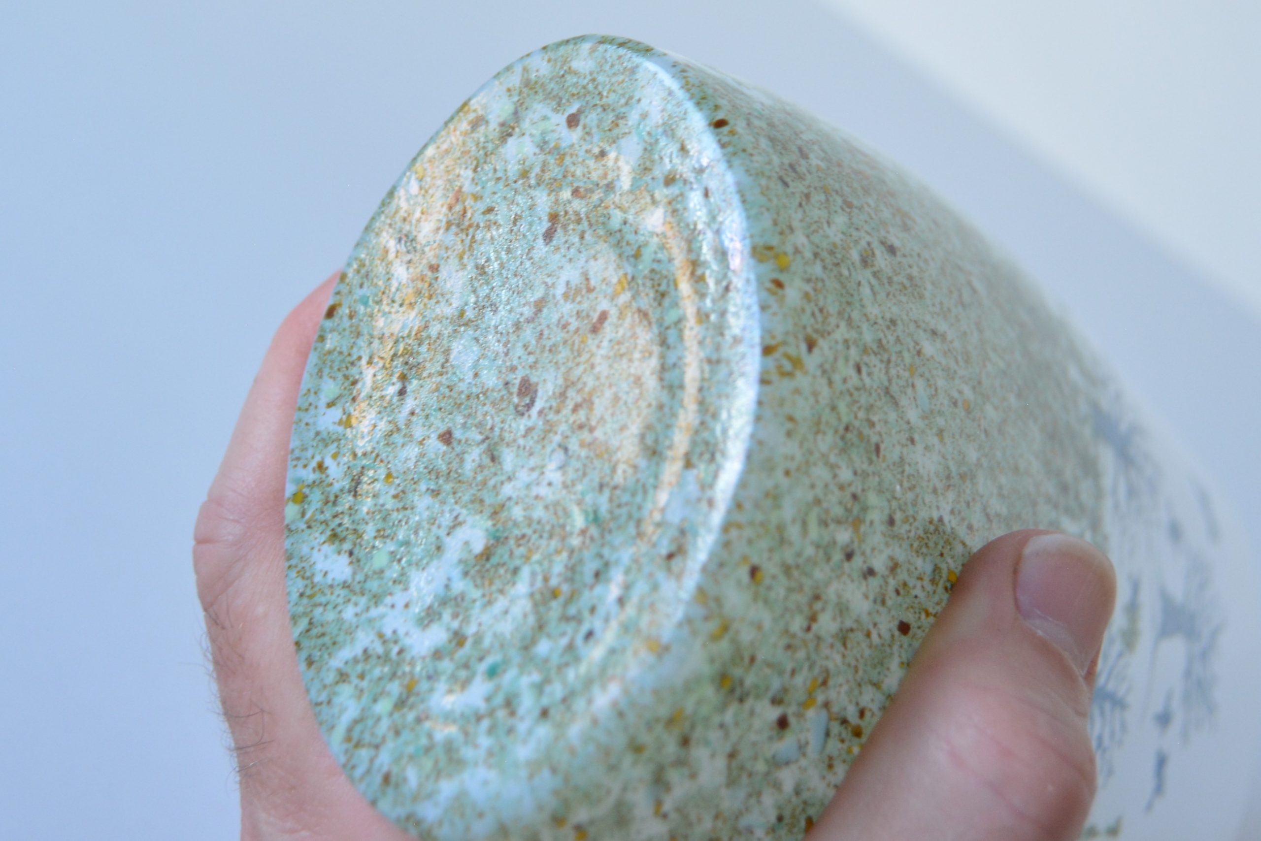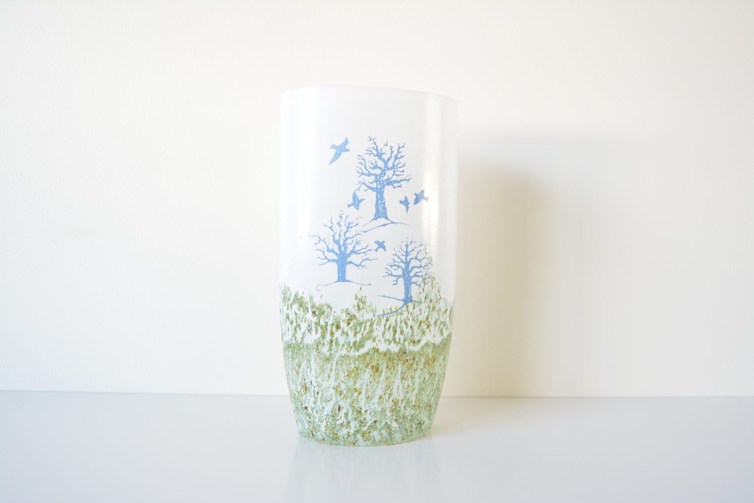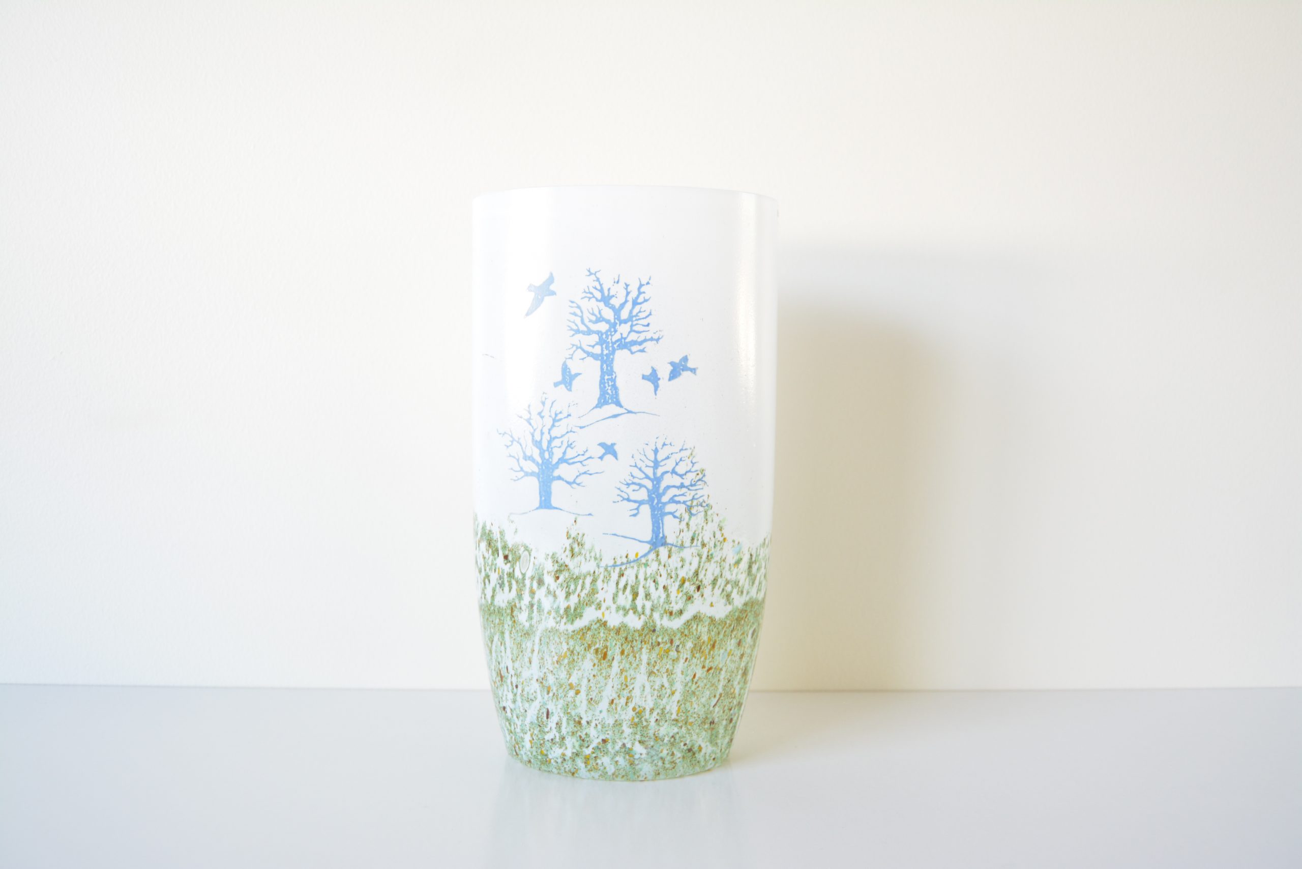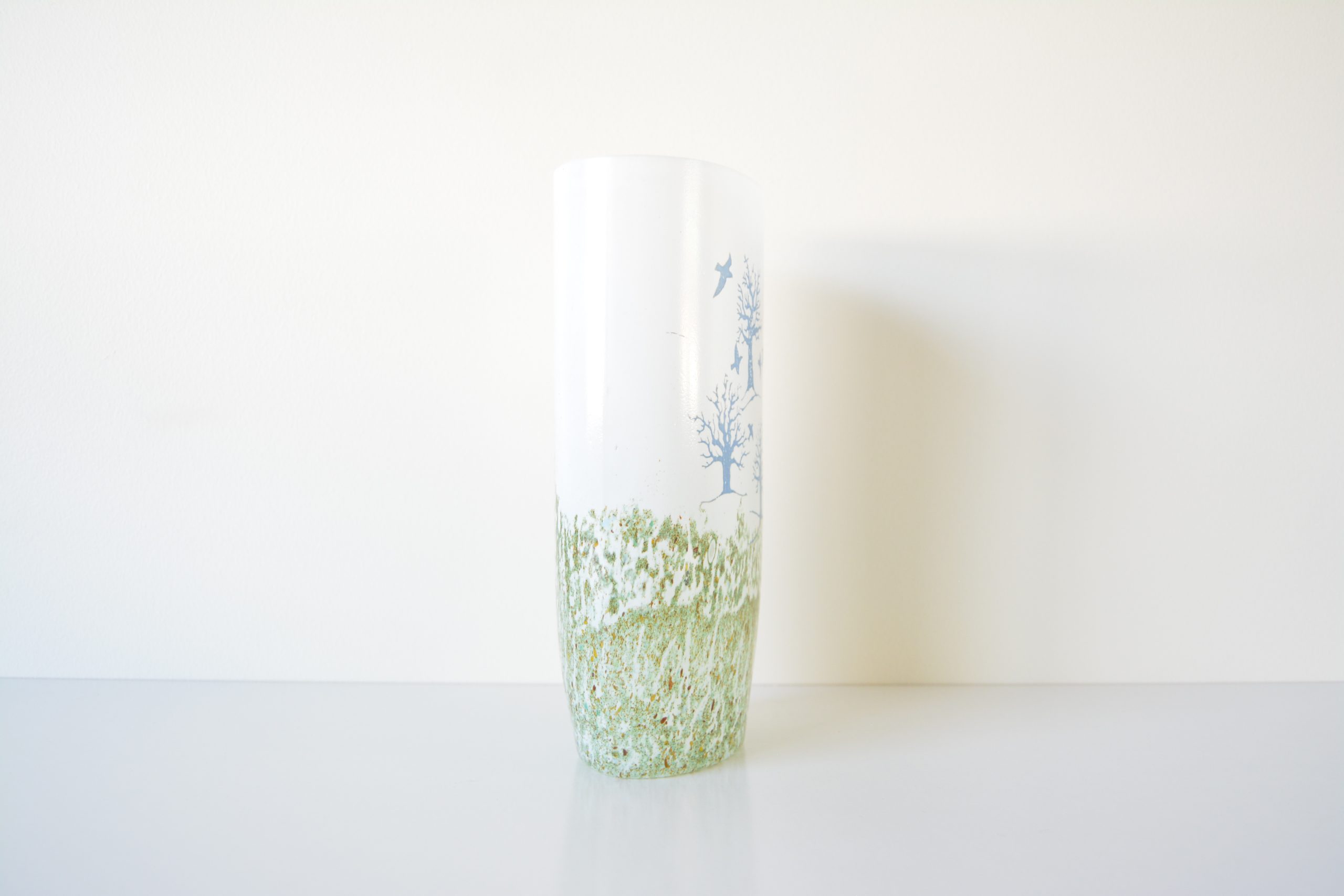 A Kosta Boda “October” Vase designed by Kjell Engman 1982. This is the LARGEST size in this series standing 22.5cm in height (and 12.5cm across). This vase is vintage (early-1980’s) and none of them in this series are still available through Kosta Boda so they have strong collector appeal. Engman has captured the essence of Europe late in autumn so well in this piece. I love its “watery” feel. Everything is “washed out” lacking definition which gives it the feel of autumn. There is an impending starkness there as well with winter around the corner but the piece is still uplifting with birds taking flight.
