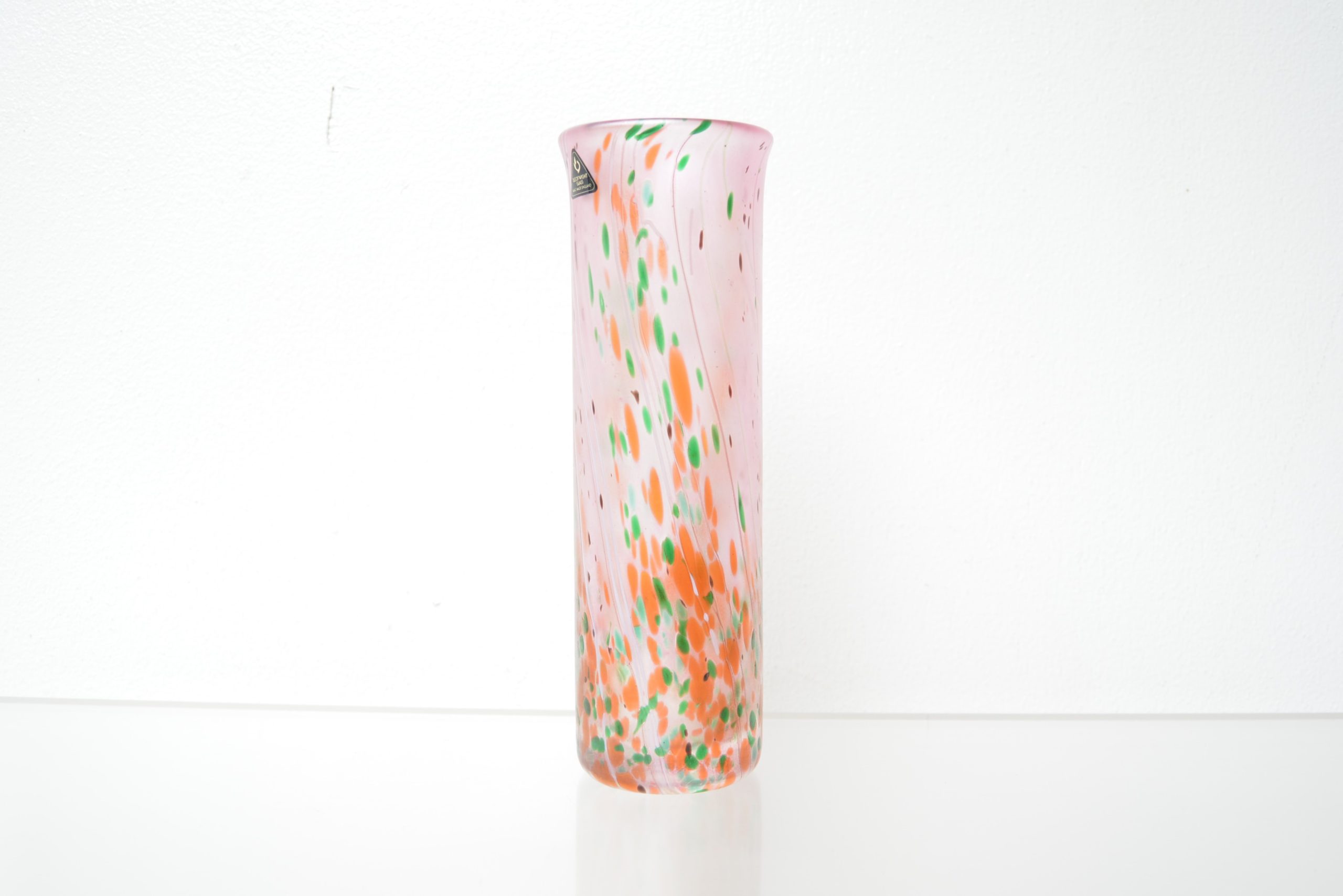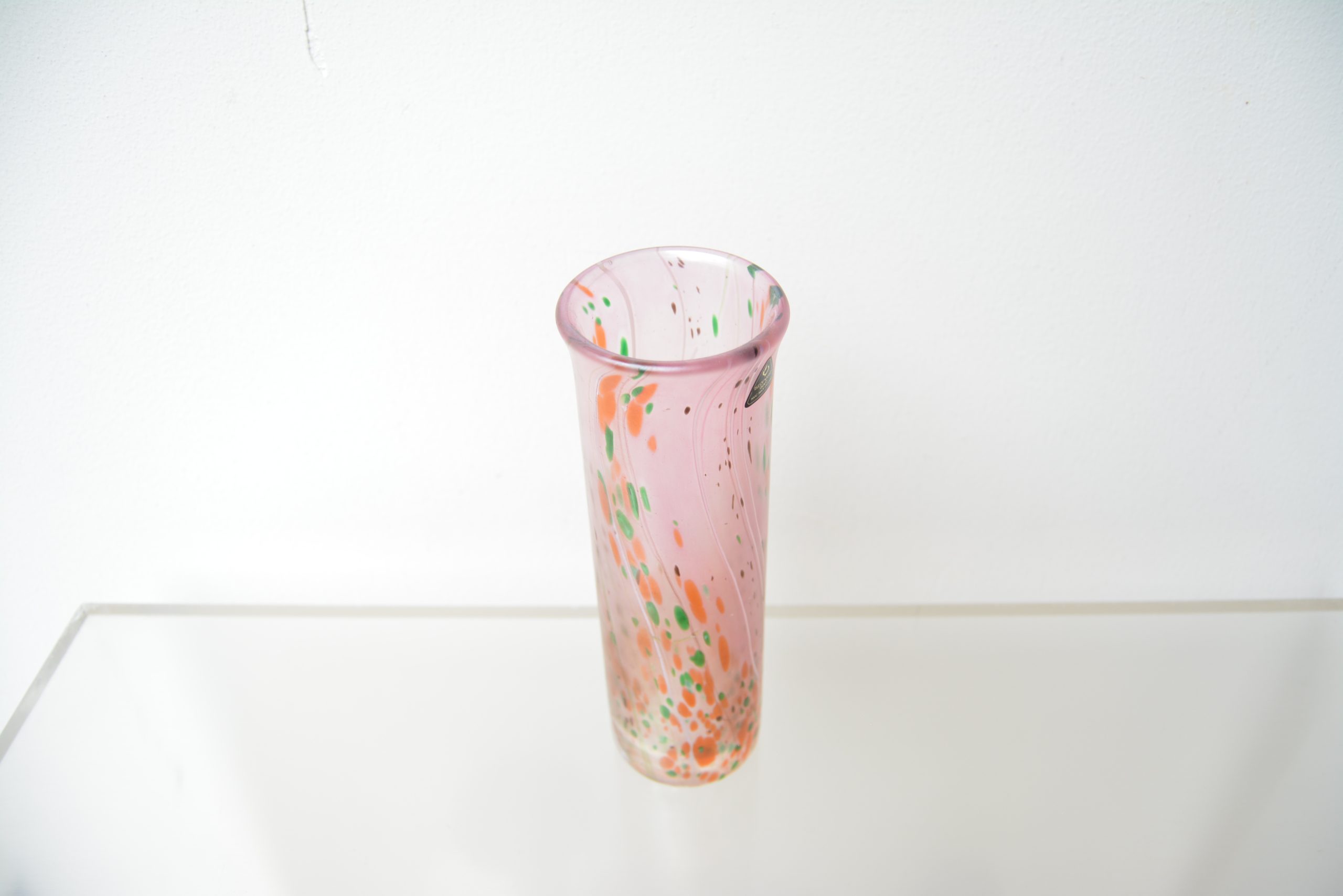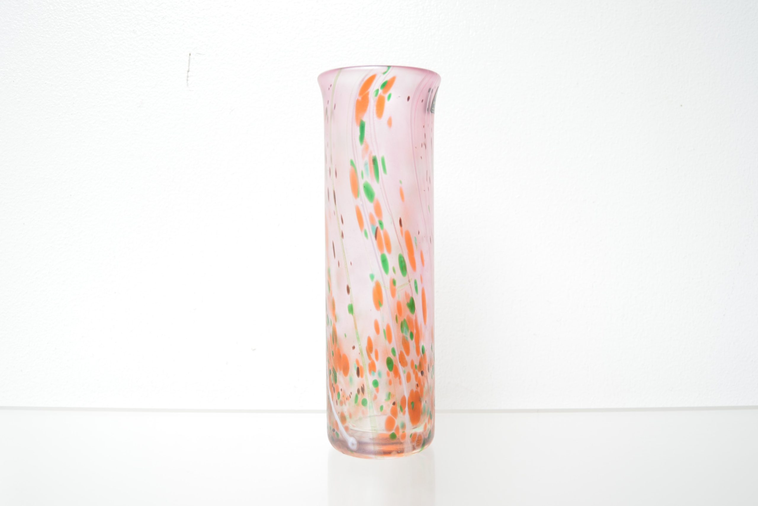NOTE- ALL of the vintage pieces photographed are available for sale. From $88 each. Enquire if you have interest in any of the other pieces shown. We’ll do a good price on any of them. Pieces shown from right to left- Italian Empoli Goblet c. 1960’s , Isle of Wight Cylindrical Vase (showcased in this listing), Okra Iridescent Vase, James McMurtrie (Australian Artist) cylindrical vase.