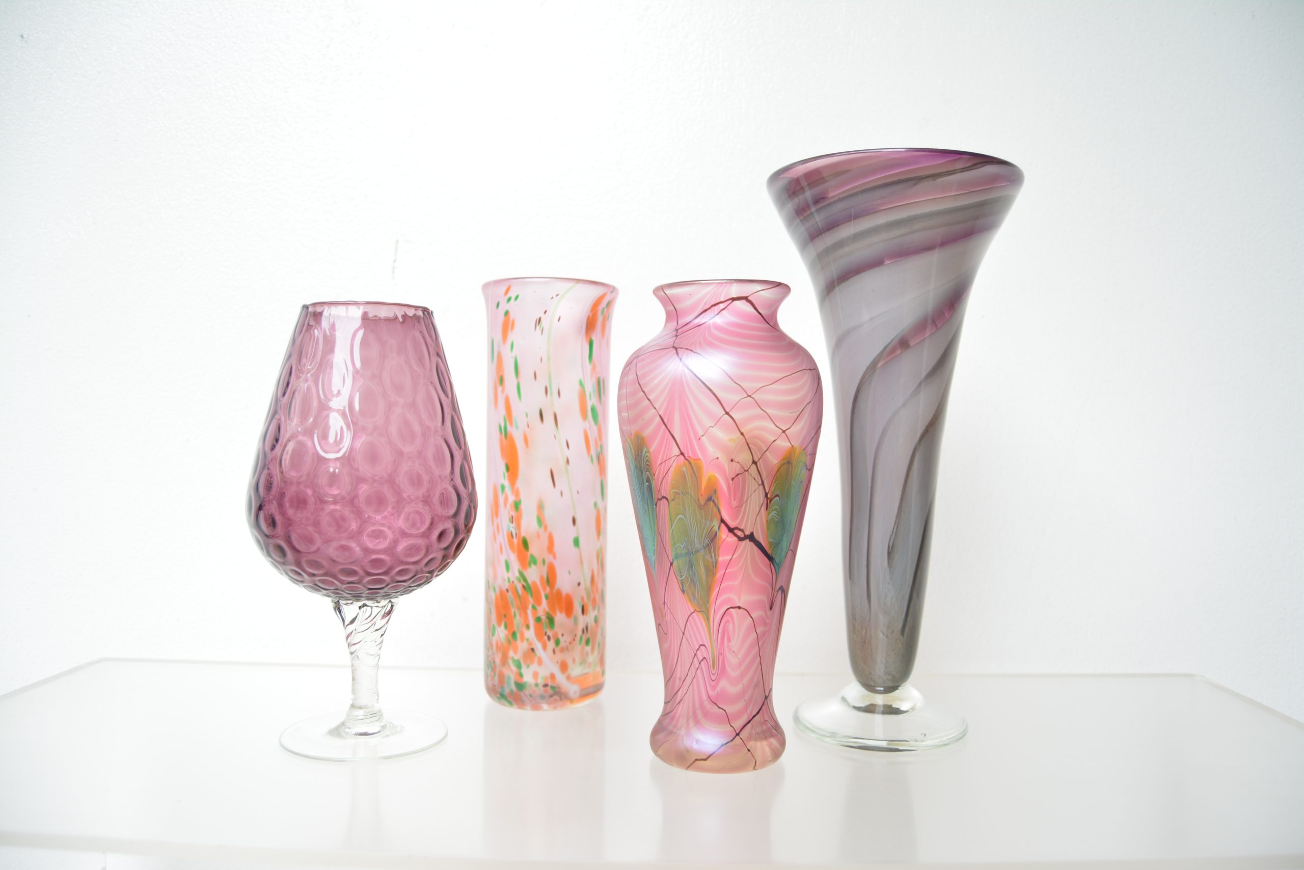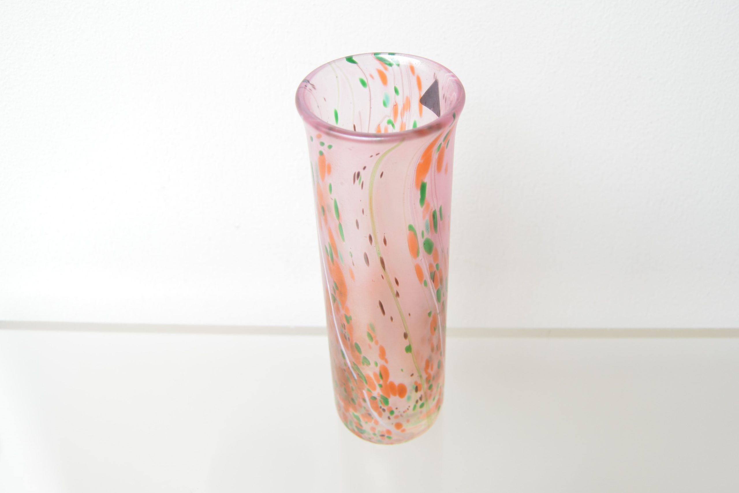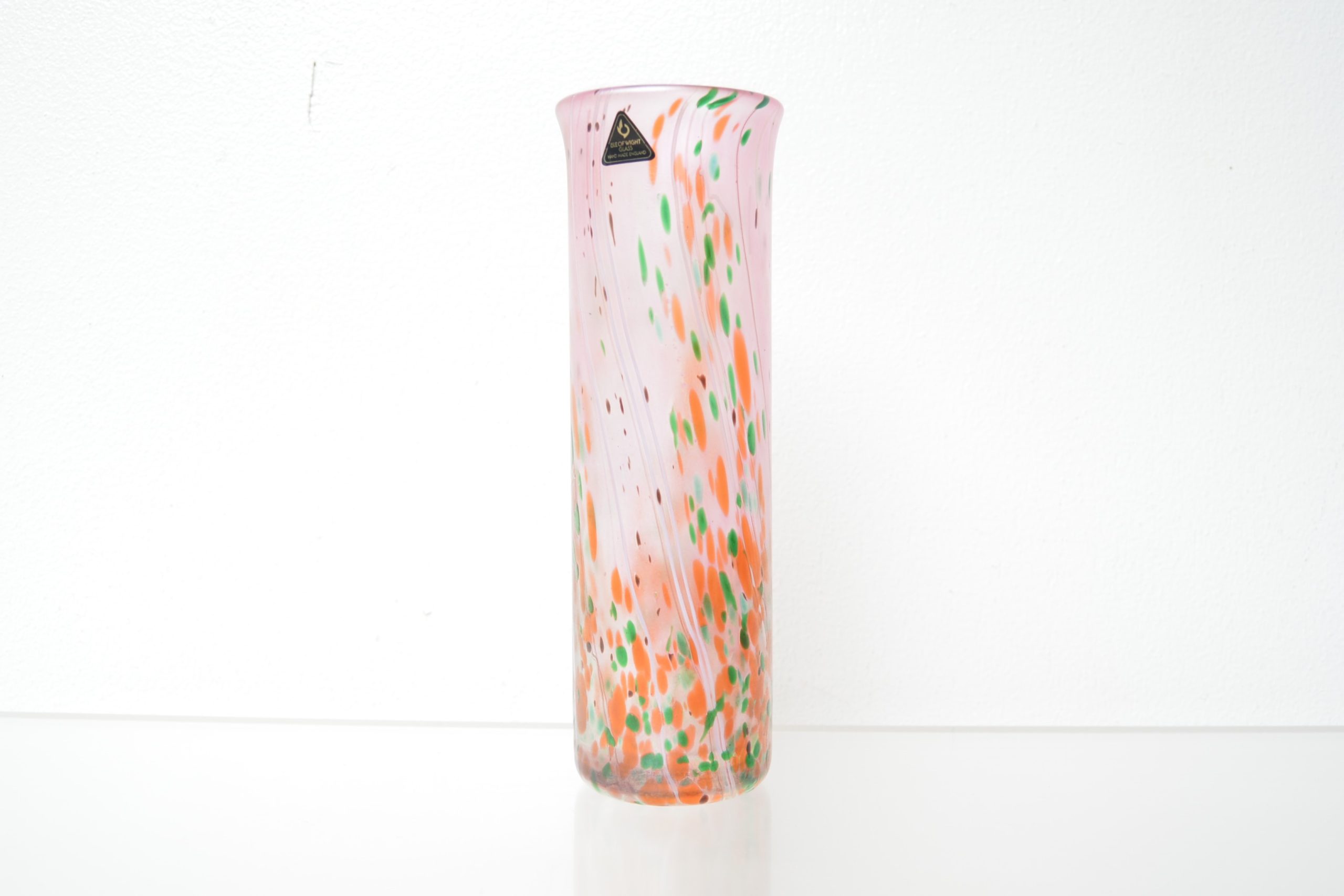 NOTE- ALL of the vintage pieces photographed are available for sale. From $88 each. Enquire if you have interest in any of the other pieces shown. We’ll do a good price on any of them. Pieces shown from right to left- Italian Empoli Goblet c. 1960’s , Isle of Wight Cylindrical Vase (showcased in this listing), Okra Iridescent Vase, James McMurtrie (Australian Artist) cylindrical vase.