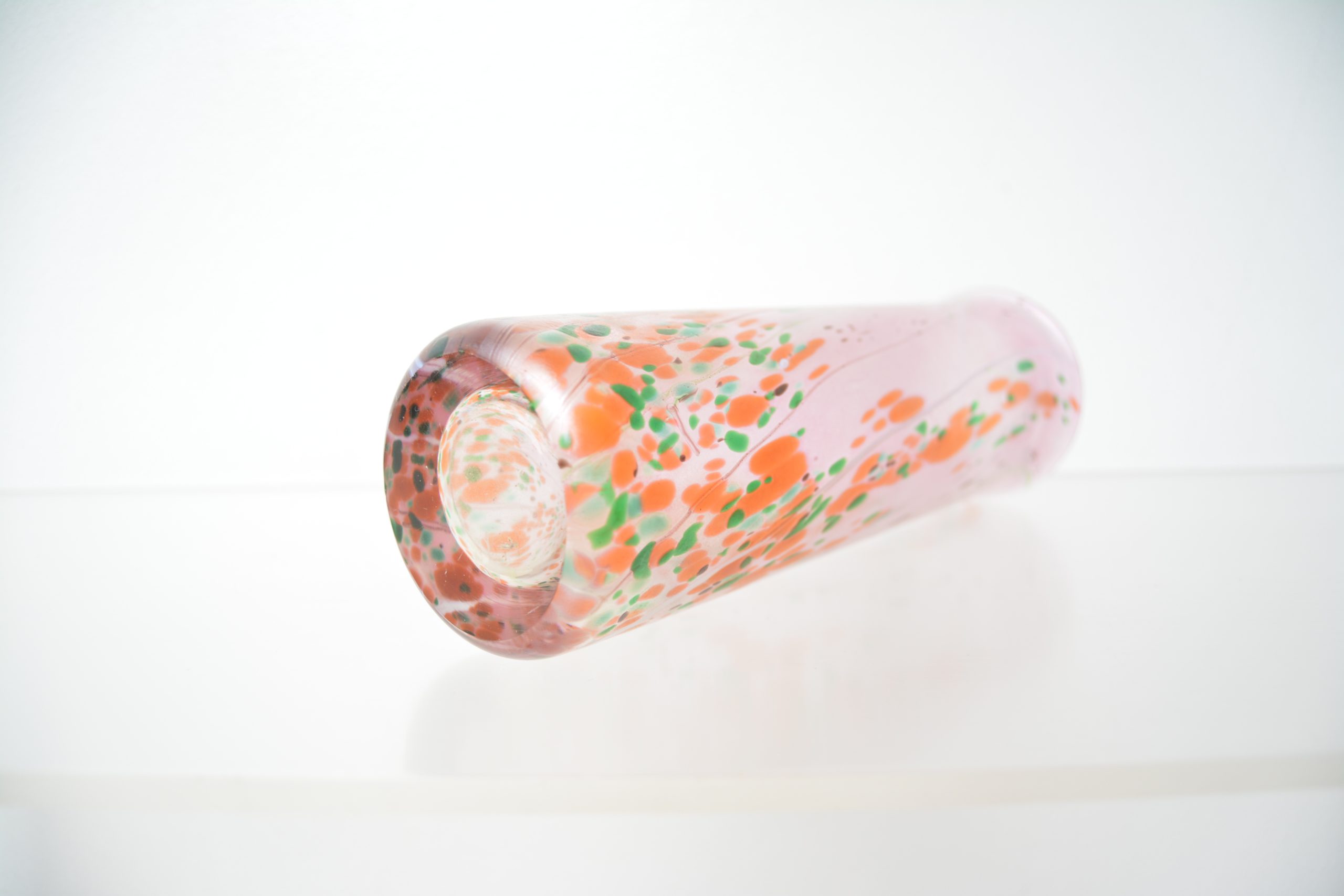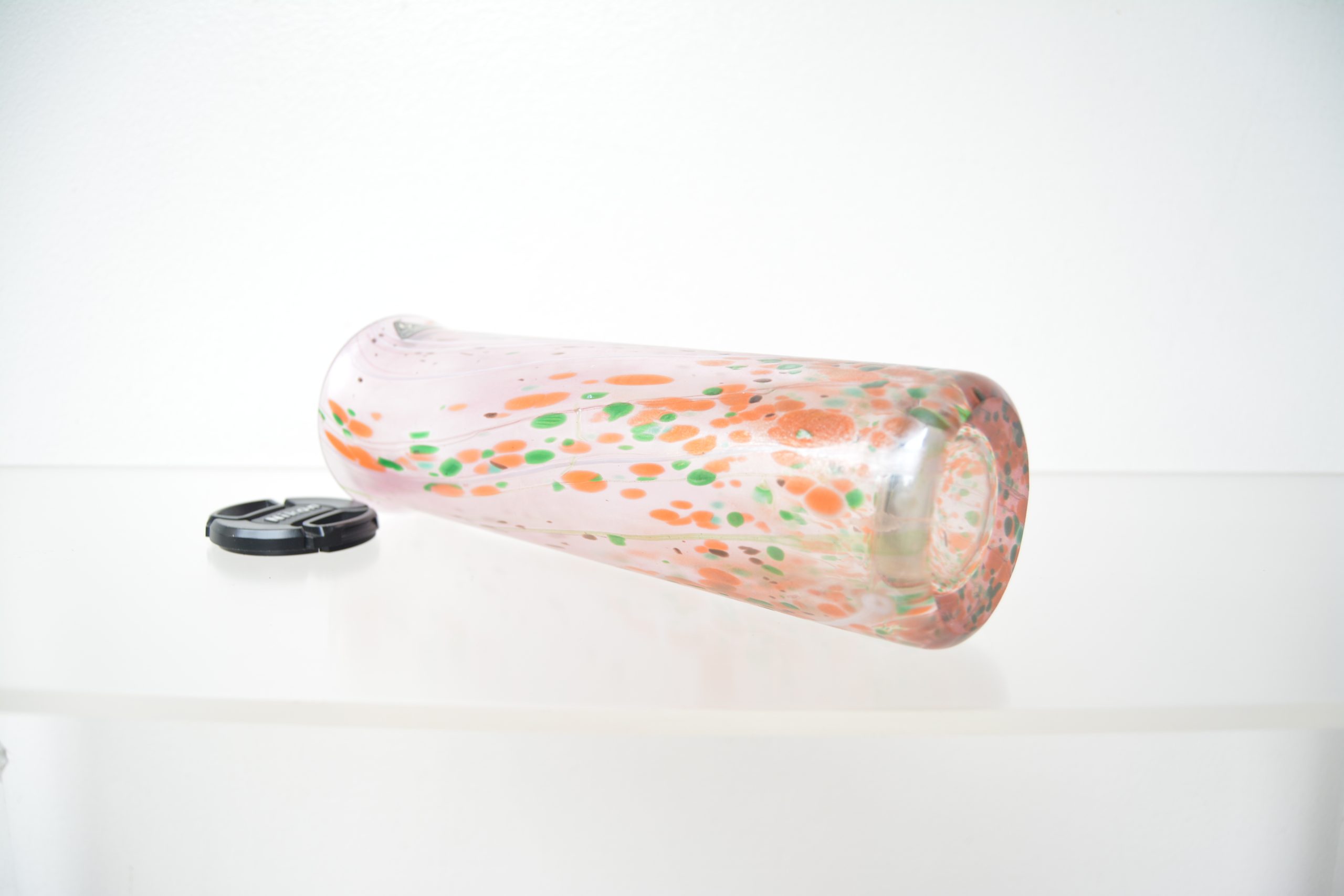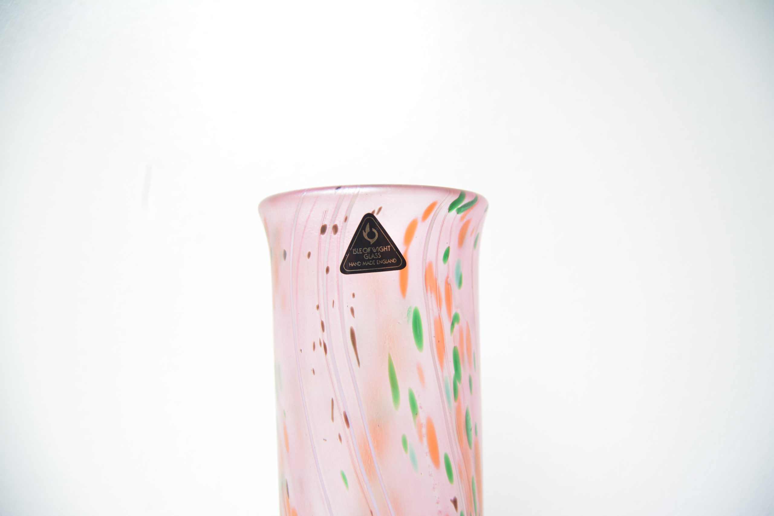 An iridescent cylindrical vase designed by Michael Harris most likely in the 1980’s. This is quite a substantial size for an Isle of Wight piece weighing 800 grams. These were HAND-MADE by Isle of Wight studio and is known as the “Summer Fruits” pattern. Michael Harris (who established Mdina Glass in the 1960’s) is one of the most celebrated glass designers ever. He’d be up there in a small group of about 5 or 10 who have heavily influenced art glass design over the years. I initially fell in love with Mdina glass but the classic style of many of the Isle of Wight pieces have also won me over. This piece has a spontaneous flow that only hand-crafted pieces possess.