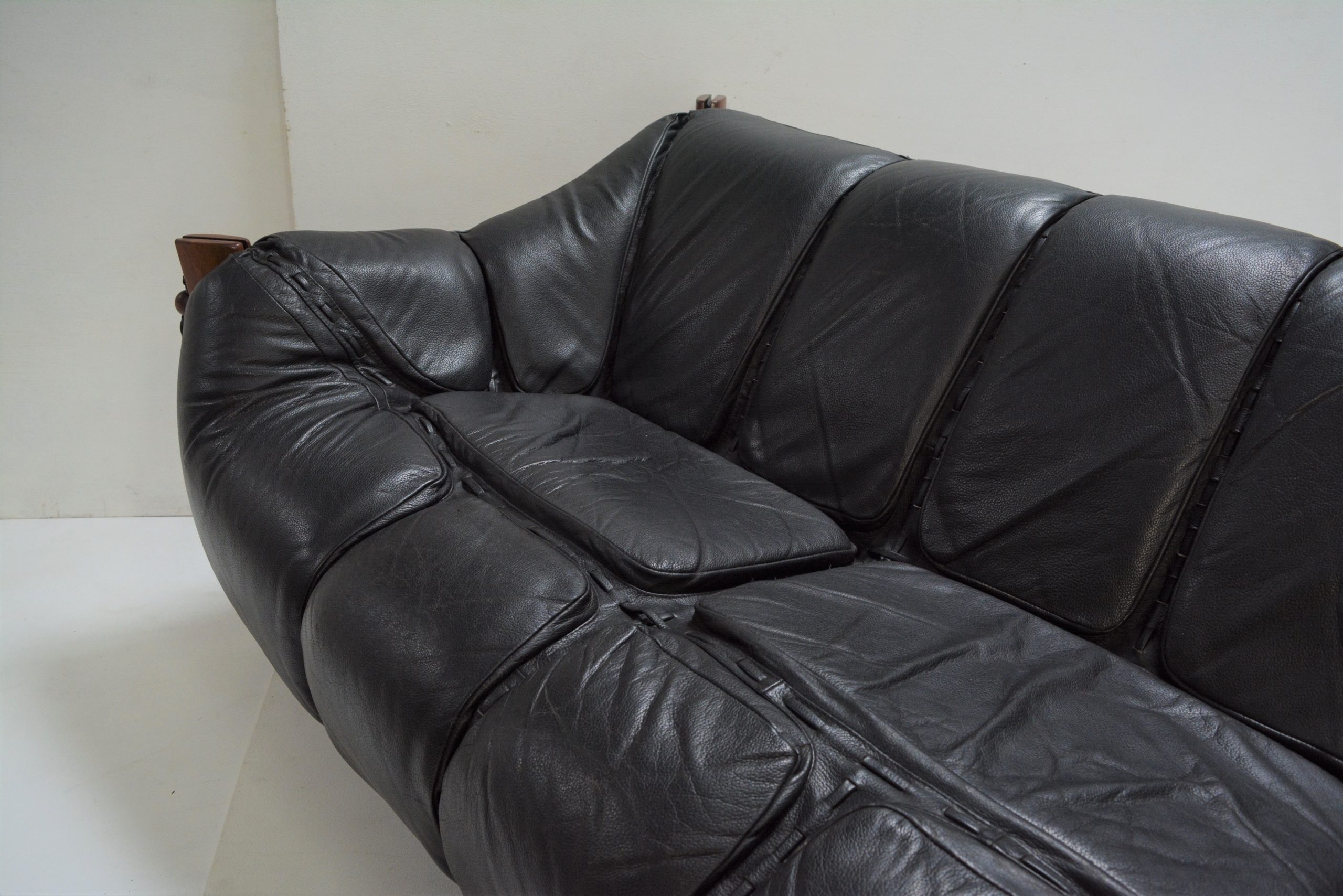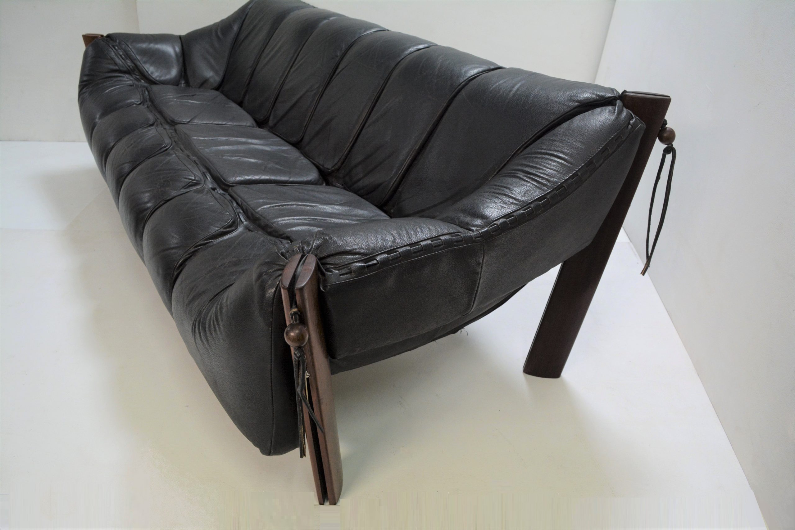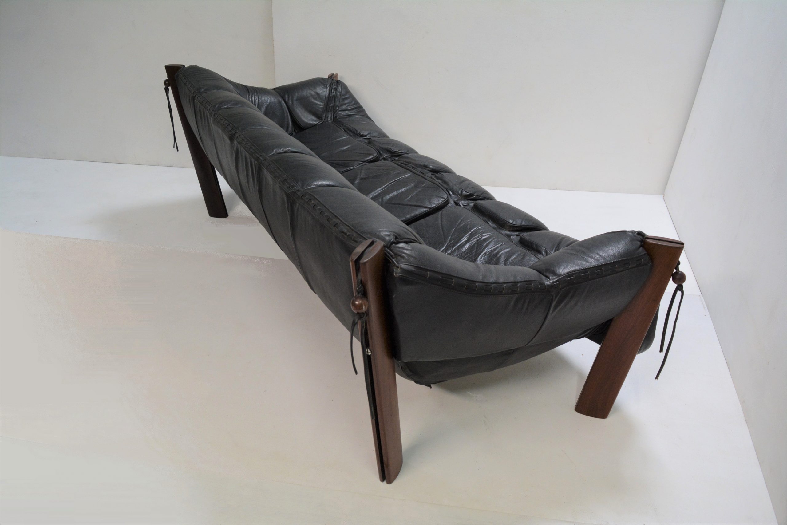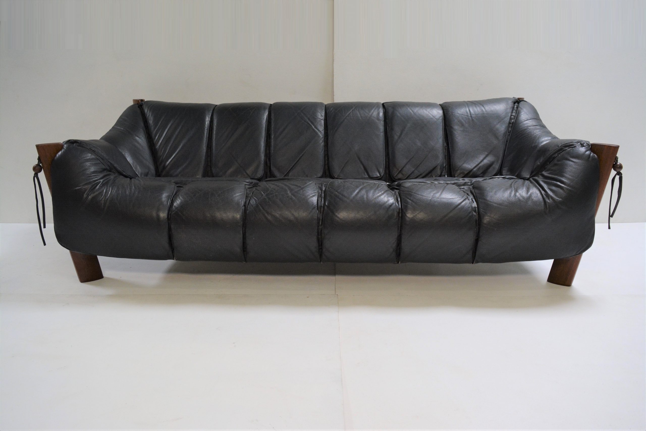 A Percival Lafer sofa/ couch made in Brazil in the early 1970’s (in premium black leather). This is a 3.5 seater measuring 228cm long. It’s easily the most amazing sofa I’ve had (and probably ever seen!). The comfort is incredible. This would have to be the most comfortable sofa I’ve ever sat in. It’s like lying in an over-sized baseball glove. It’s amazingly supportive and the angles are all spot-on. The suspension design means this sofa melds to the shape of your body and the pockets of cushioning feel like you’re being hugged. Just watch your stresses melt away when you arrive home from work and relax in this.