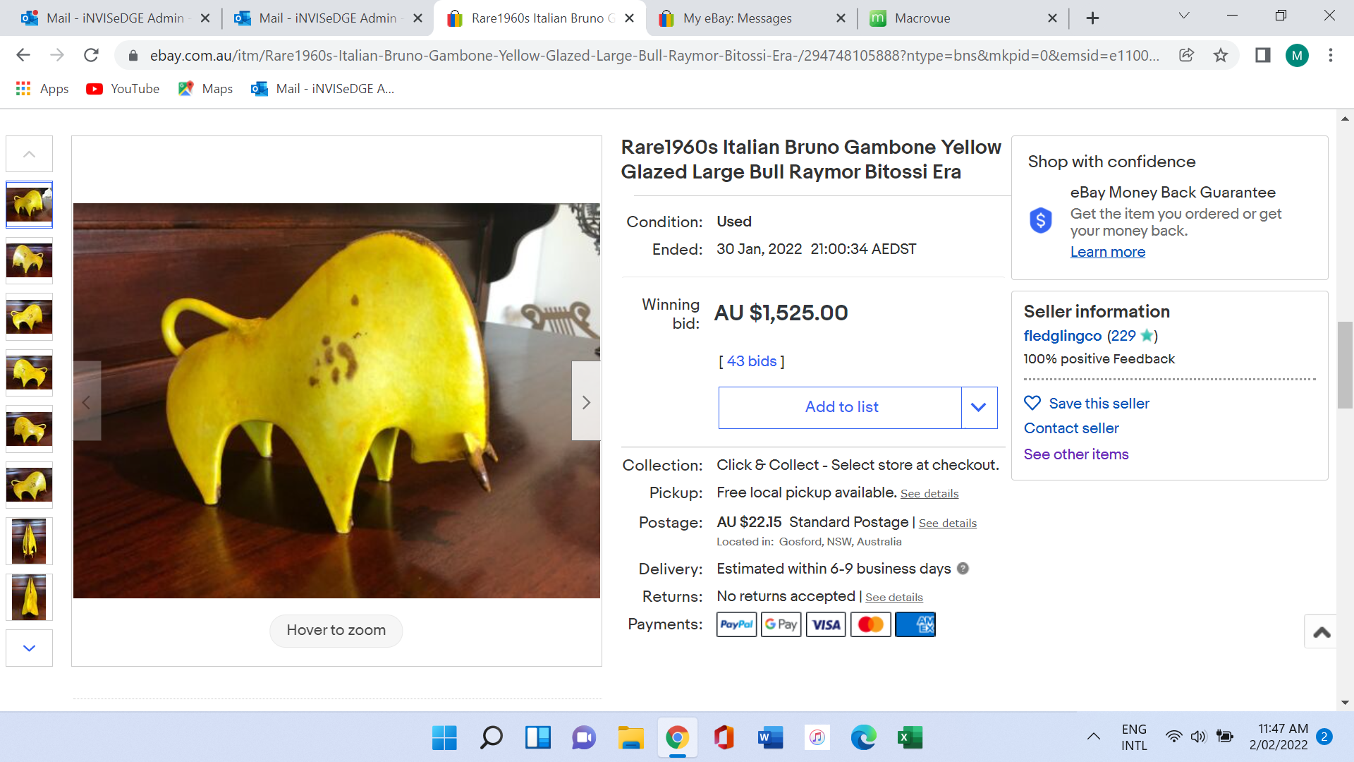 This would be a great gift for the mid-century Australian pottery enthusiast. It’s signed DAGA in the distinctive way all these pieces were signed. There’s an Alvino Bagni bull with a similar amount of handiwork in it on 1stdibs at the moment for a staggering AU$3,887! (See the screenshot provided.) Another Italian bull by Bruno Gambone was recently bid up to AU$1,525 on ebay. Ellis ceramic / pottery animals (another Australian pottery firm) regularly fetch around $500. At this price, it’s an obvious INVESTMENT- there’s big tabs on Maigon Daga pieces.