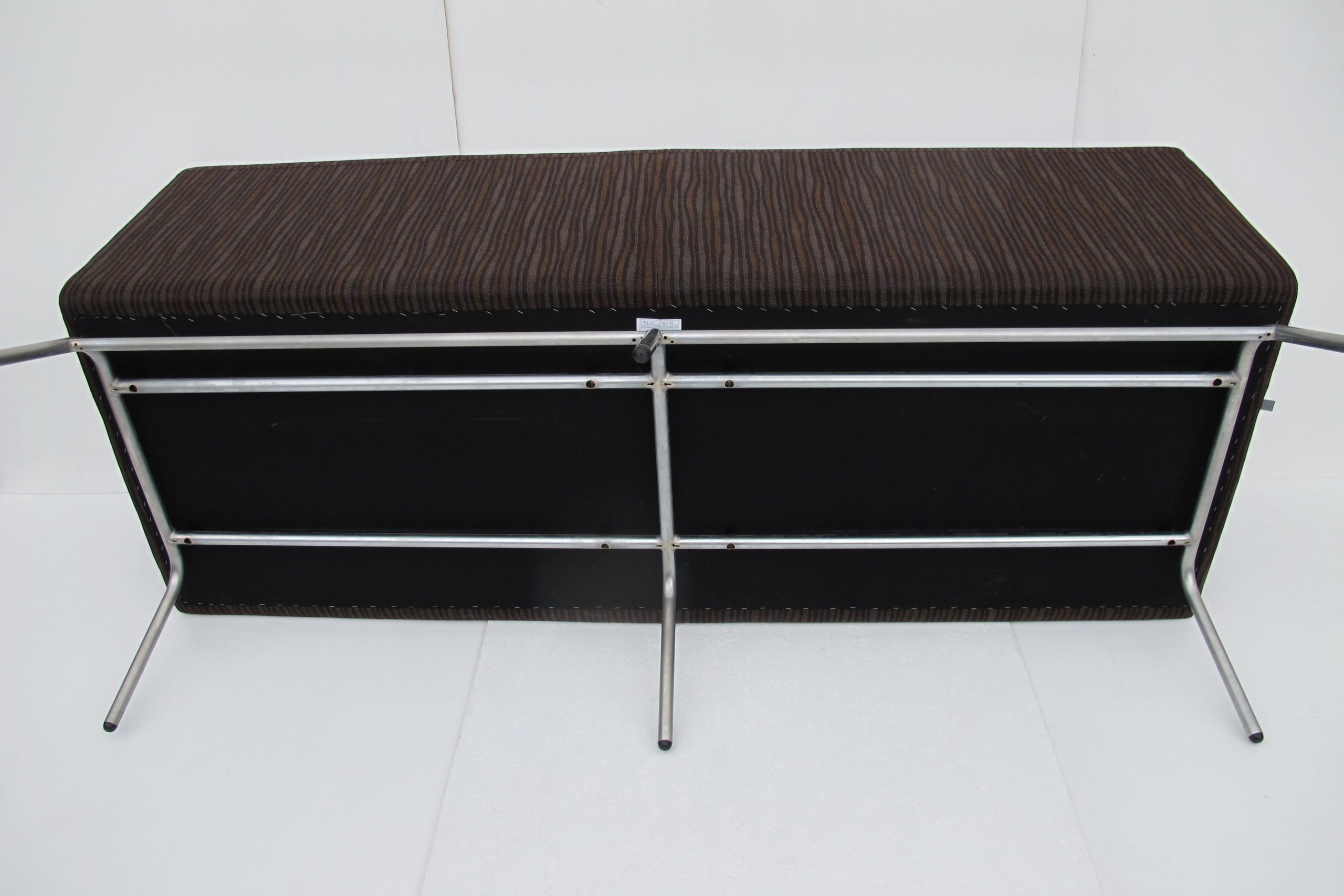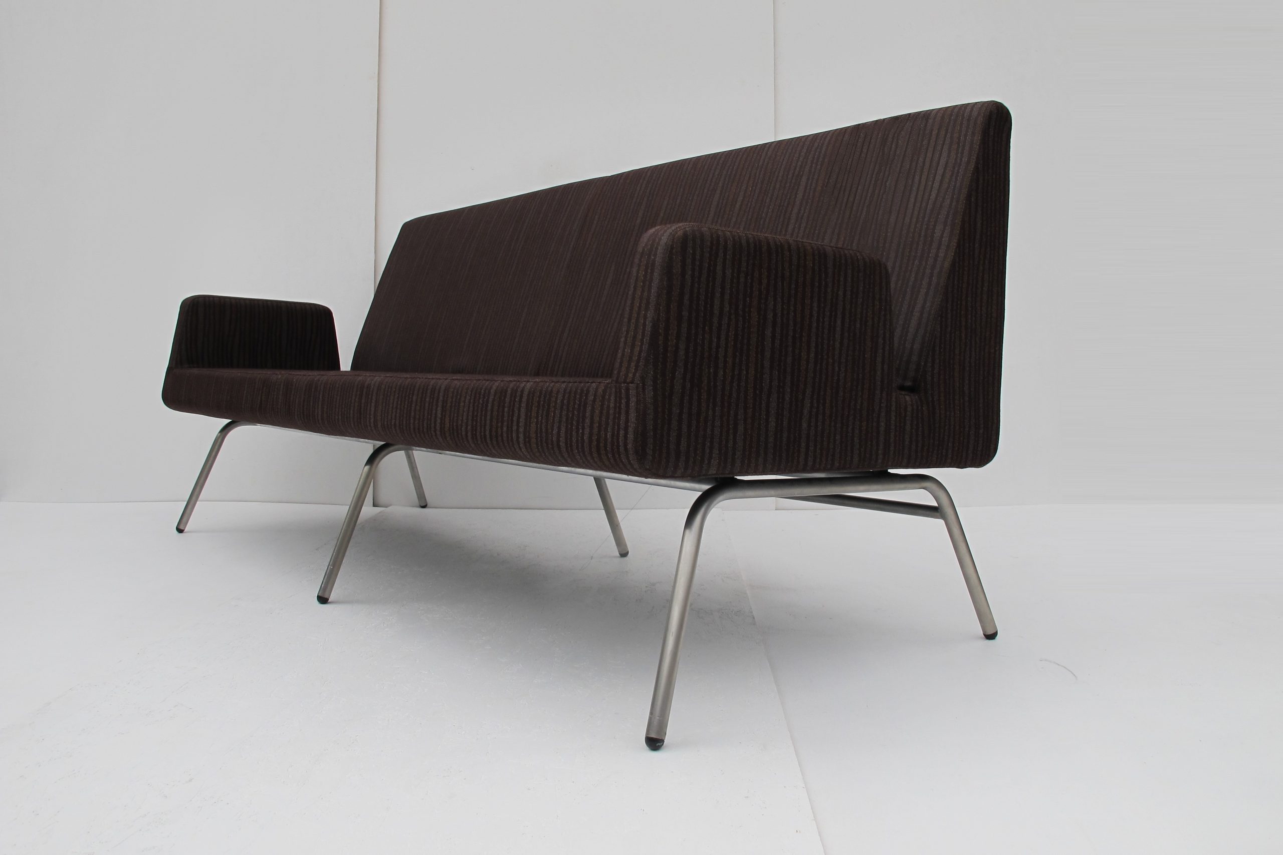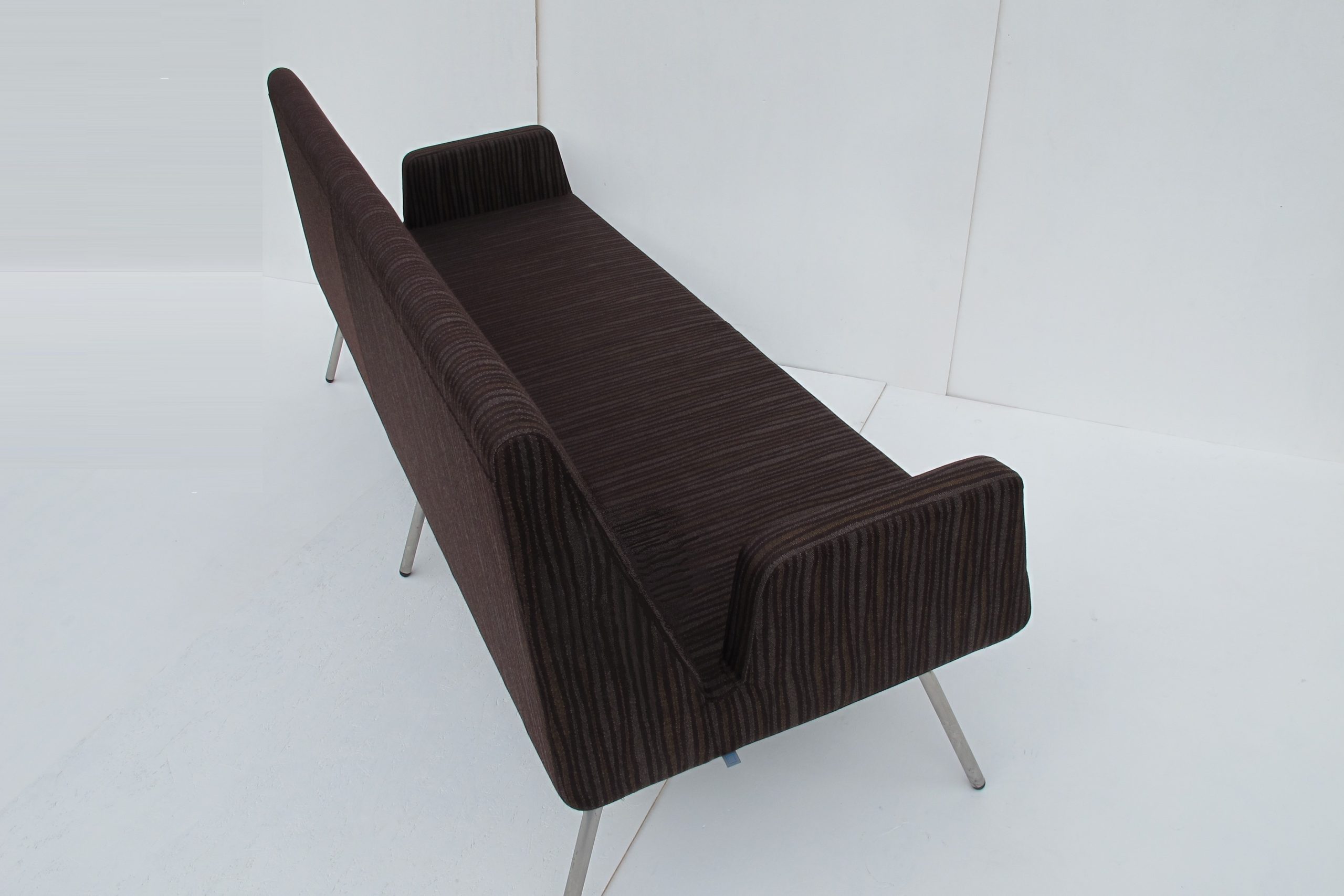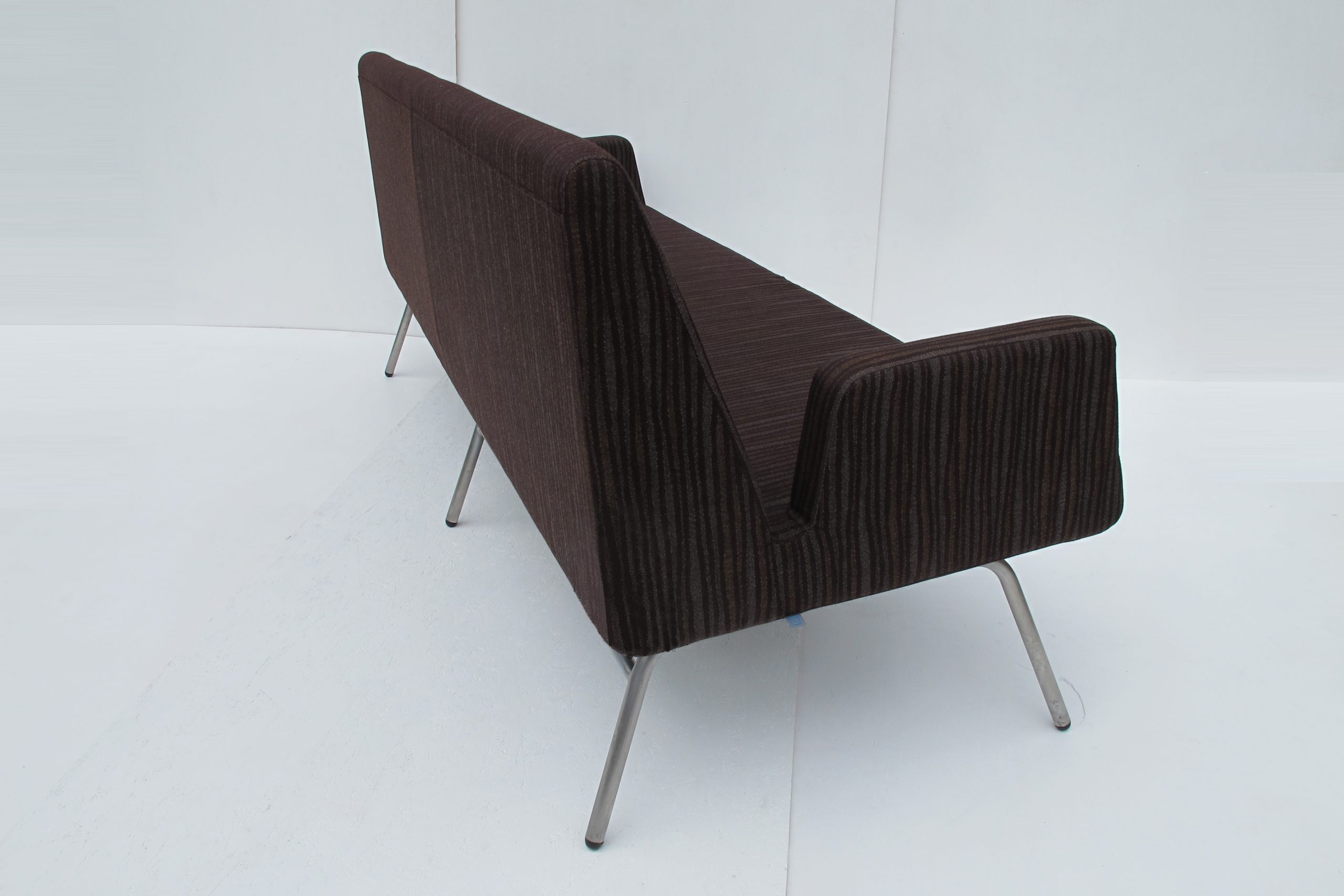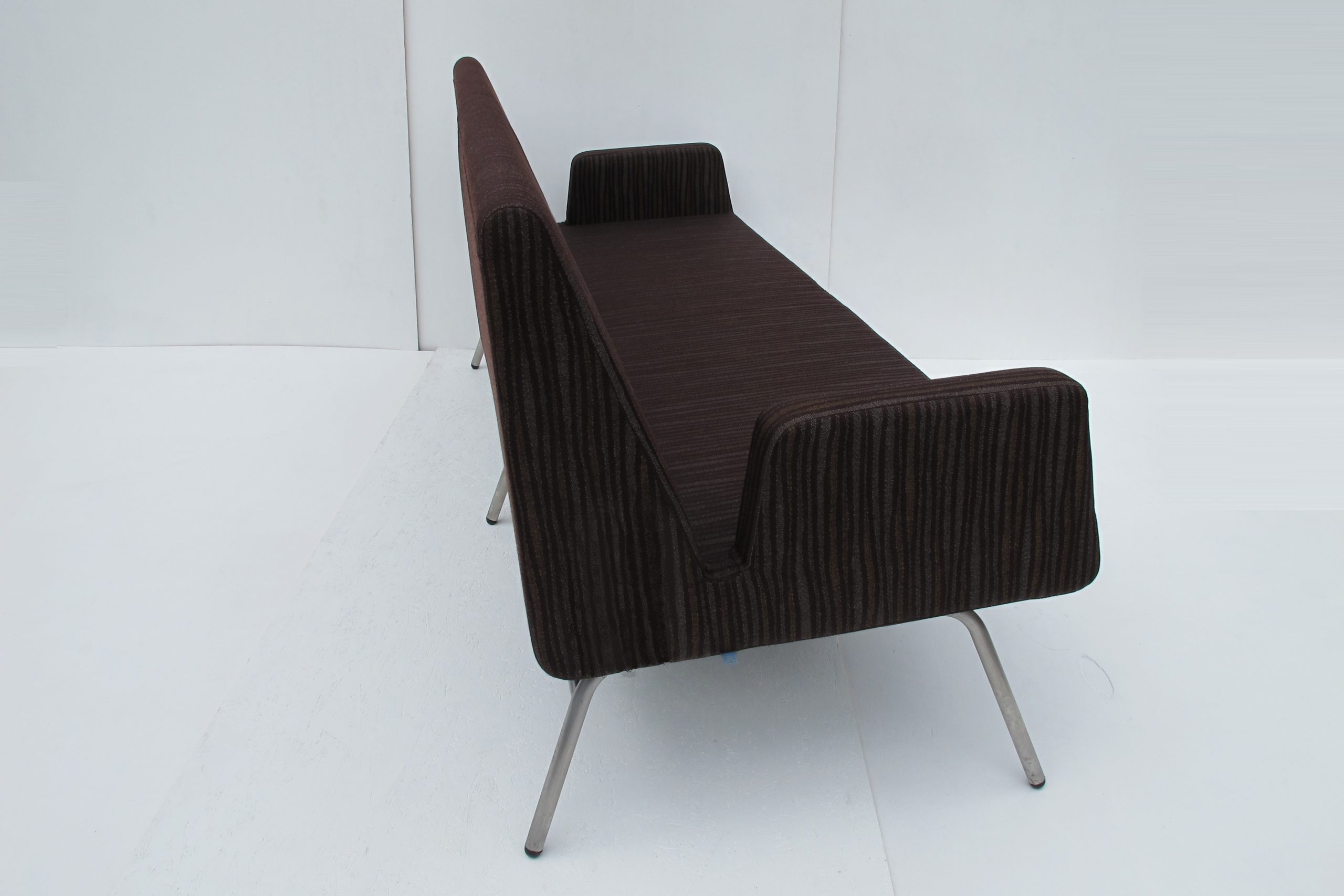 An Australian designer sofa by Matt Butler. This sofa is part of the T-Series manufactured by Matthew Butler’s furniture label ‘Blue-square’. The piece has two labels to identify the design and maker. This addition to the iNVISeDGE stock inventory is a breath of fresh air. This is a highly-awarded Australian design and yes Australians have produced a plethora of amazing designs from the early 1950’s through to the late 1970’s but it basically ended there. Matt Butler’s designs are a notable exception. The highly-acclaimed T-Series was designed for the Sydney Olympics in the year 2000. I visited Matt’s website before purchasing this piece- it took minutes to be keen to stock this sofa. Matthew’s furniture designs are exhibited in national and international galleries including Sydney’s Powerhouse Museum. The T-Series uses eco-certified materials and is built for heavy-traffic commercial interiors such as banks, airports, universities and offices. This really sold me- the piece has been built to last. It’s modern, stylish, artful, sophisticated AND built to last- a rare combination these days. Deakin University, Brisbane International Airport, National Australia Bank and ‘The Movie Show’ on SBS Television all use T-Series chairs.