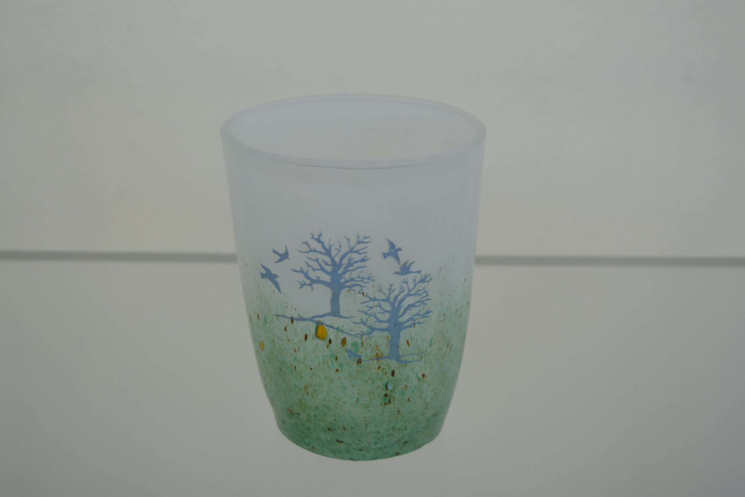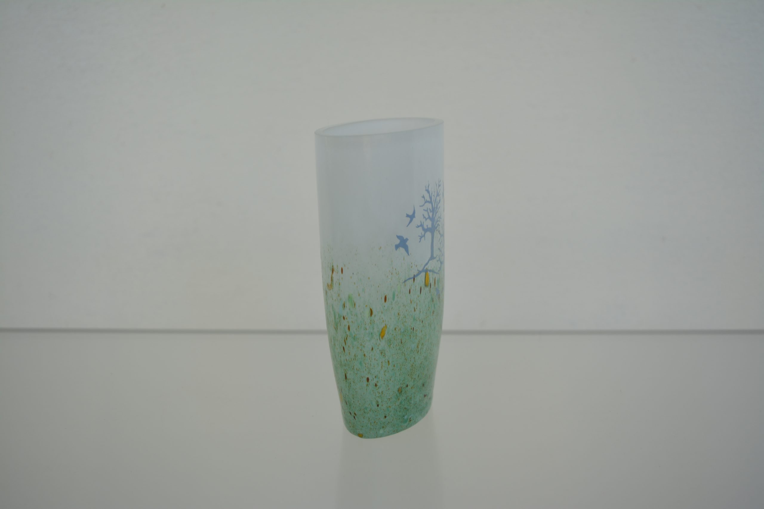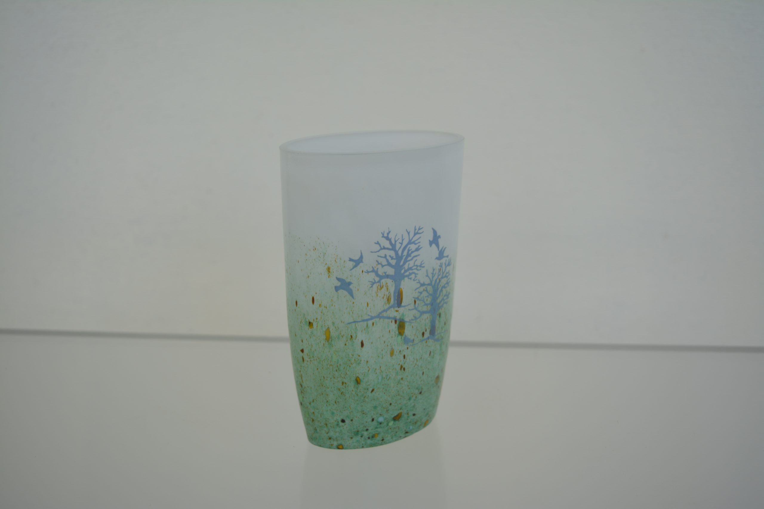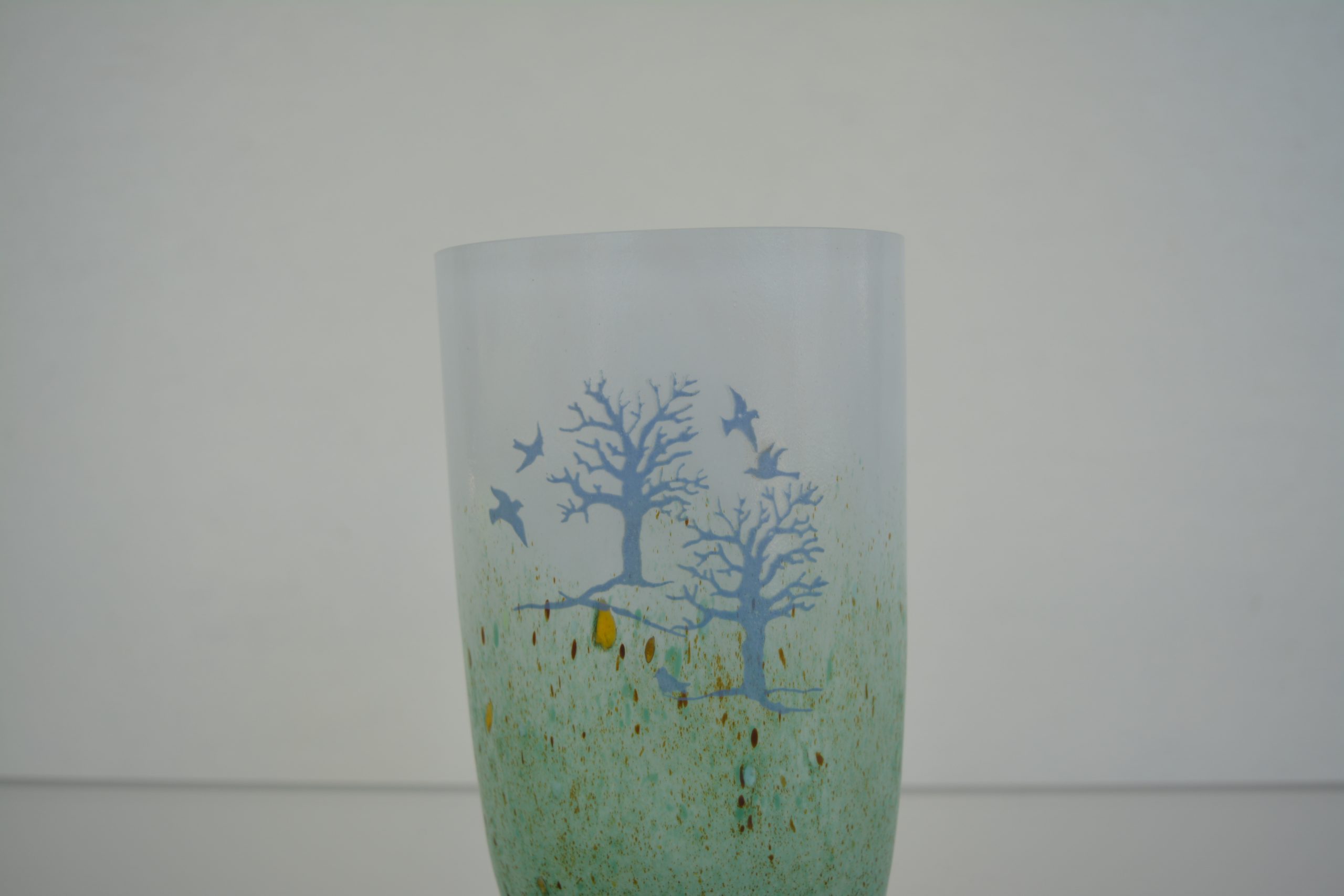 A Kosta Boda “October” Vase designed by Kjell Engman 1982. This is the medium size in this series standing 15cm in height (and 10cm across). None of the vases in this series are still available through Kosta Boda so they have strong collector appeal. Engman has captured the essence of Europe late in autumn so well in this piece. I love its “watery” feel. Everything is “washed out” lacking definition which gives it the feel of autumn. There is an impending starkness there as well with winter around the corner but the piece is still uplifting with birds taking flight.