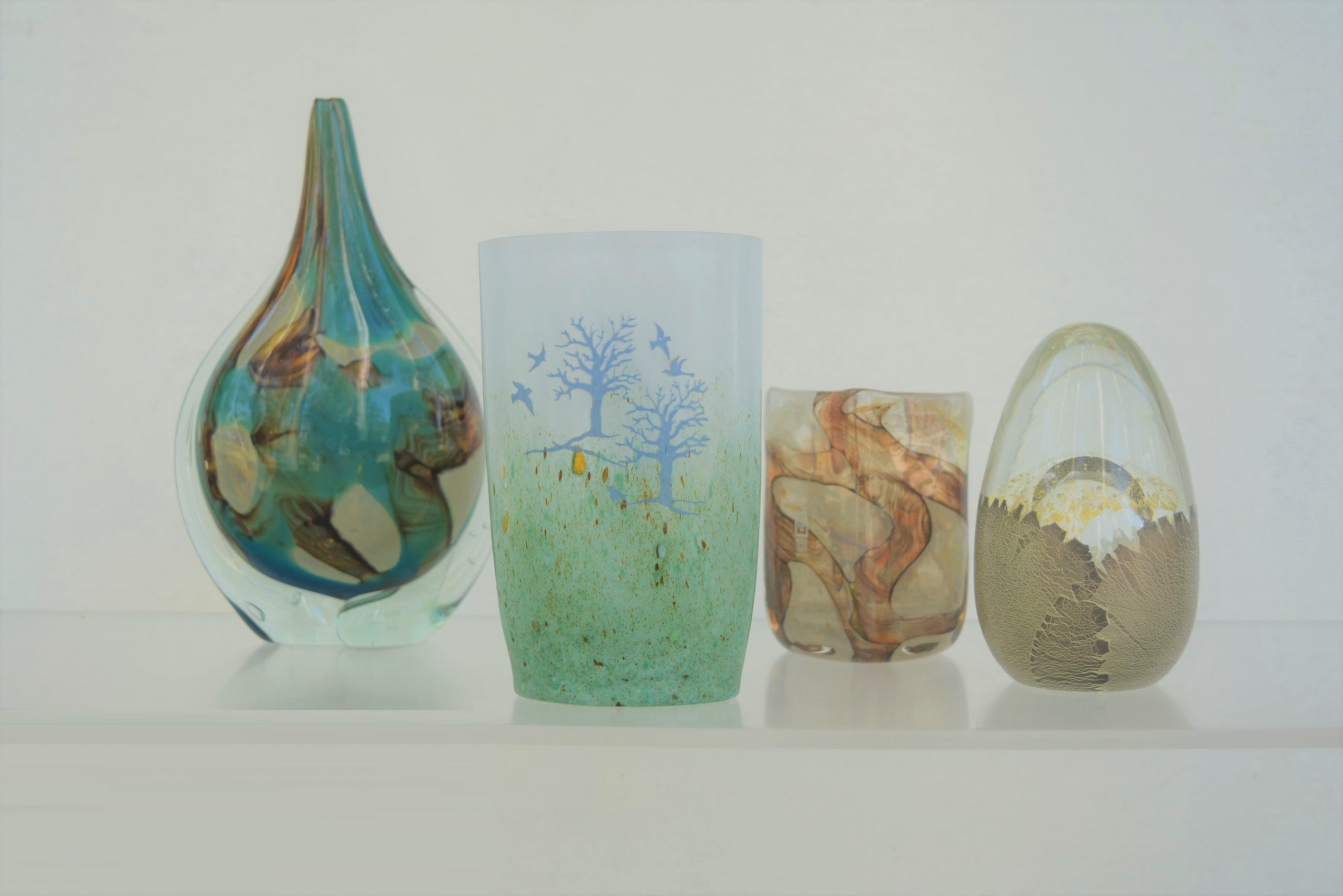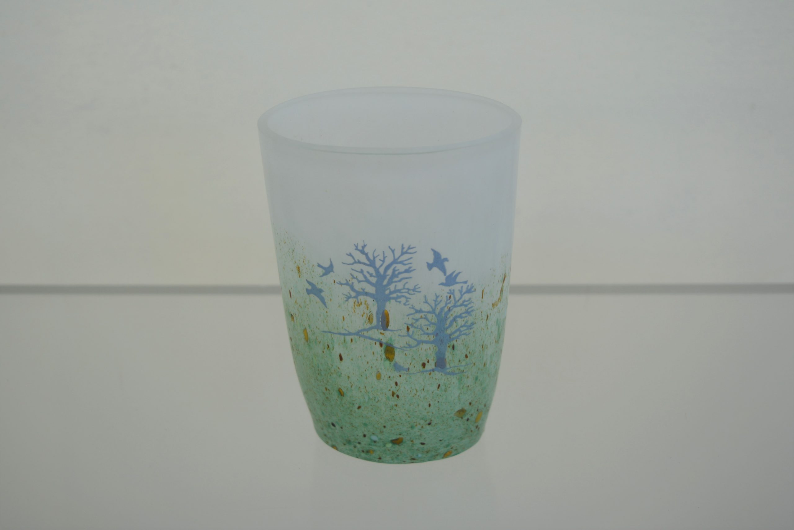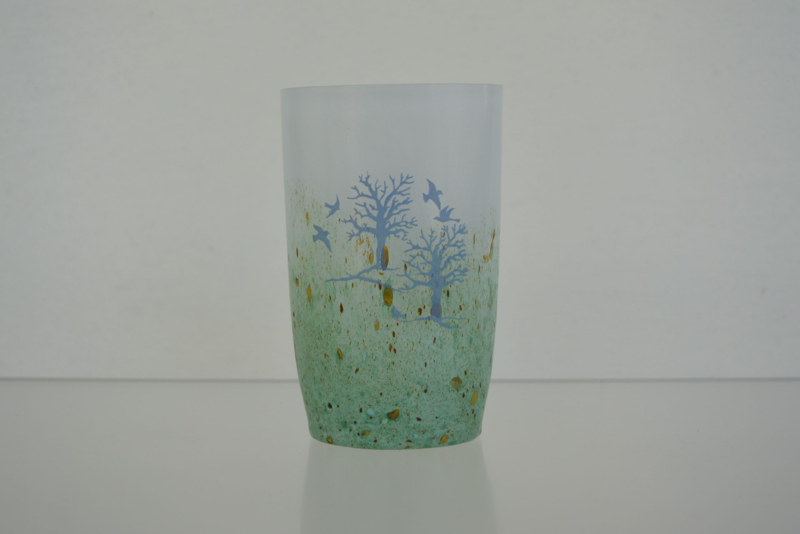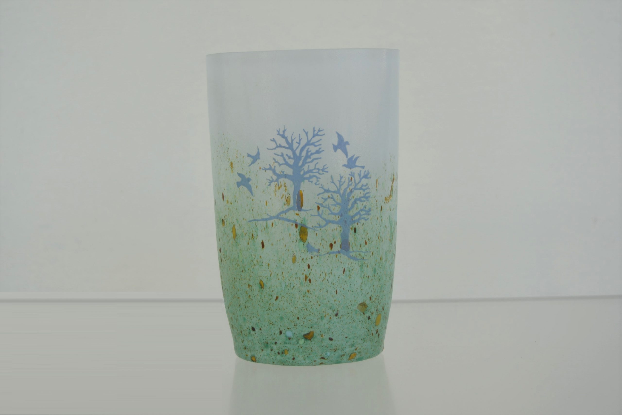 A Kosta Boda “October” Vase designed by Kjell Engman 1982. This is the medium size in this series standing 15cm in height (and 10cm across). None of the vases in this series are still available through Kosta Boda so they have strong collector appeal. Engman has captured the essence of Europe late in autumn so well in this piece. I love its “watery” feel. Everything is “washed out” lacking definition which gives it the feel of autumn. There is an impending starkness there as well with winter around the corner but the piece is still uplifting with birds taking flight.