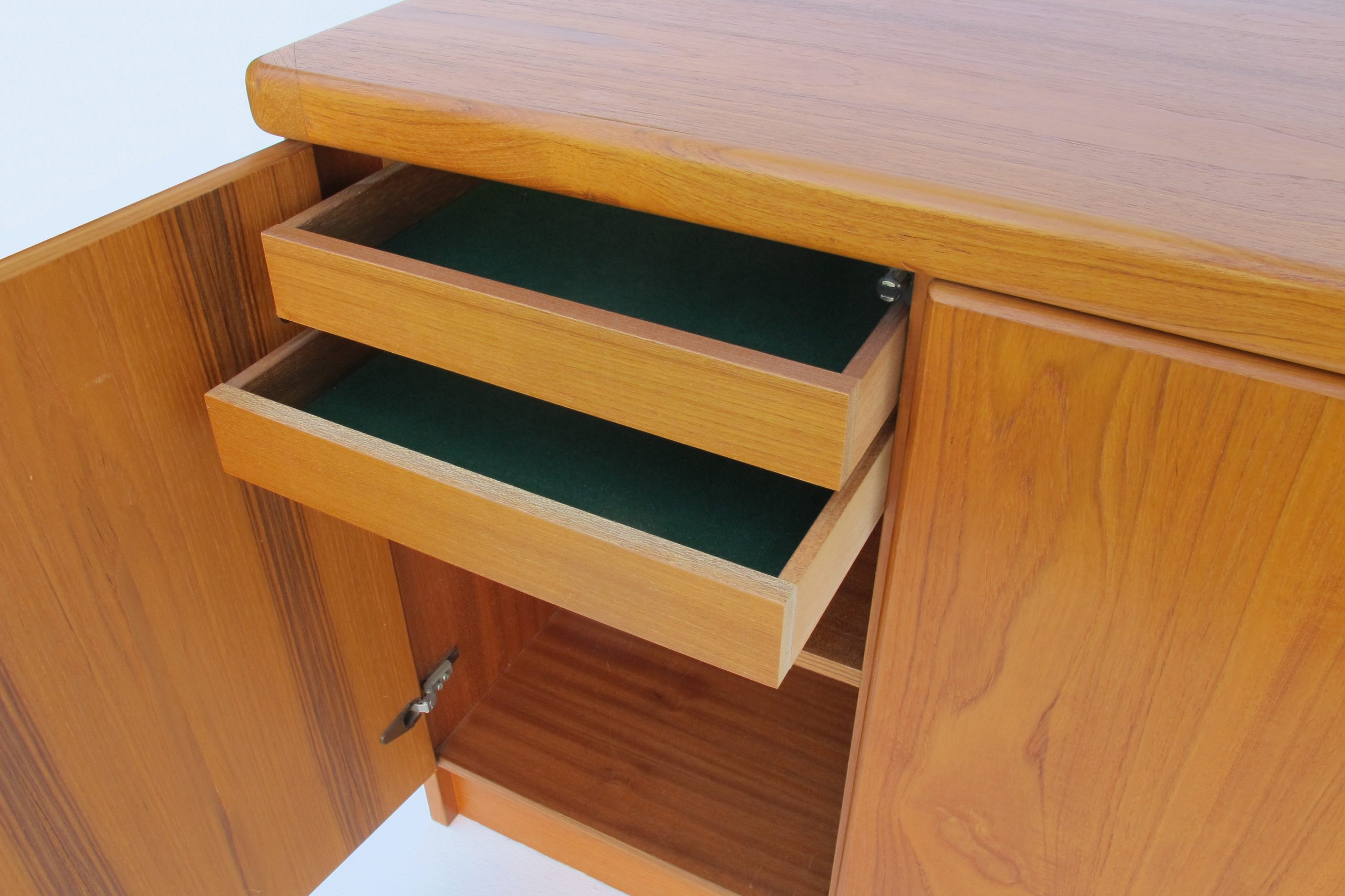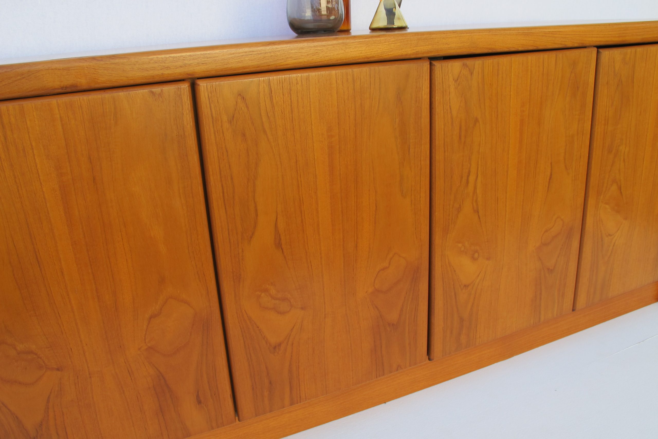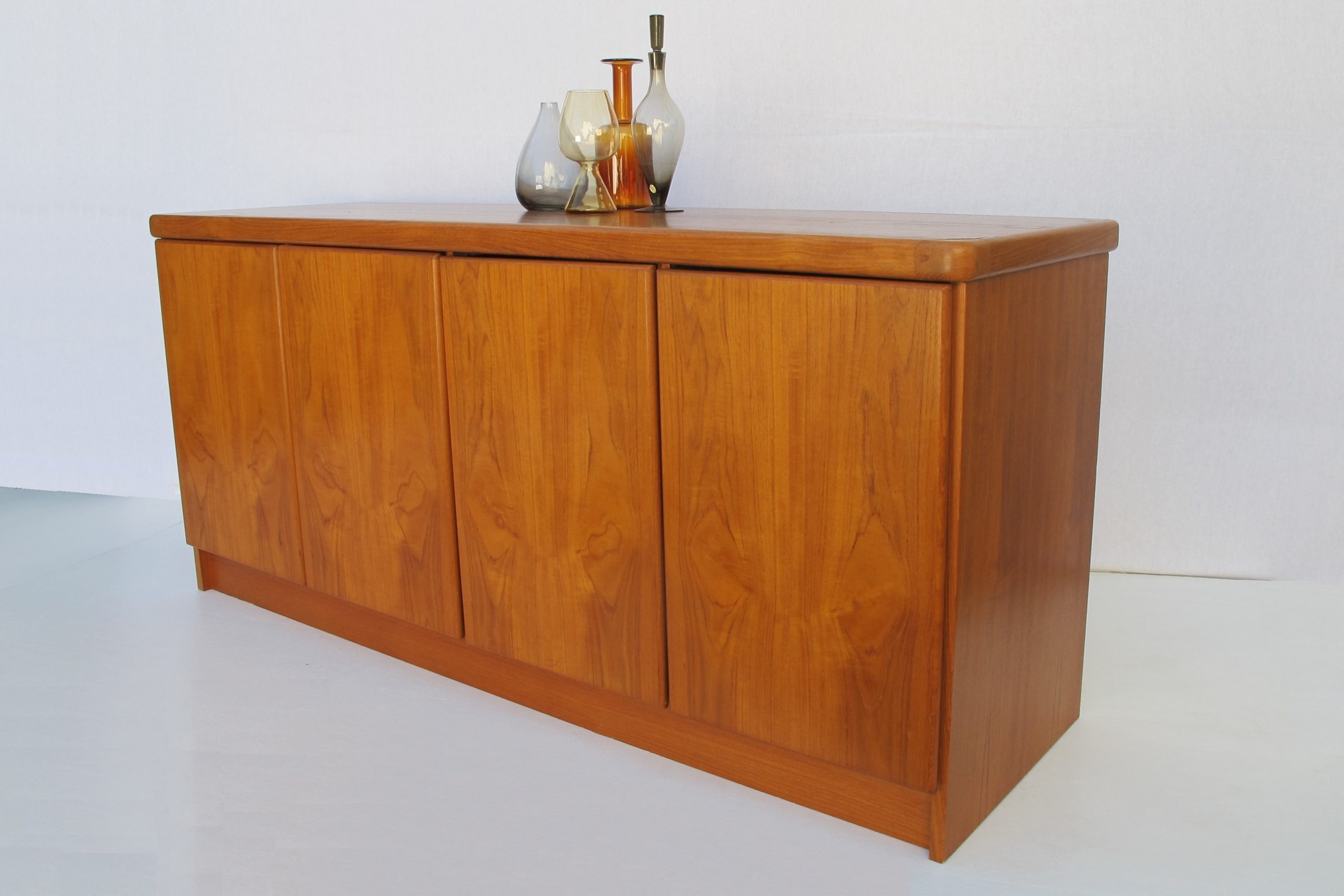 A tidy teak sideboard from the 1960’s. This would be ideal as a TV stand. It’s as minimalist as they come- great if you have a small space and want to eliminate clutter. It would also work as a minimalist storage piece in the bedroom or office. It’s visually unobtrusive yet it still makes a nice statement. The book-matching of the veneer is what I like most about it. The reflection in the timber patterning across the front is a symbol of quality and rarely seen. It gives the piece a subtle point of interest but keeps in line with the restrained styling. I’d say this is a Danish piece. It came with the Johannes Andersen chairs I just listed and the matching dining table. The Andersen chairs are top of the line and Danish. A lighted hutch also came with this lot of furniture and the plugs on the back were Scandinavian.
