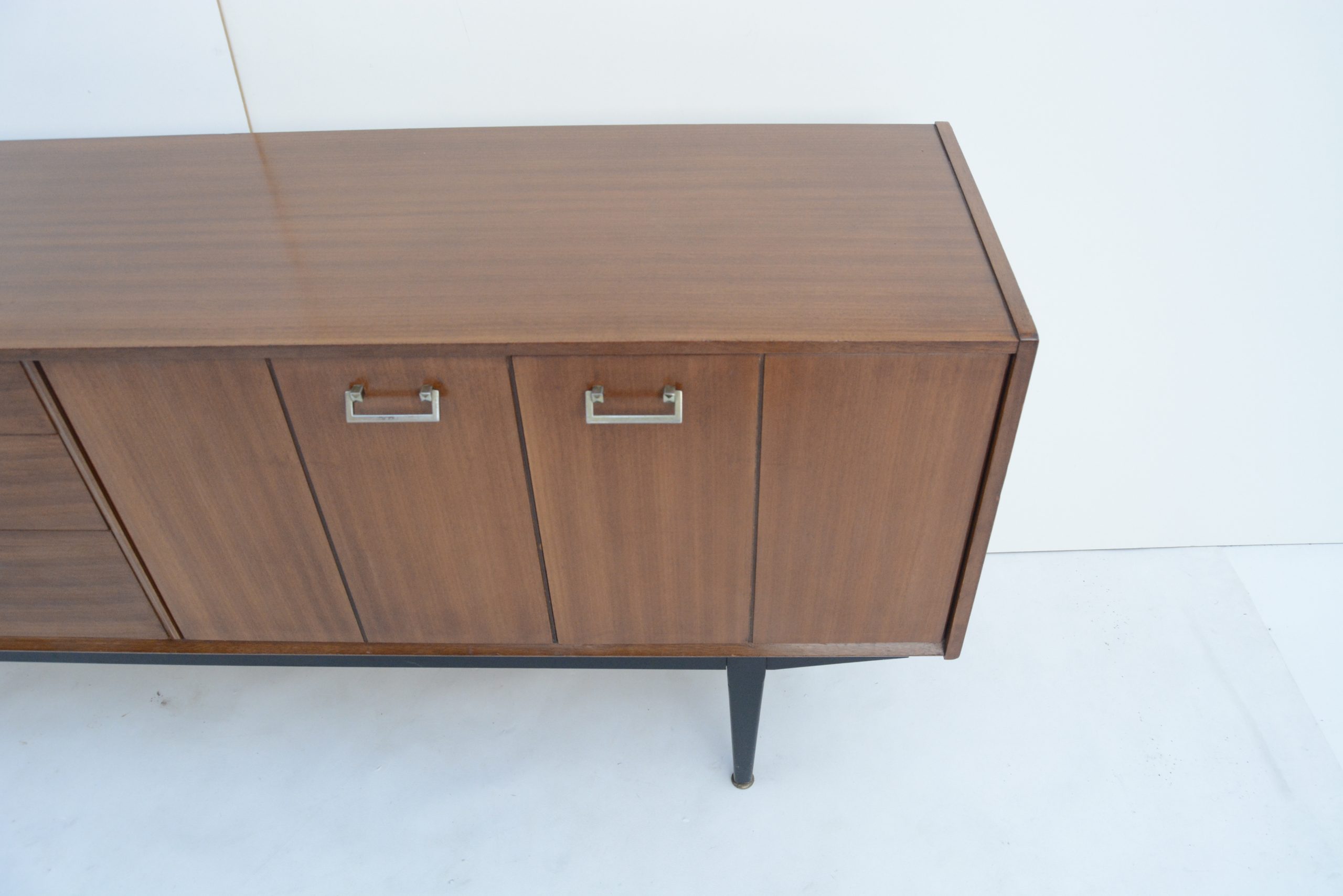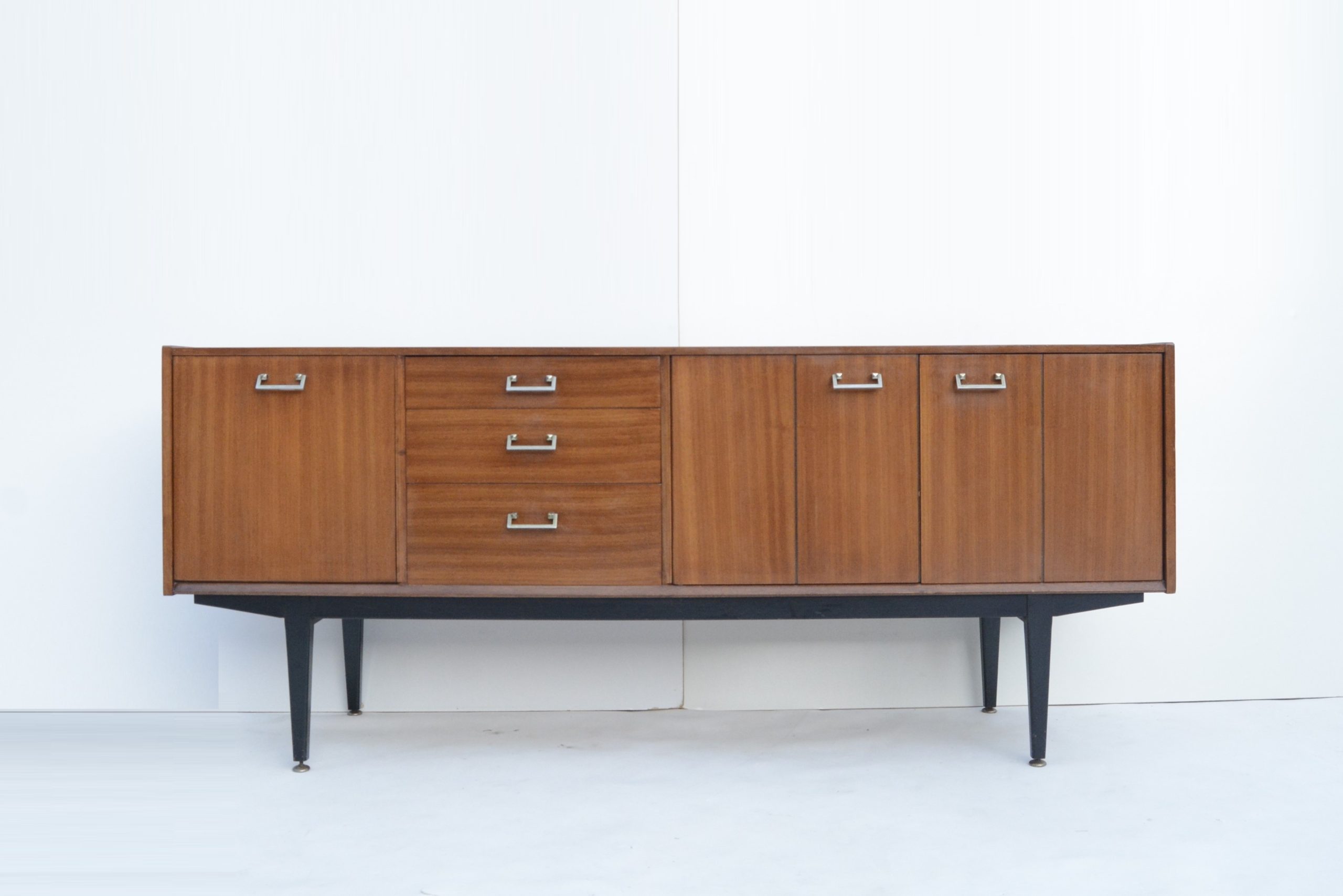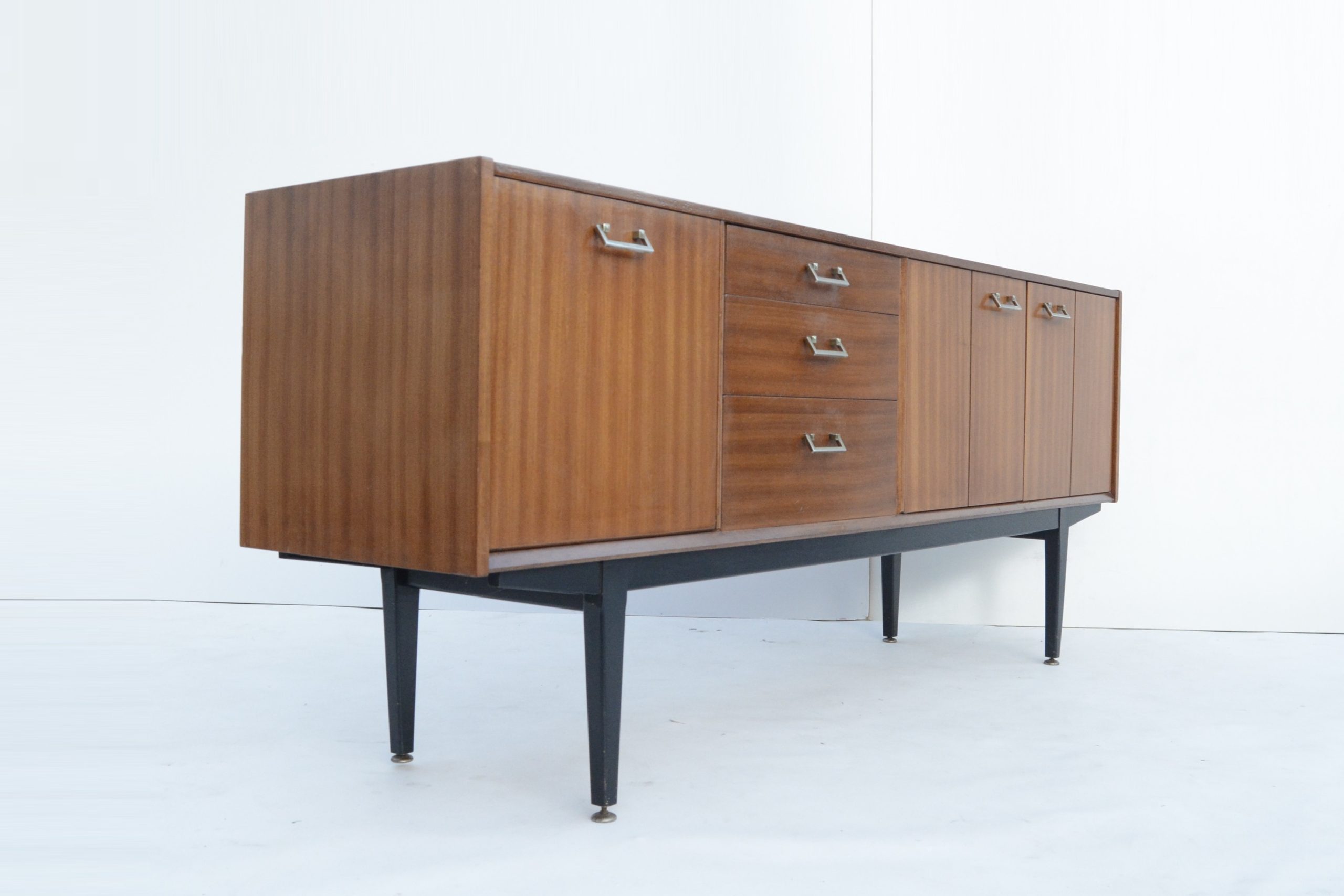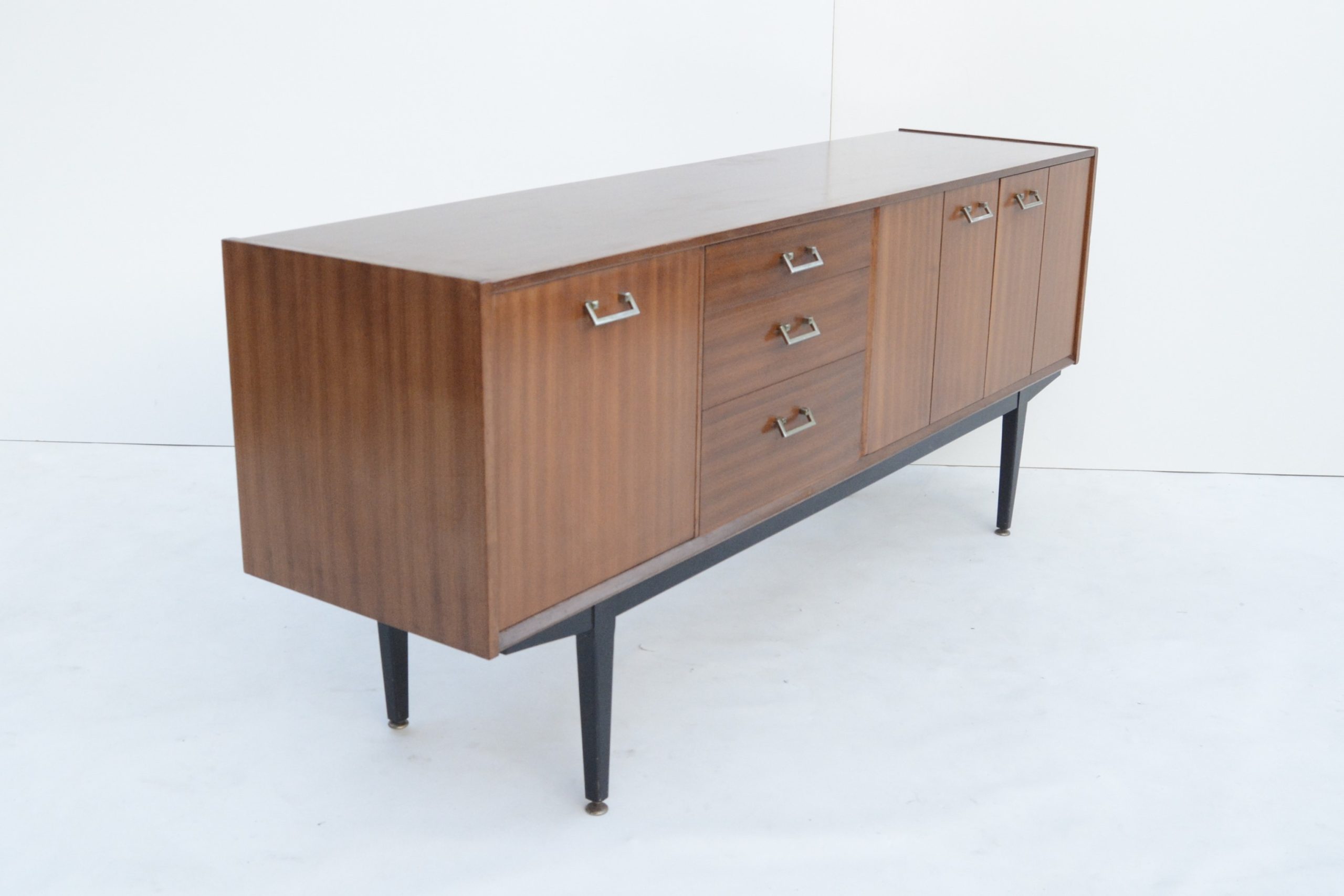 I love the black base. This accentuates the high elevation off the floor and the stylish elegance of the design. The design is minimalist and understated, with a couple of minor points of interest. The handles are also a smart choice- metal handles are the more expensive option and way-more durable. They also work really nicely with the design. The brass-ware on the ends of the feet is just as impressive and a sign of real quality. They rarely appear on sideboards of the era. They protect the ends of the legs from damage and also help balance the piece on uneven floors.