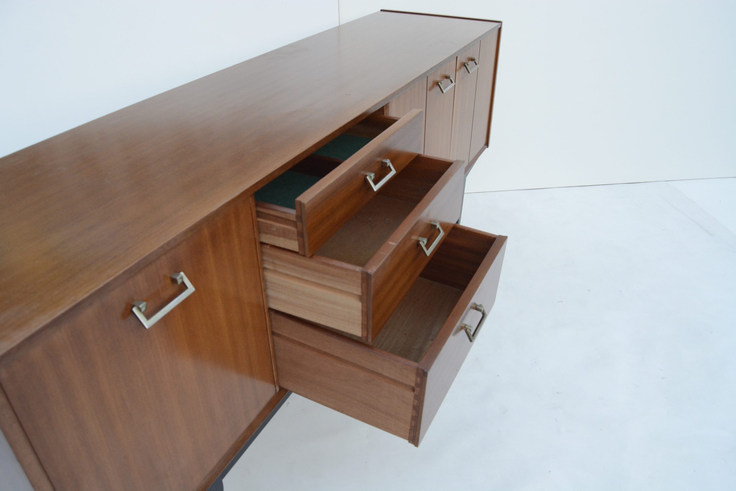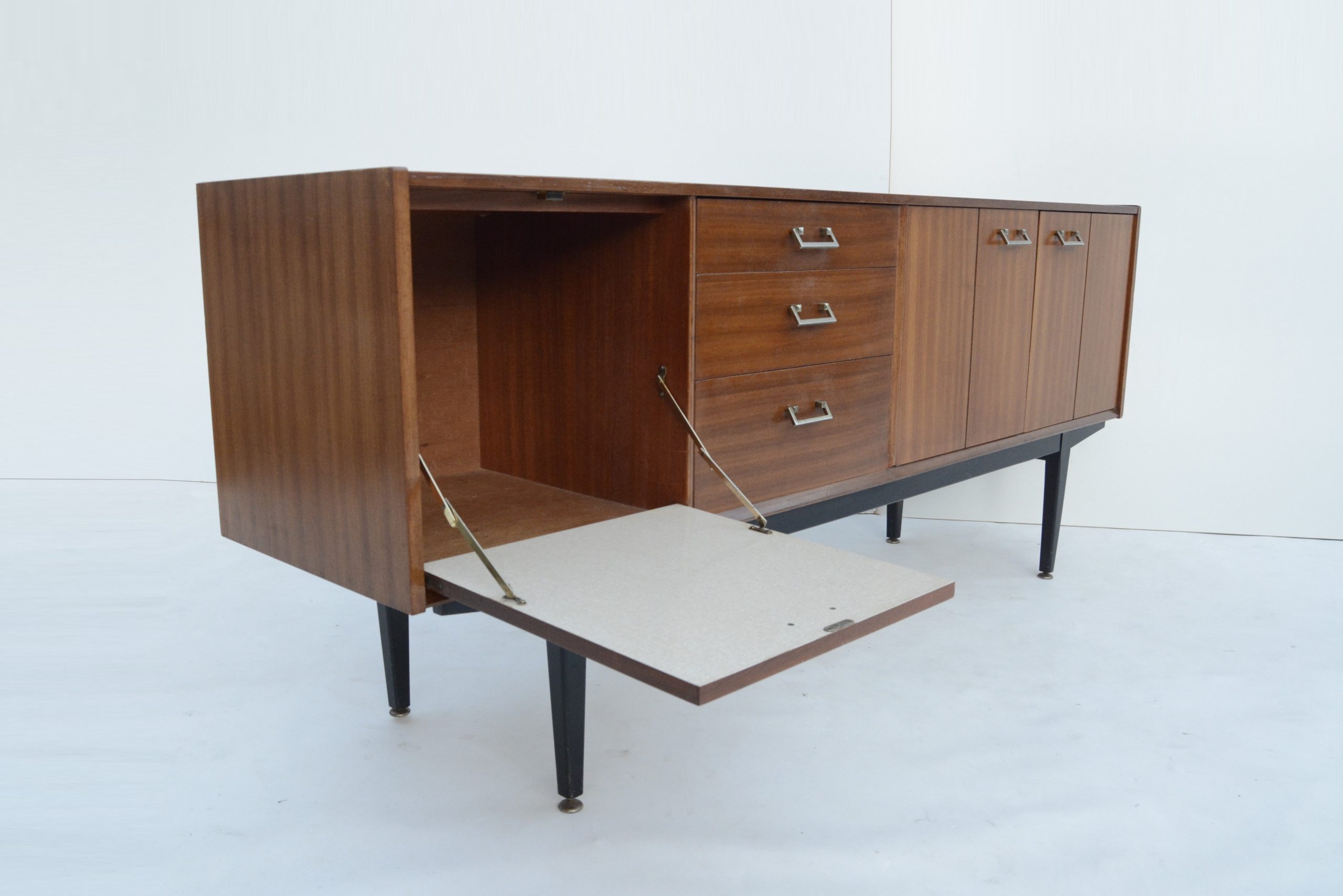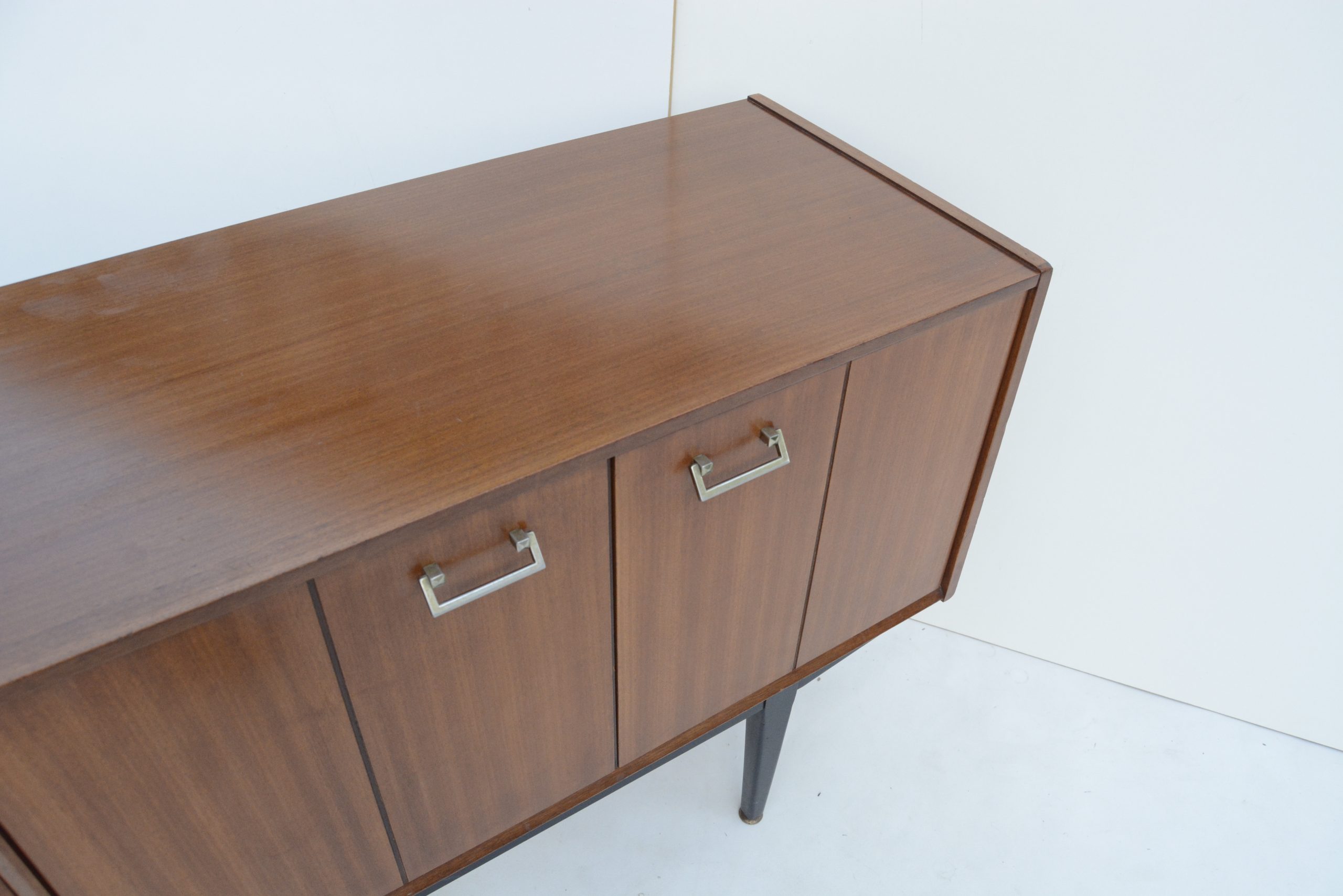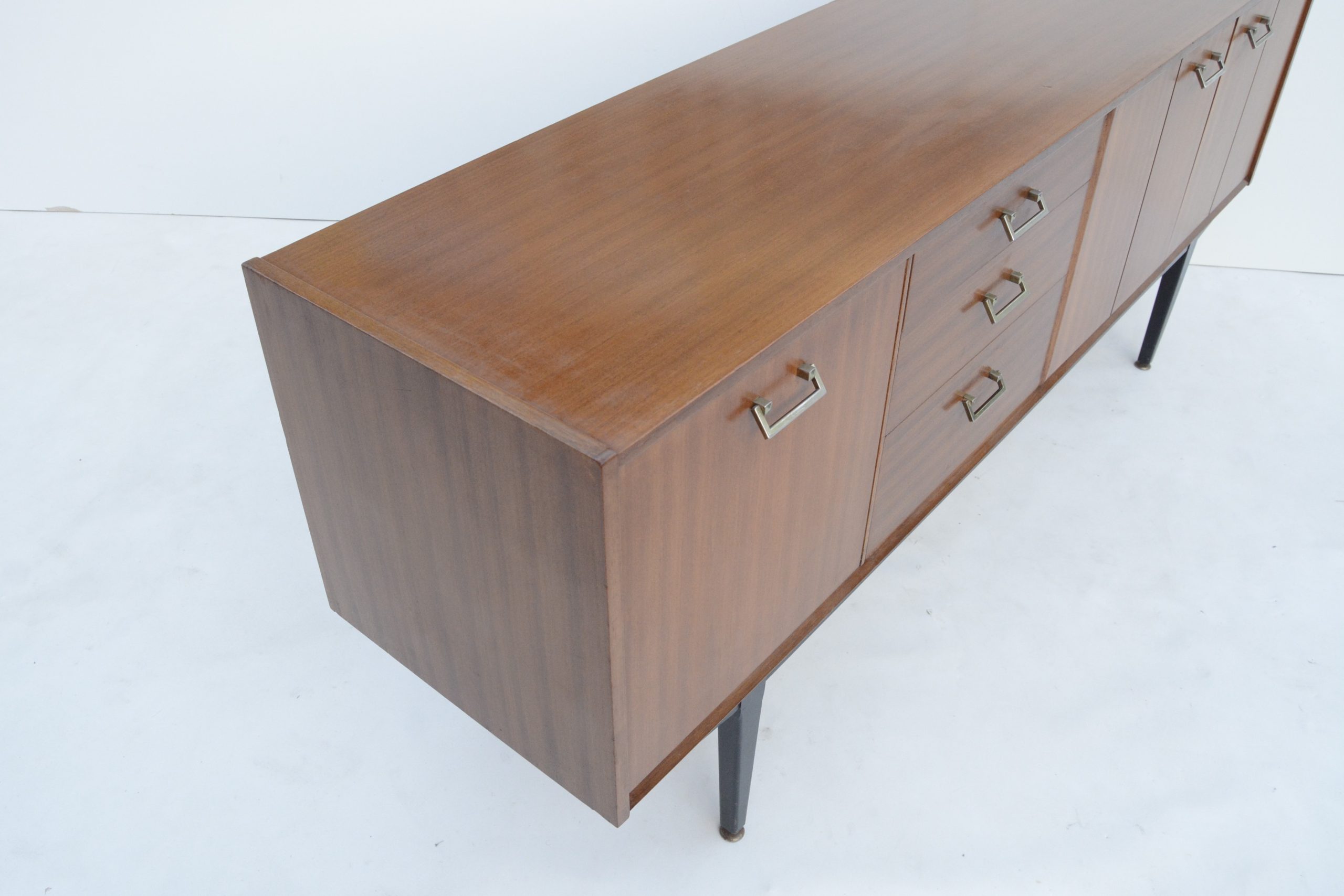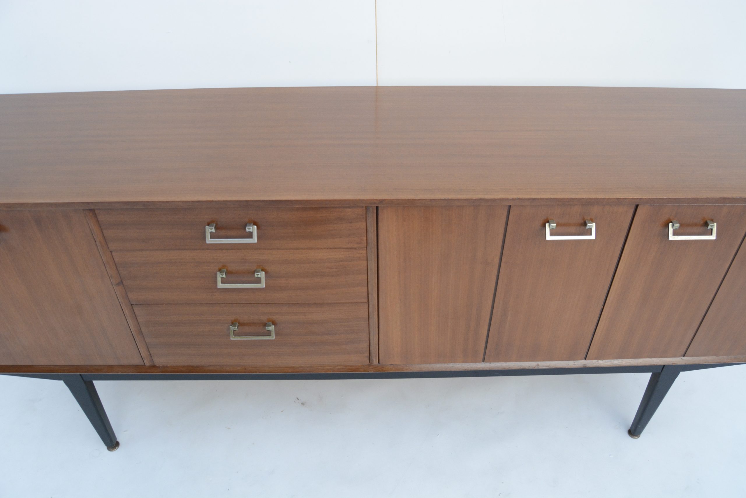 I love the black base. This accentuates the high elevation off the floor and the stylish elegance of the design. The design is minimalist and understated, with a couple of minor points of interest. The handles are also a smart choice- metal handles are the more expensive option and way-more durable. They also work really nicely with the design. The brass-ware on the ends of the feet is just as impressive and a sign of real quality. They rarely appear on sideboards of the era. They protect the ends of the legs from damage and also help balance the piece on uneven floors.