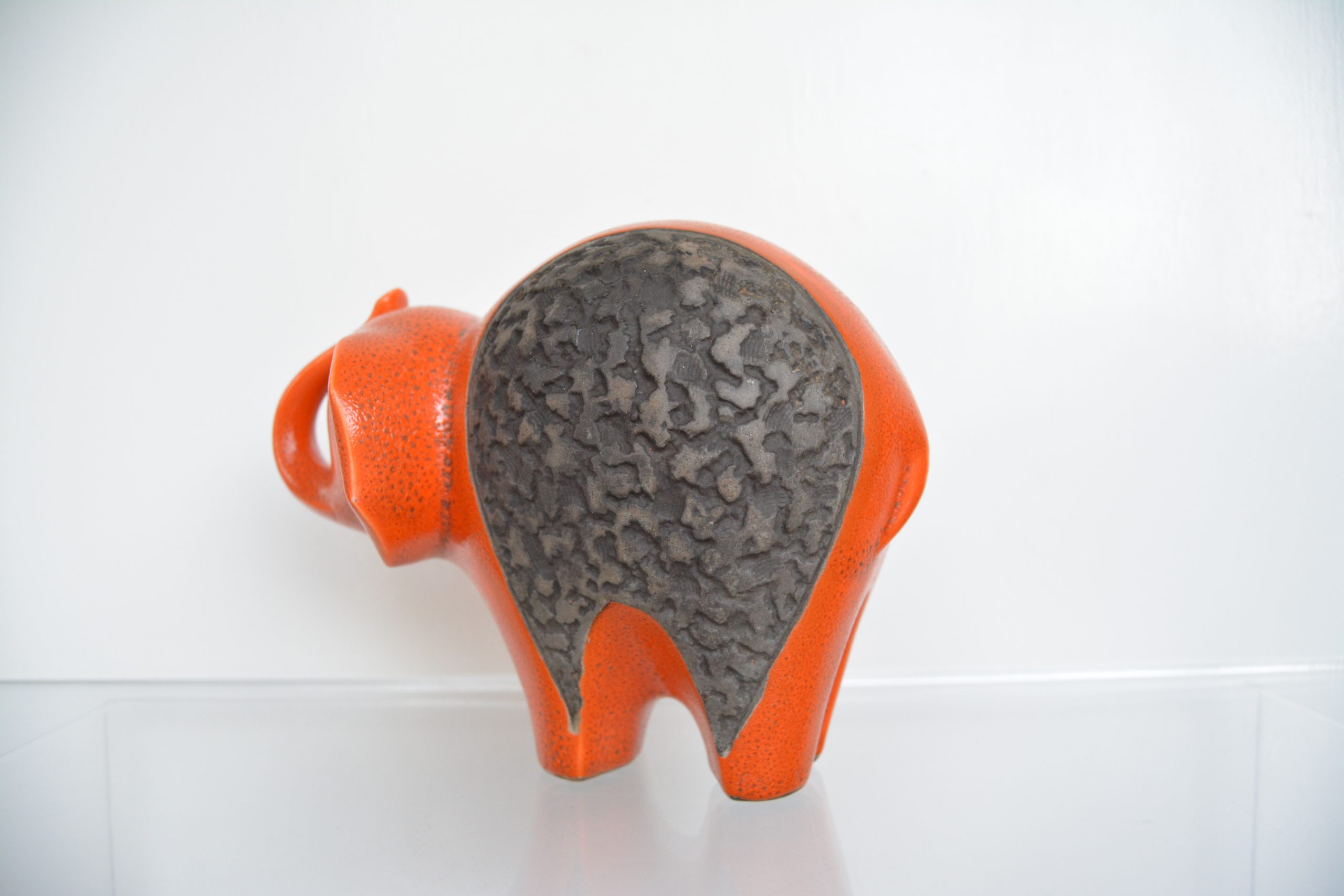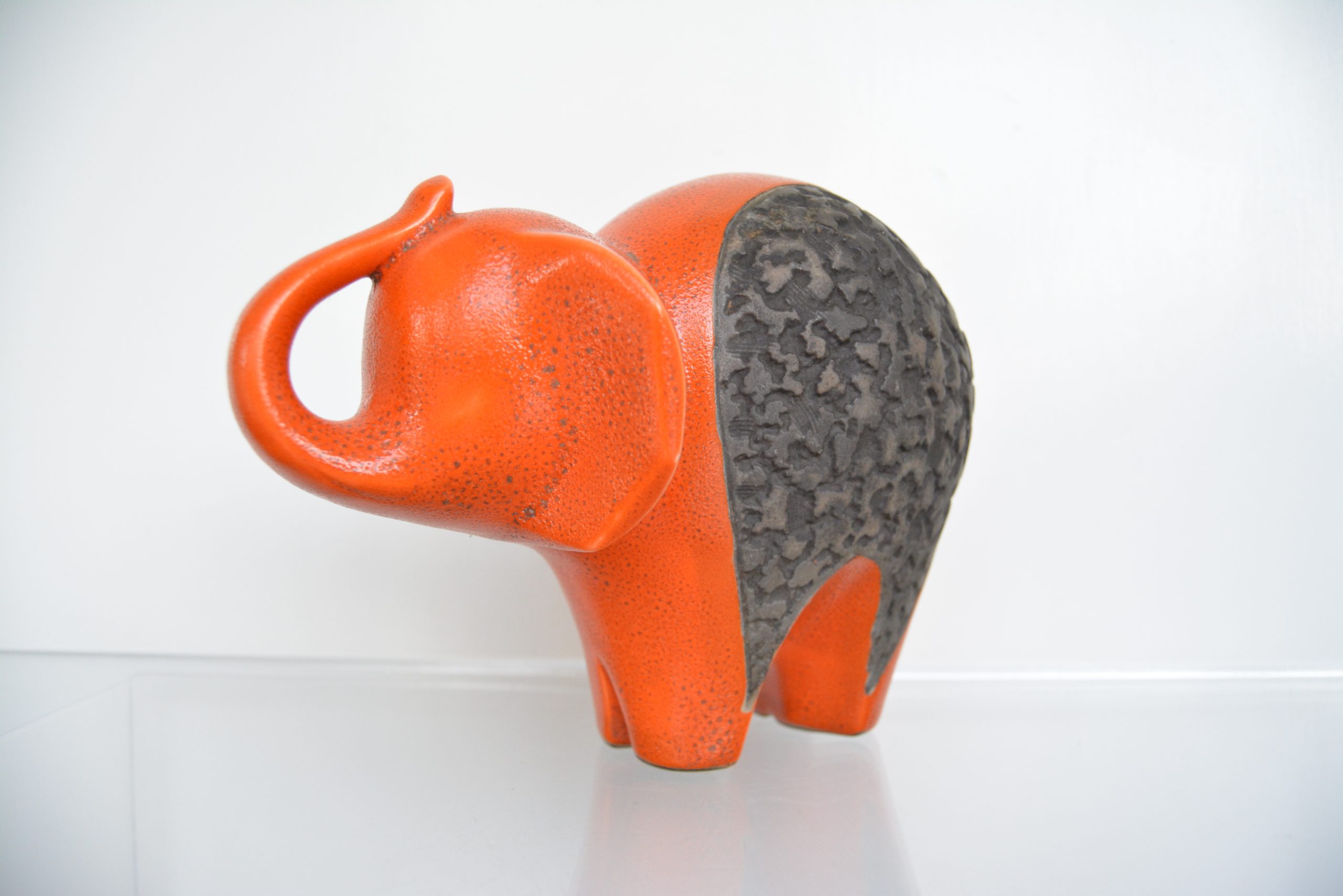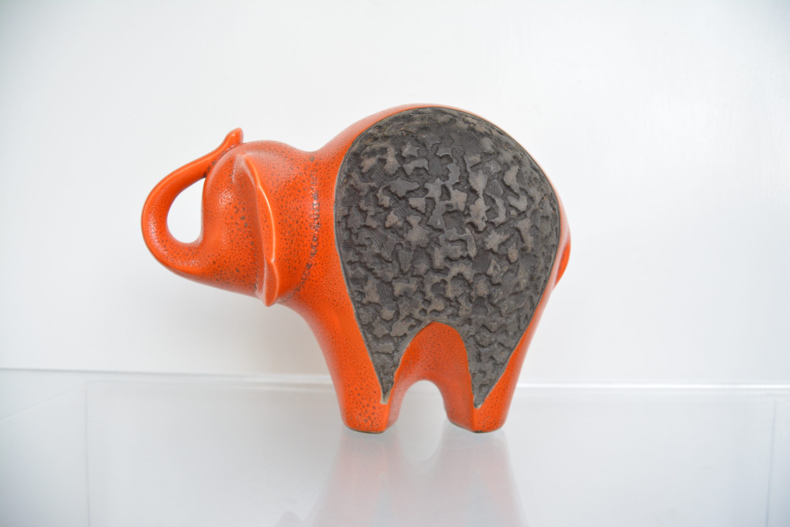 This design in orange is very rare. I’ve never seen another orange one before (not even in a photo). I love the shape (trunk up for prosperity too!) and the vibrant colouring contrasting with the textured, unglazed section in the middle. This piece draws you in immediately and would nestle brilliantly in a retro-inspired interior.