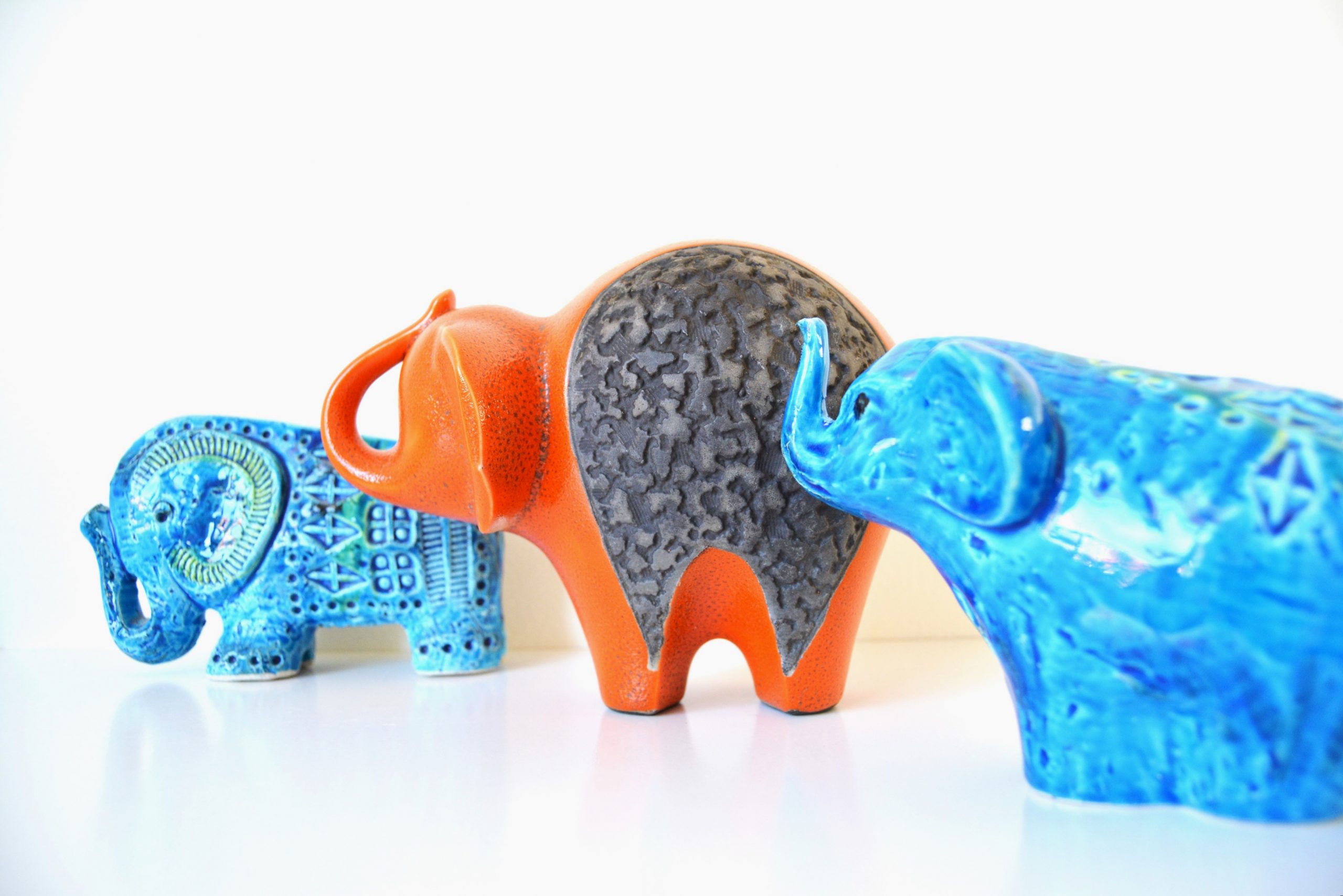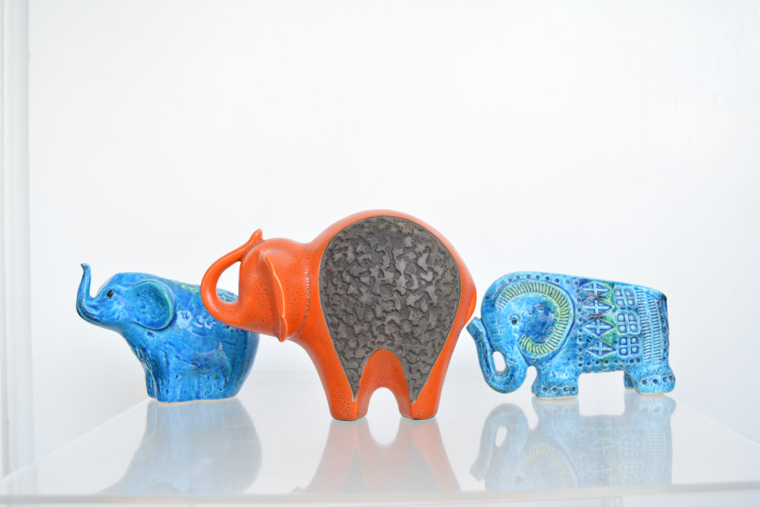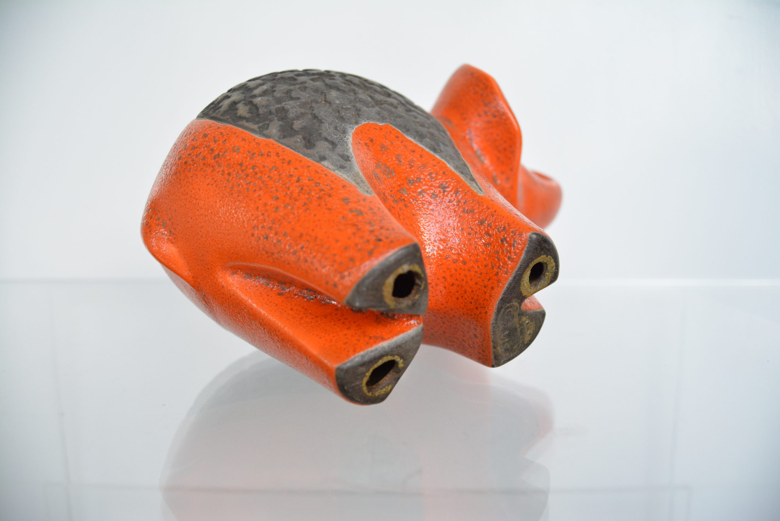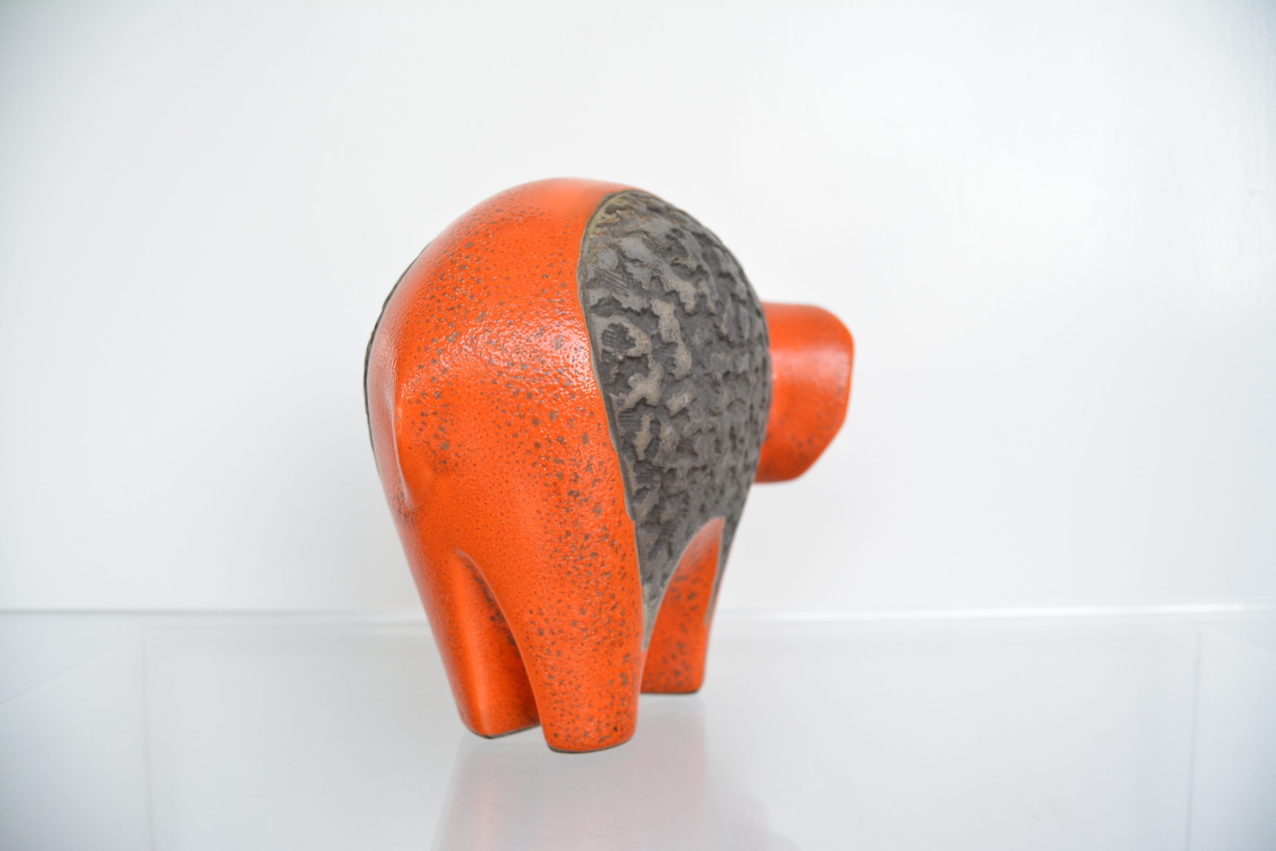 This design in orange is very rare. I’ve never seen another orange one before (not even in a photo). I love the shape (trunk up for prosperity too!) and the vibrant colouring contrasting with the textured, unglazed section in the middle. This piece draws you in immediately and would nestle brilliantly in a retro-inspired interior.