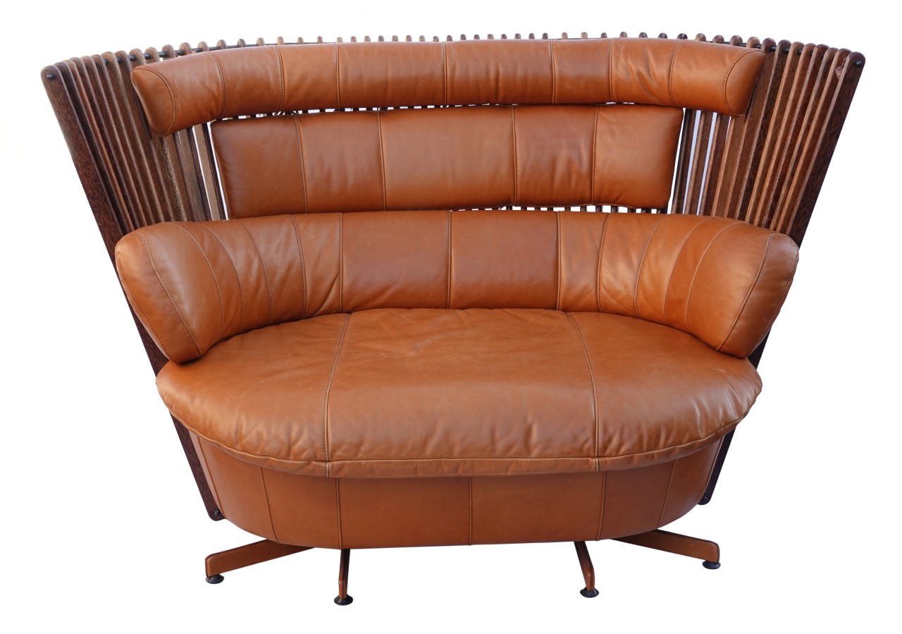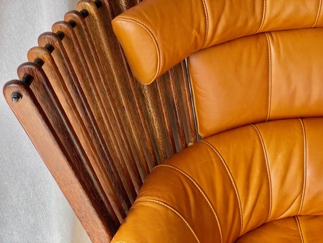 As the Pacific Green star continues to rise on an international platform, this vintage sofa will only become more collectable in future years- 2-seater Tavarua sofas are virtually non-existent. This leather is top-quality and in this colour, suits the design perfectly. Black in this design is quite bold- this cognac coloured leather softens the design and creates a warm, earthy look (but still with a distinct designer edge).